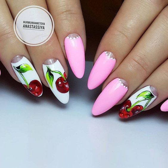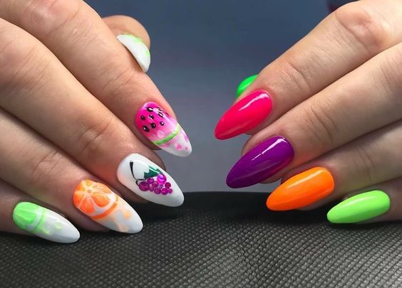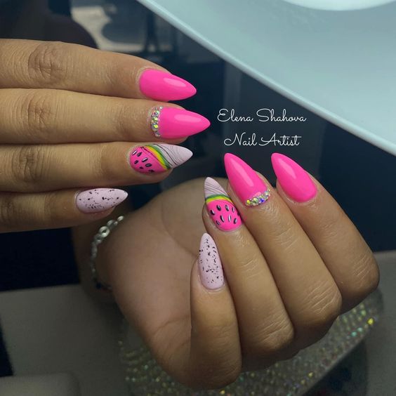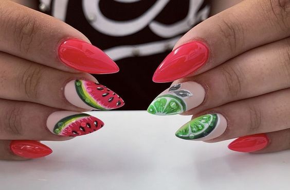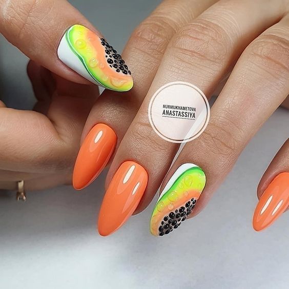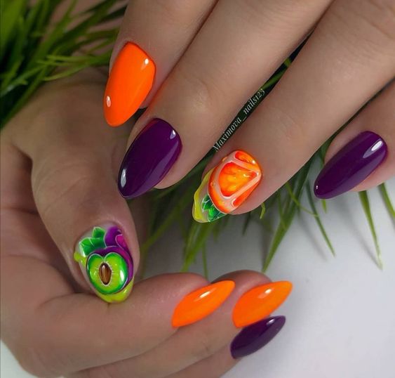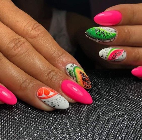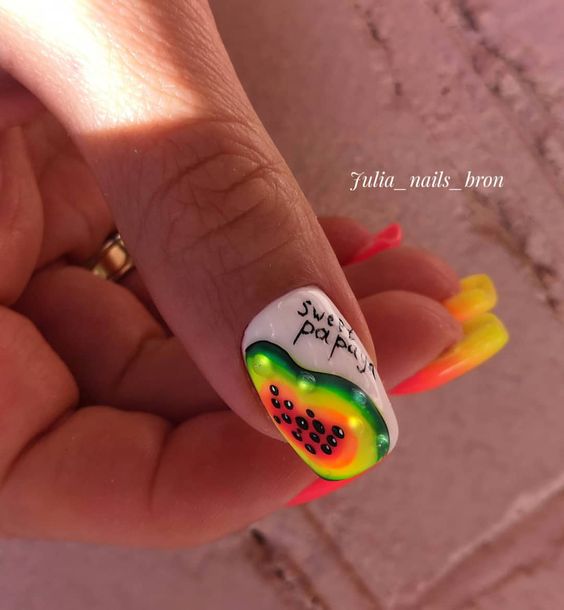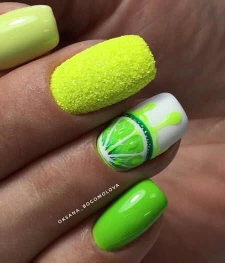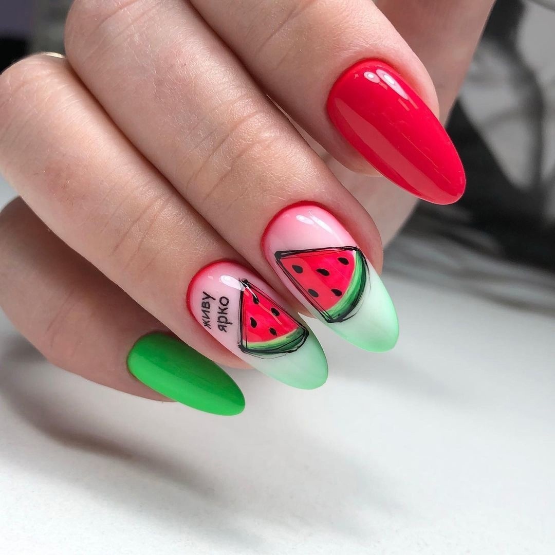 Если от цветов вы уже устали, обратите внимание на фруктовый дизайн. Тем более, что август — месяц, когда ягод и фруктов в избытке. Рисуйте все, что нравится — клубнику, лимоны, арбузы или какие-то экзотические фрукты. Главное — выбирайте акцентный ноготь, если рисунок будет большим. В противном случае маникюр получится слишком чрезмерным. А вот в том случае, если вы используете маленький рисунок (кистью, стемпинг или наклейки), оформить в таком стиле можно все ноготки. Но базу в этом случае стоит выбрать нейтральной. Идеально — молочная полупрозрачная.