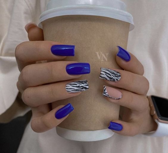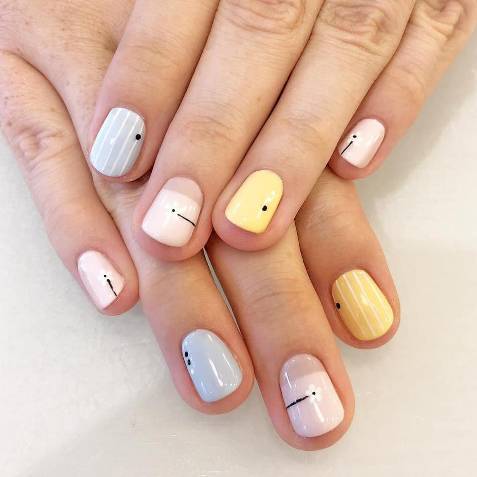- полосатый нейл арт. Это отличный вариант. если вы планируете сделать ногтевую пластину визуально длиннее и изящнее. В этом случае нужно, чтобы полоски располагались на ногте вертикально, а не горизонтально. Особенно актуален маникюр с прозрачным или молочным базовым покрытием, поверх которого расположены полоски разной толщины черного, синего или розового оттенков;