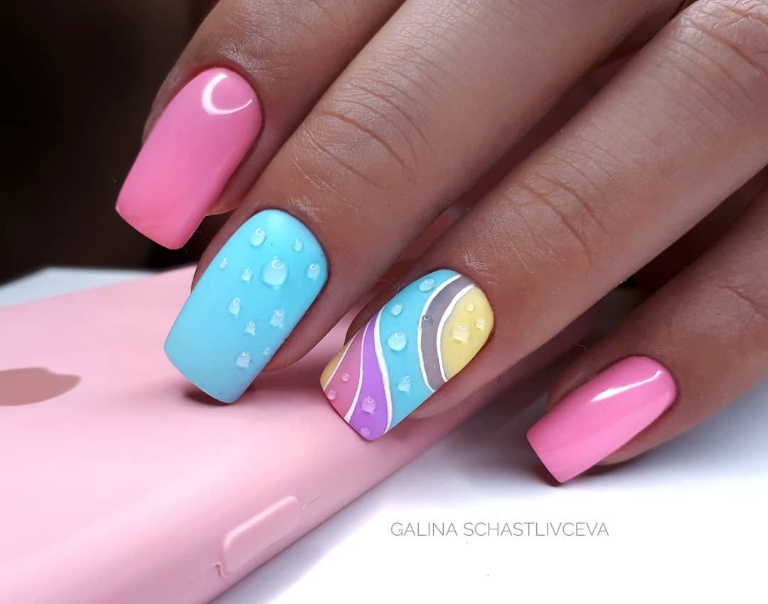 Август может выдаться очень жарким месяцем, но не стоит забывать, что это дверь в осень. Это период, когда часто идет дожди, поэтому актуальным становится маникюр с капельками. Кстати, делают их с помощью прозрачного топа. Но если вам не нравится идея с капельками, обратите внимание, что почти любой рисунок с помощью подобной техники можно сделать объемным. Просто постарайтесь нанести топ на картинку, следуя ее форме.