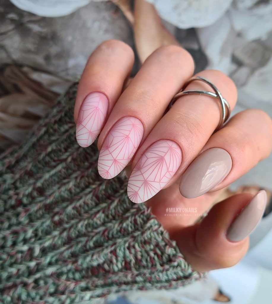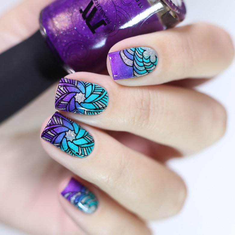Совет: в этом сезоне мастера рекомендуют обратить внимание на многослойный стемпинг дизайн. Он подразумевает послойное нанесение рисунка с укрыванием каждого слоя полупрозрачной базой. Получается эффект глубины и многослойности. Это отличный вариант для маникюра в августе.
