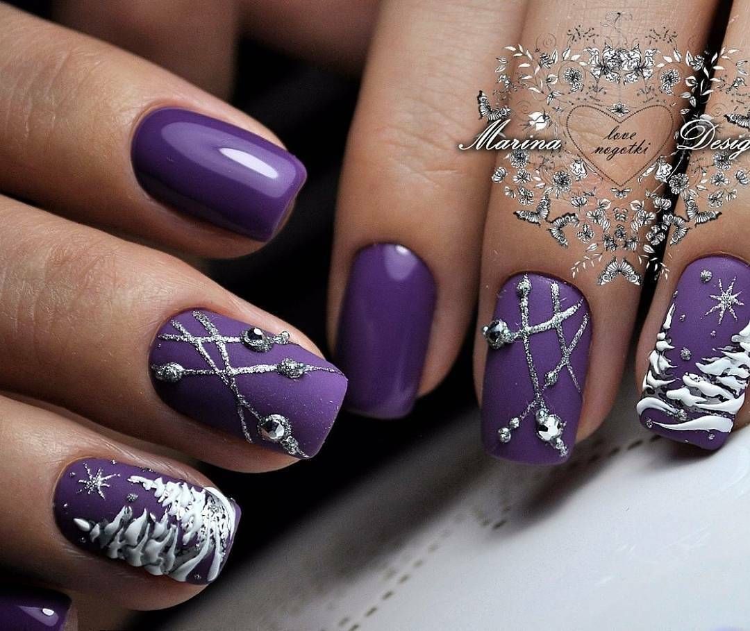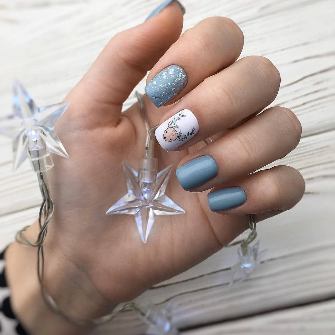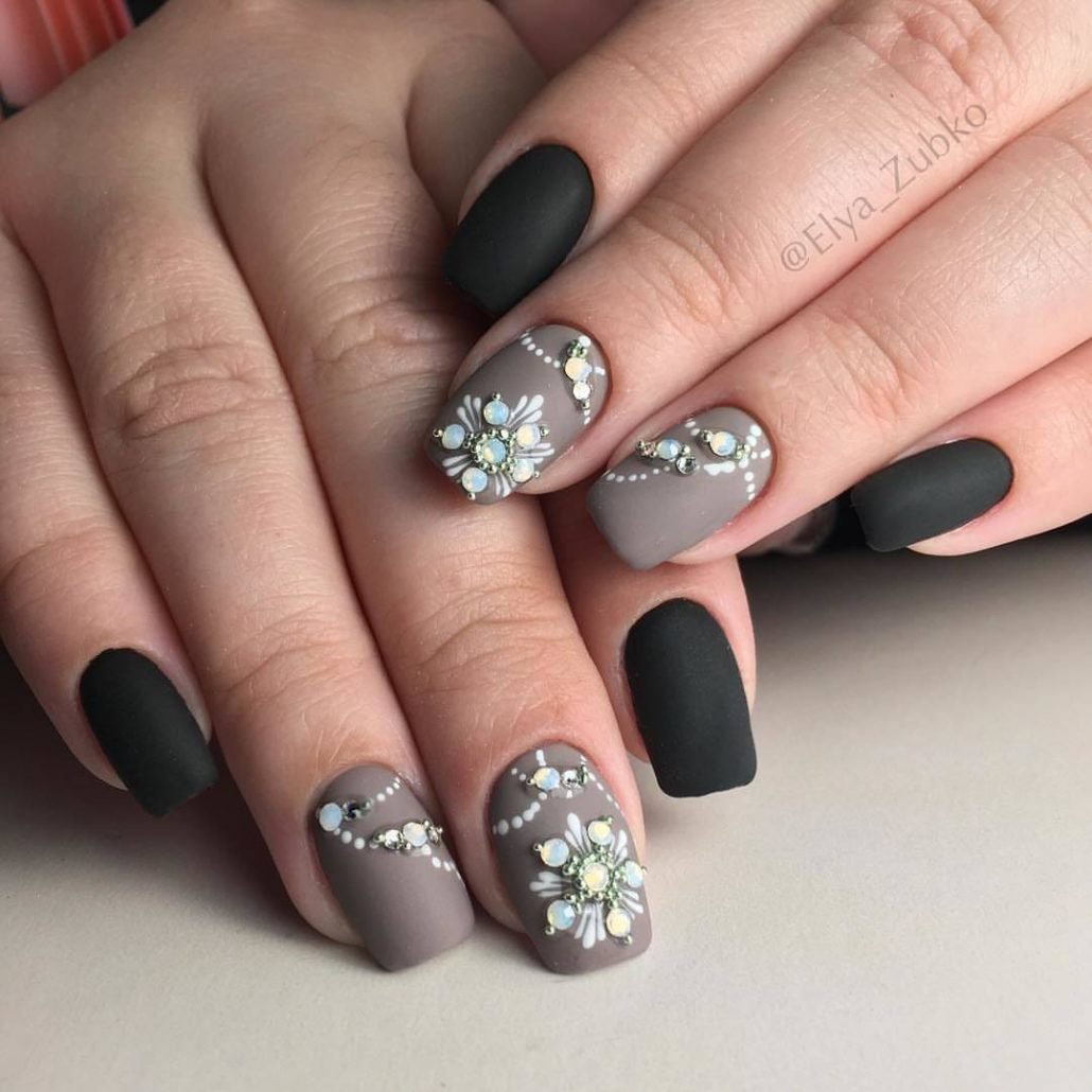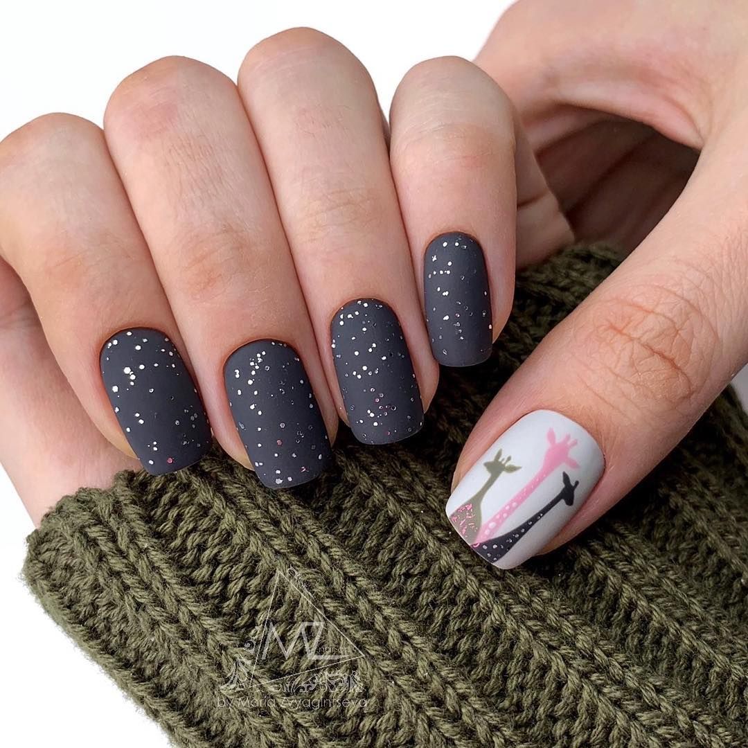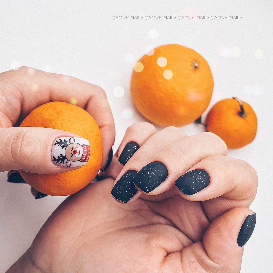 Для матового маникюра лучше выбирать спокойные оттенки лака. Для декабря это синий, оливковый, черный или нюдовый. А вот декор может быть любым. Главное условие — уместность.
