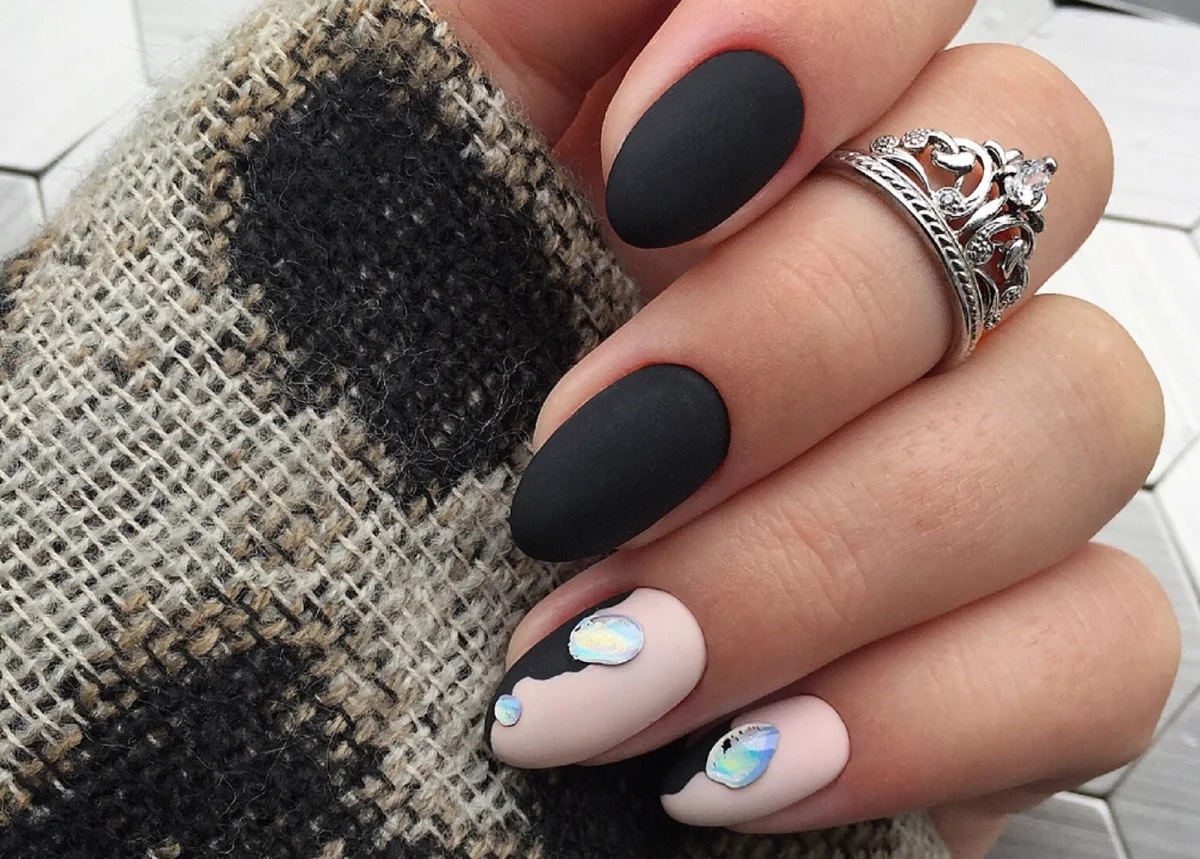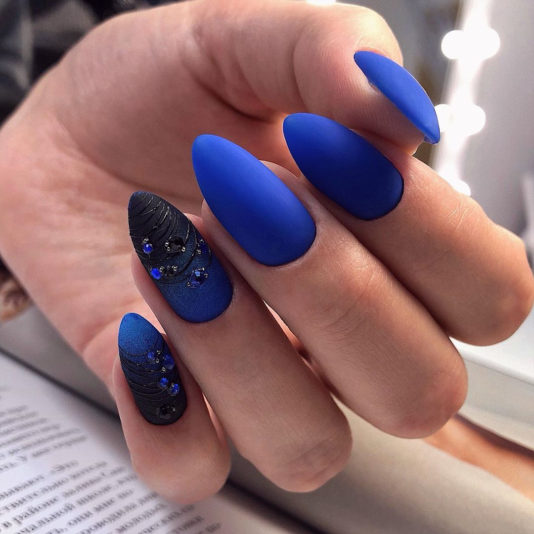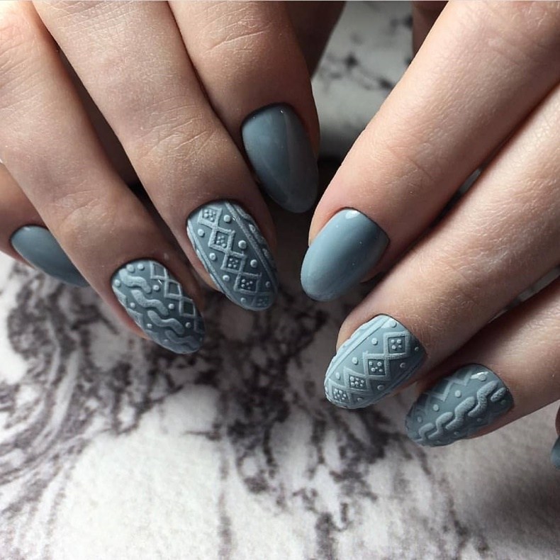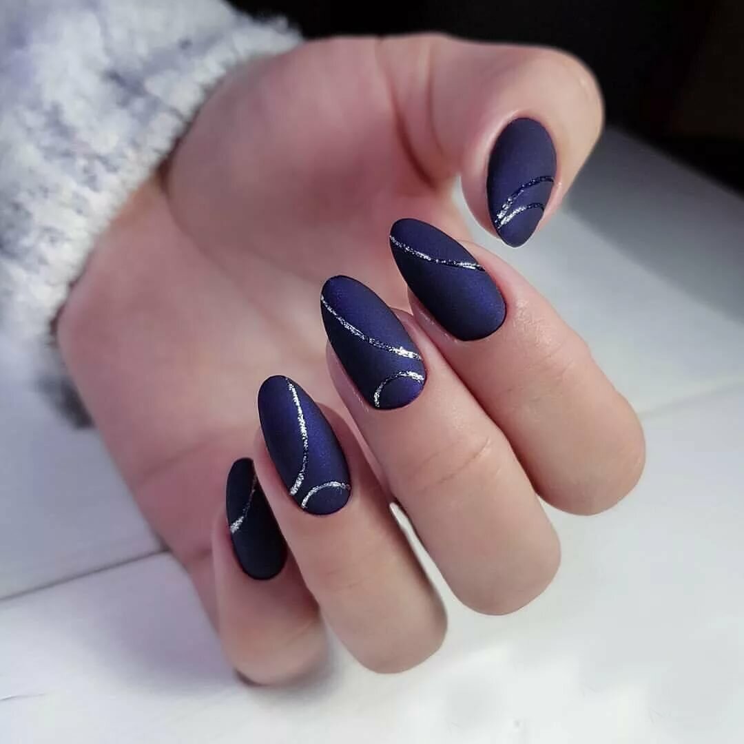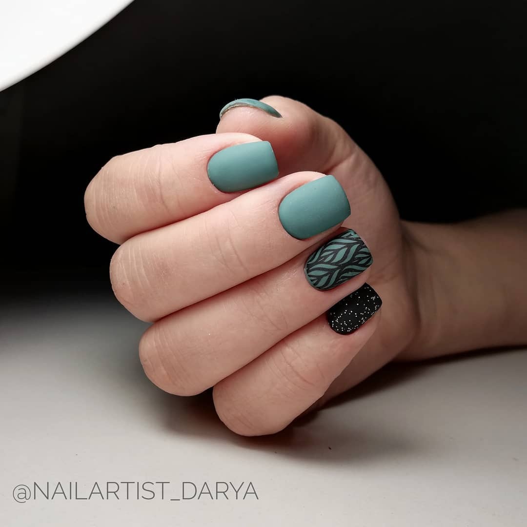 Для матового маникюра лучше выбирать спокойные оттенки лака. Для декабря это синий, оливковый, черный или нюдовый. А вот декор может быть любым. Главное условие — уместность.