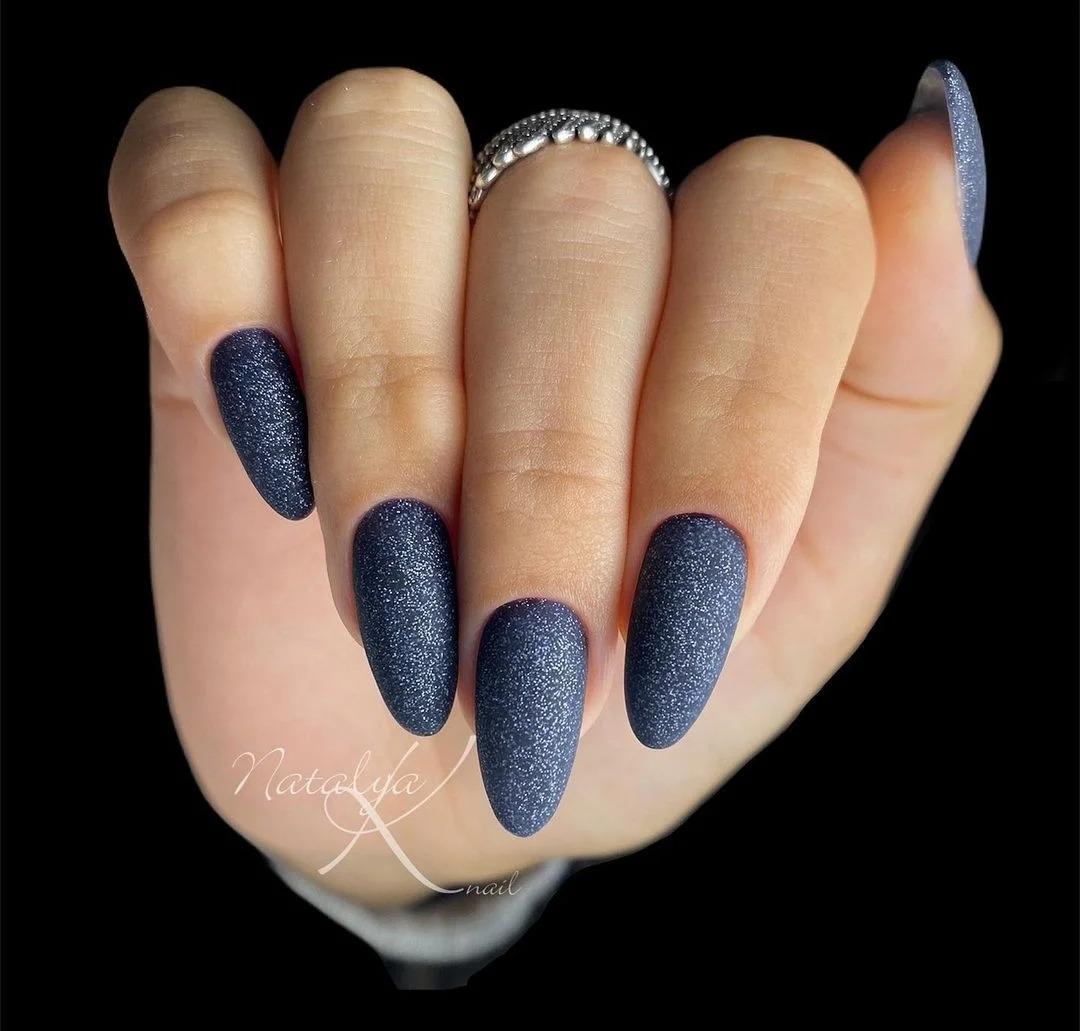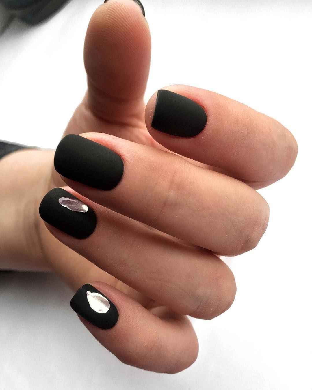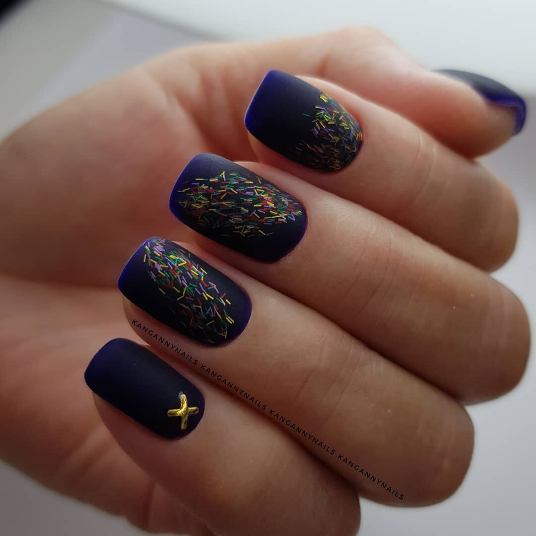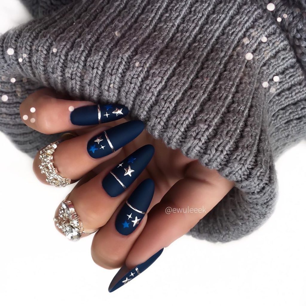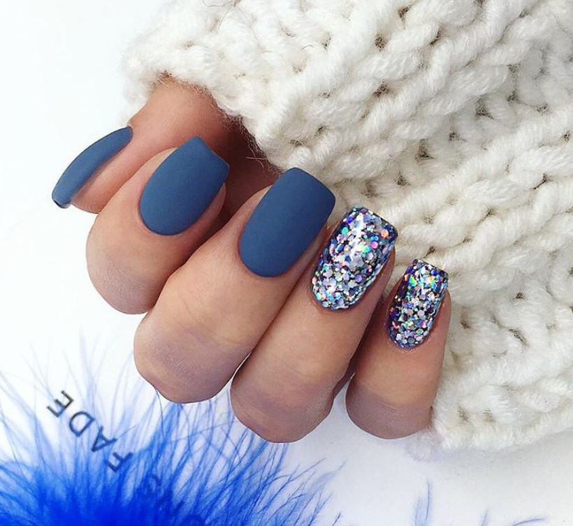 Для матового маникюра лучше выбирать спокойные оттенки лака. Для декабря это синий, оливковый, черный или нюдовый. А вот декор может быть любым. Главное условие — уместность.