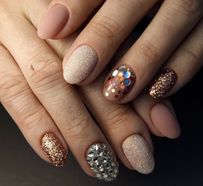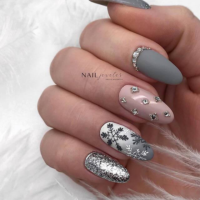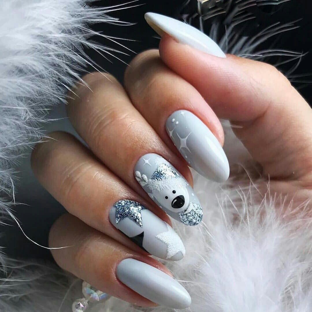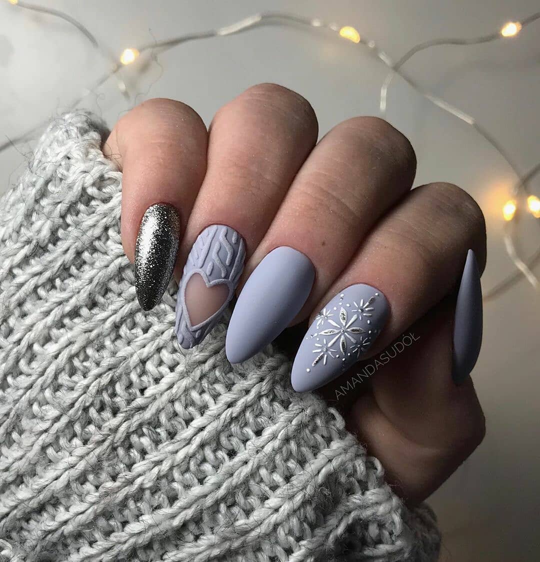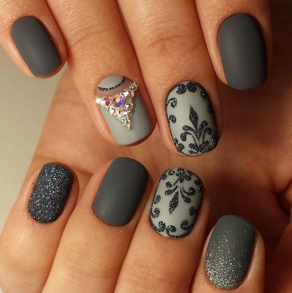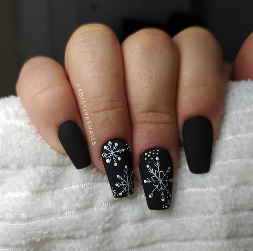 Для матового маникюра лучше выбирать спокойные оттенки лака. Для декабря это синий, оливковый, черный или нюдовый. А вот декор может быть любым. Главное условие — уместность.