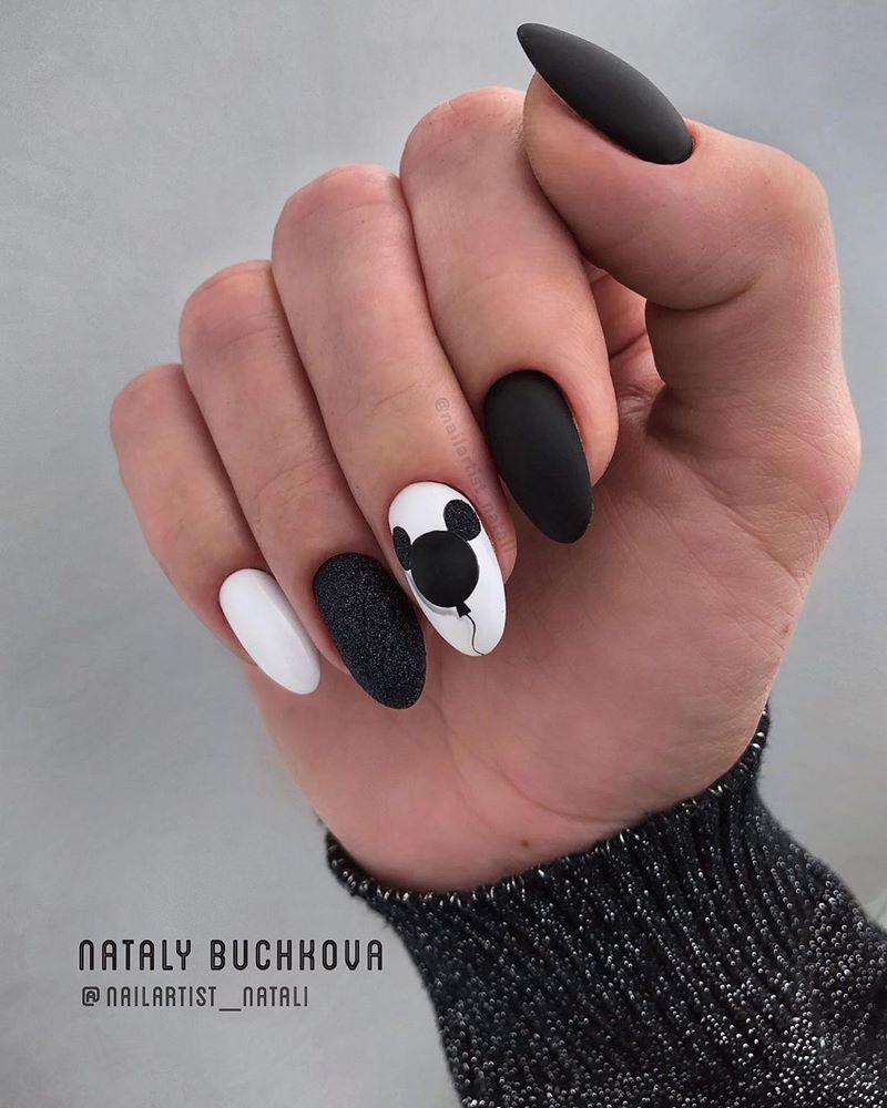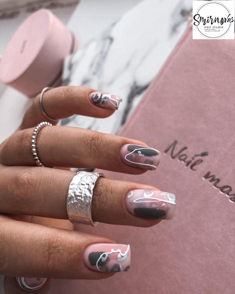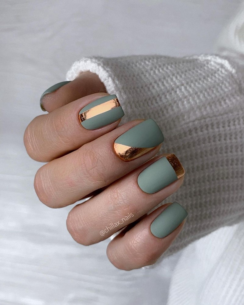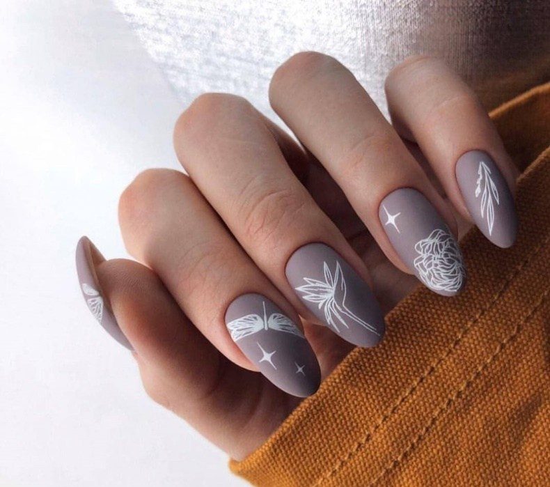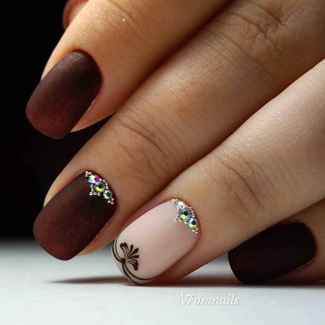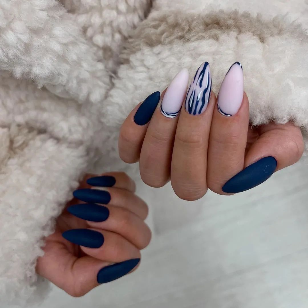 Для матового маникюра лучше выбирать спокойные оттенки лака. Для декабря это синий, оливковый, черный или нюдовый. А вот декор может быть любым. Главное условие — уместность.