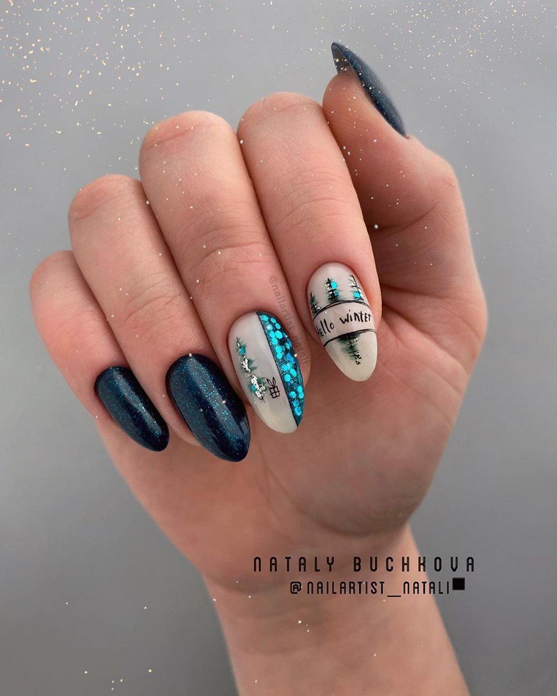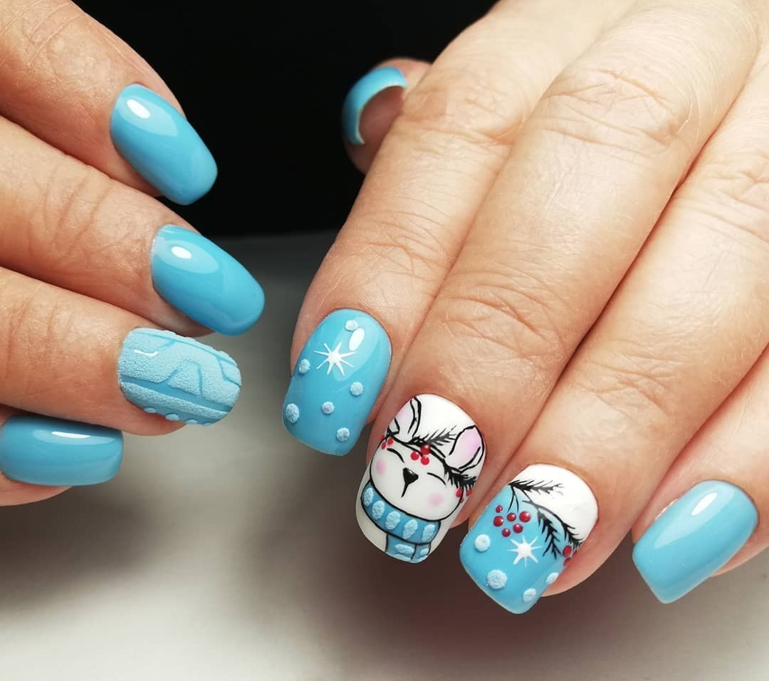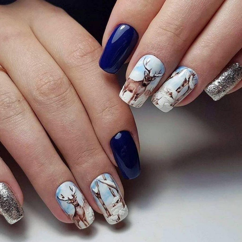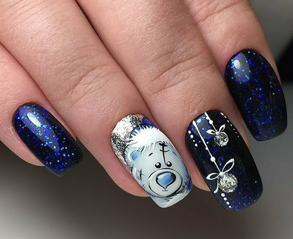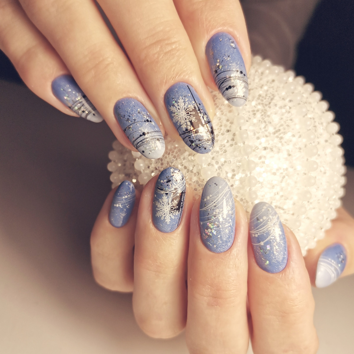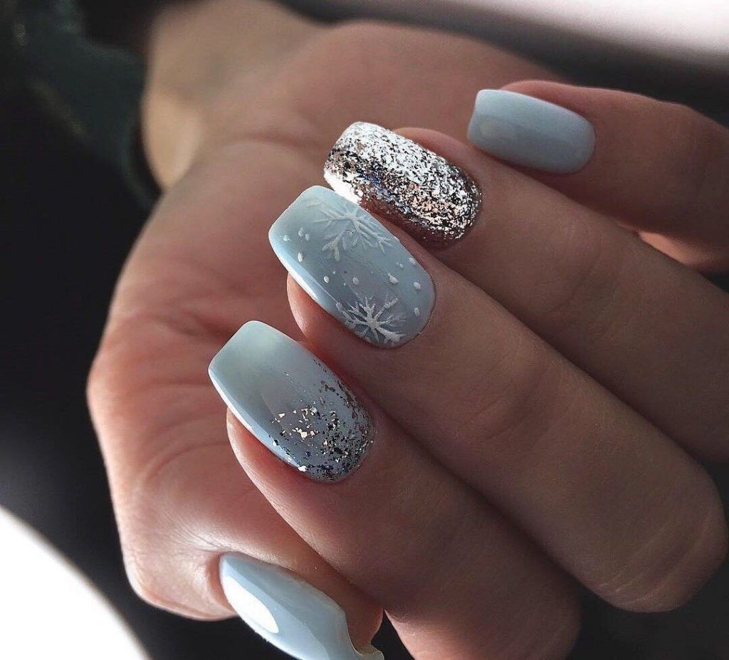 - синий. Палитра синего богата оттенками. Кто сказал, что цвет неба или синей ночи хорош только летом. Он актуален и в декабре. С его помощью можно создать стильный зимний маникюр. Особенно эффектно на синем фоне смотрятся серебристые и золотые акценты — узоры, снежинки и другая зимняя атрибутика. Декабрь — начало зимы, а значит не обязательно использовать новогоднюю атрибутику. Пофантазируйте и создайте свой собственный стиль;