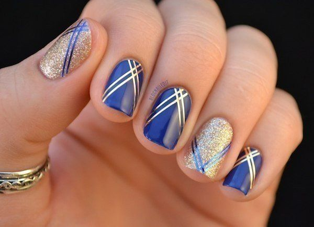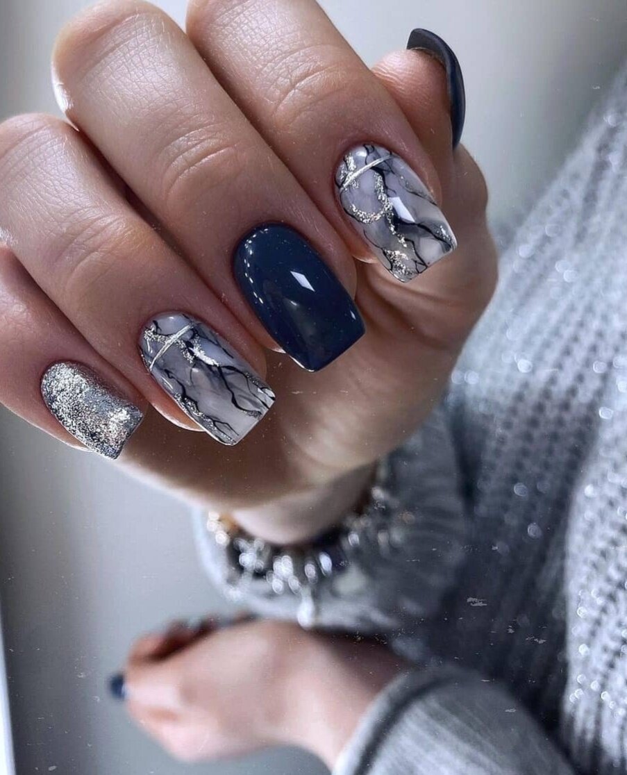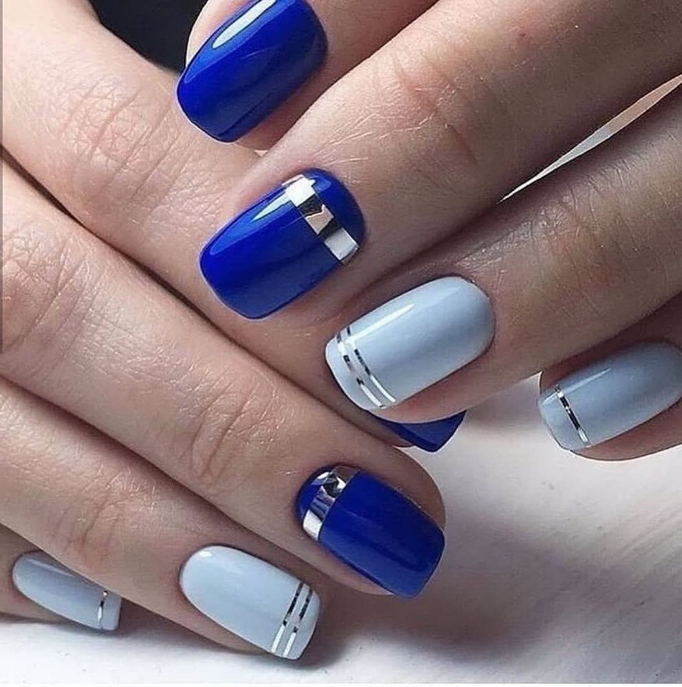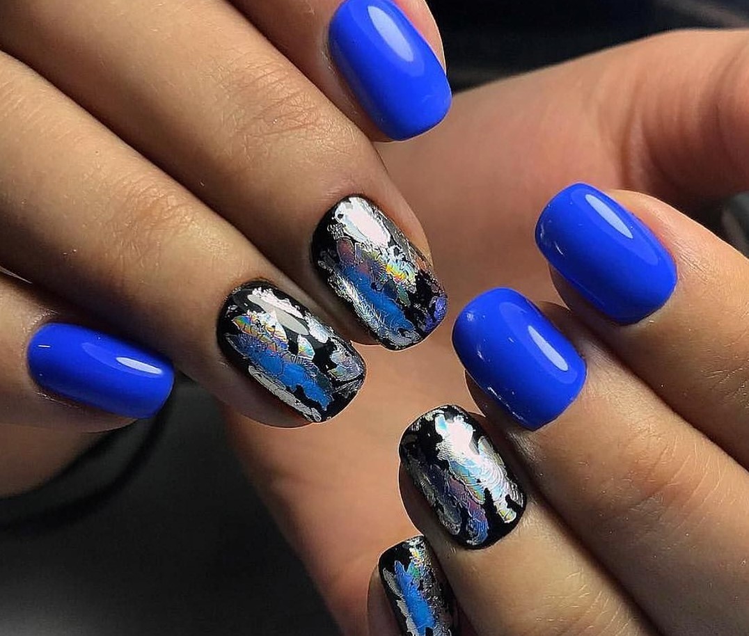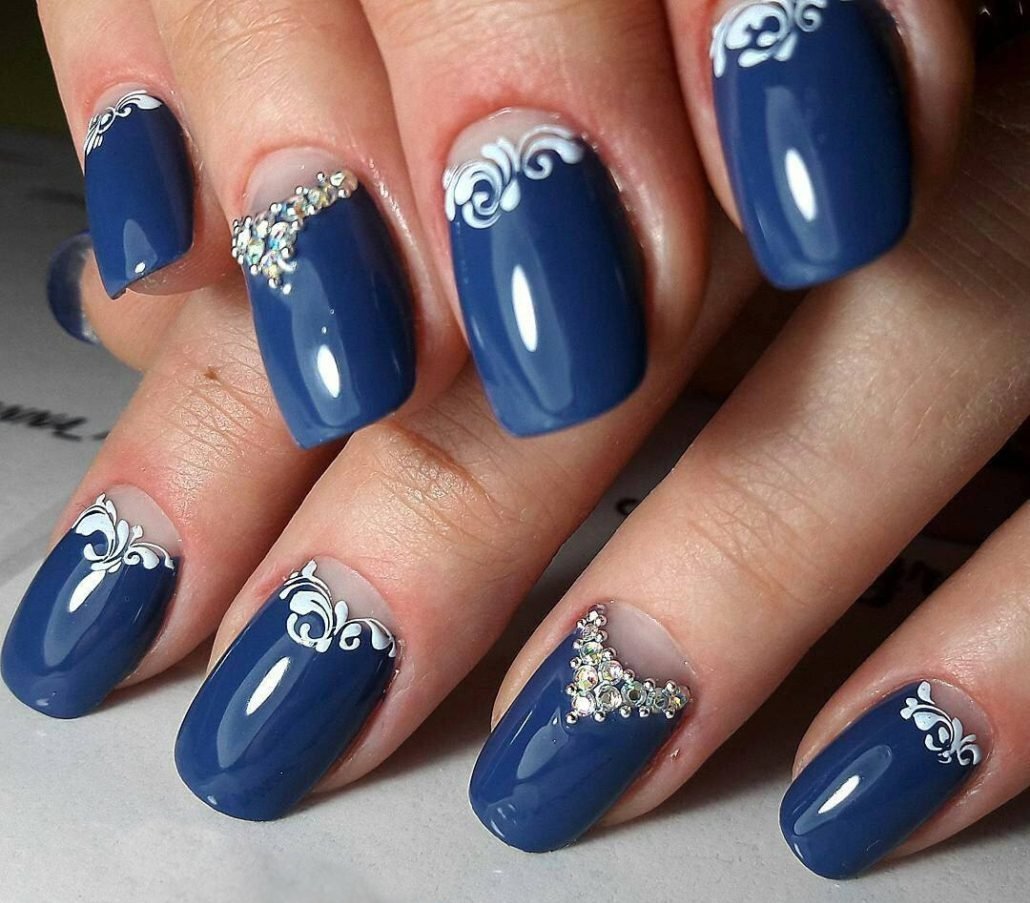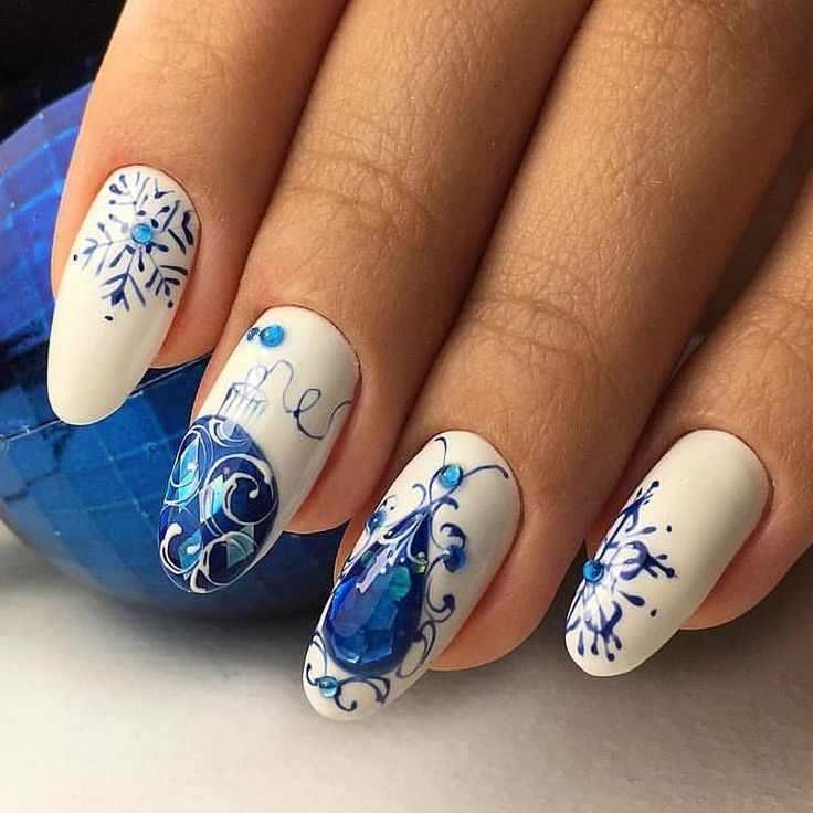 - синий. Палитра синего богата оттенками. Кто сказал, что цвет неба или синей ночи хорош только летом. Он актуален и в декабре. С его помощью можно создать стильный зимний маникюр. Особенно эффектно на синем фоне смотрятся серебристые и золотые акценты — узоры, снежинки и другая зимняя атрибутика. Декабрь — начало зимы, а значит не обязательно использовать новогоднюю атрибутику. Пофантазируйте и создайте свой собственный стиль;