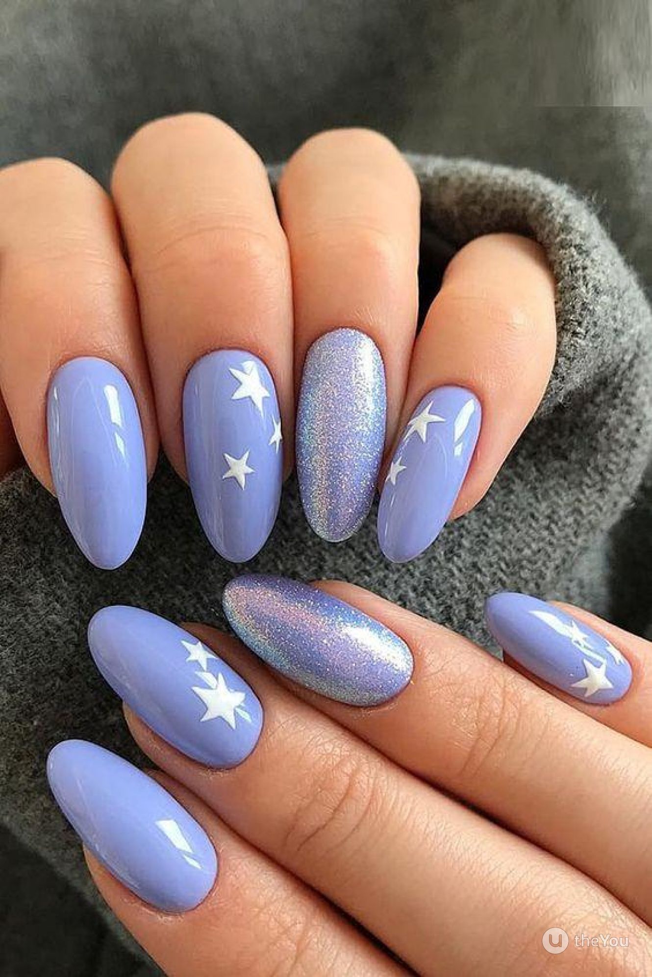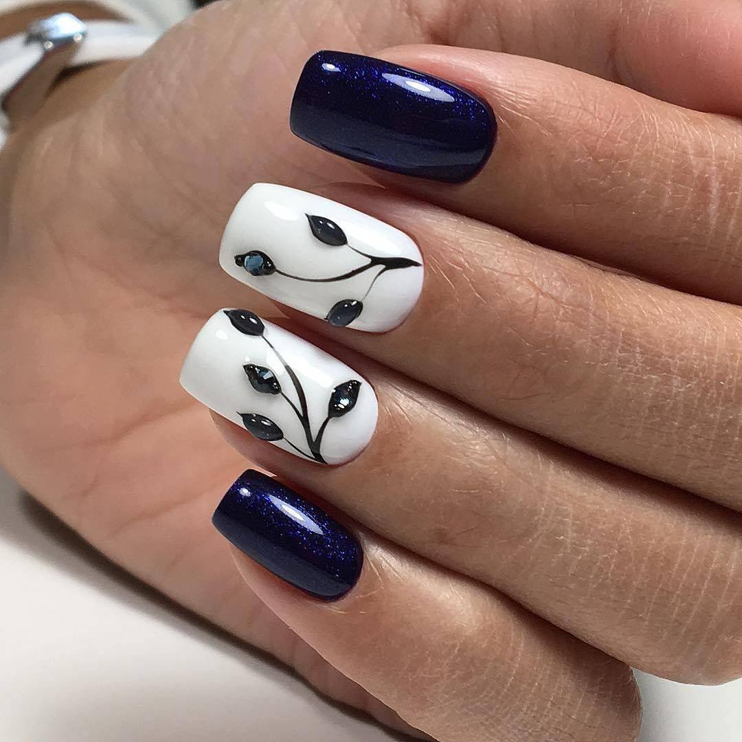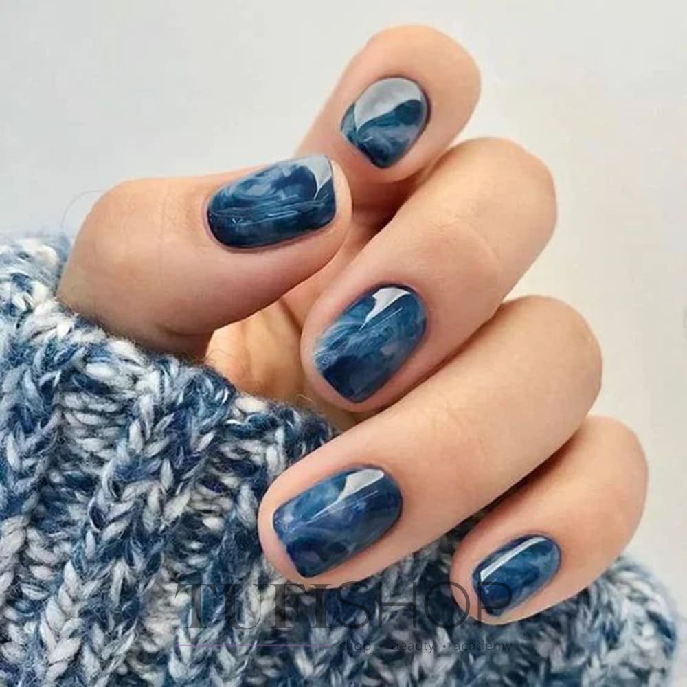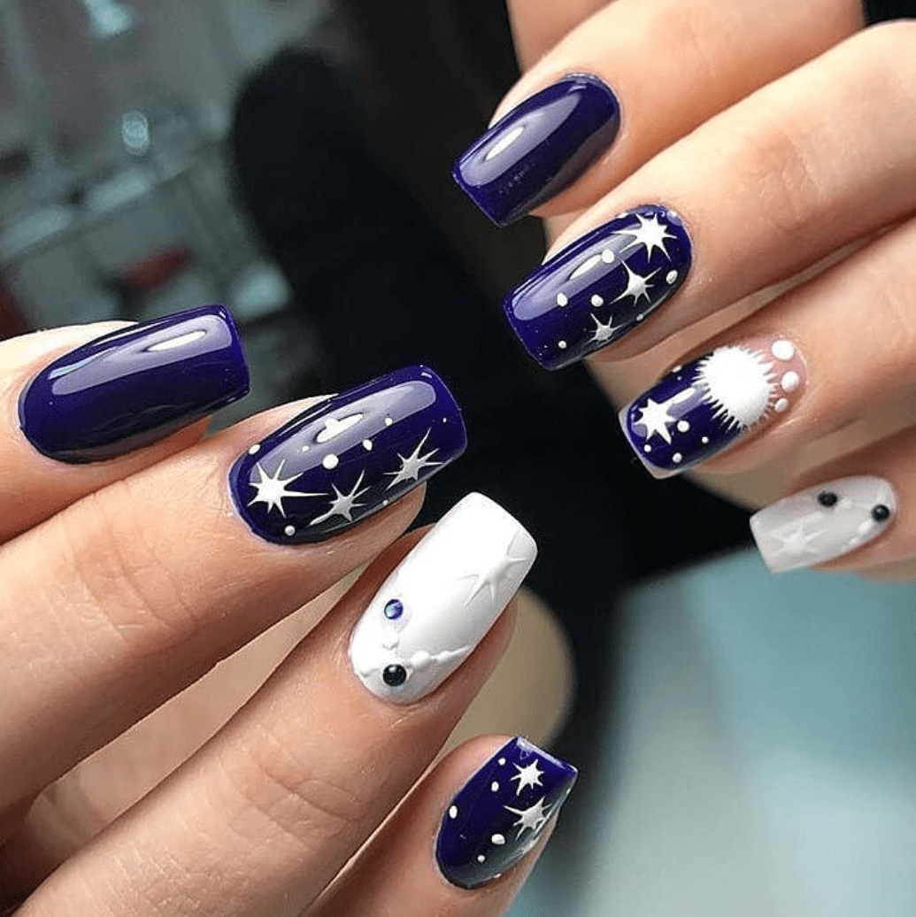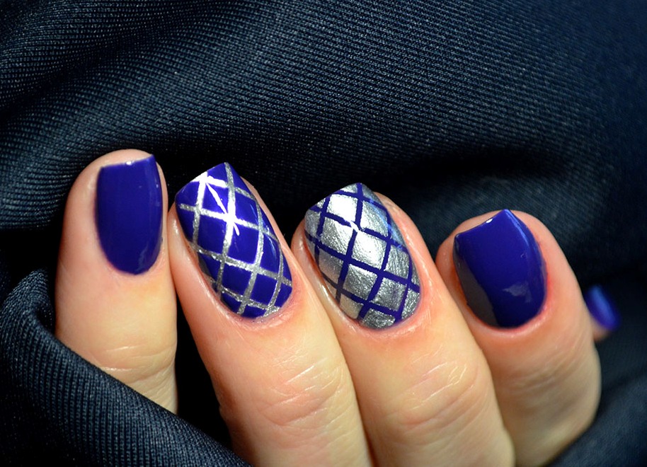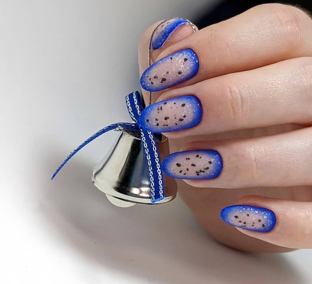 - синий. Палитра синего богата оттенками. Кто сказал, что цвет неба или синей ночи хорош только летом. Он актуален и в декабре. С его помощью можно создать стильный зимний маникюр. Особенно эффектно на синем фоне смотрятся серебристые и золотые акценты — узоры, снежинки и другая зимняя атрибутика. Декабрь — начало зимы, а значит не обязательно использовать новогоднюю атрибутику. Пофантазируйте и создайте свой собственный стиль;