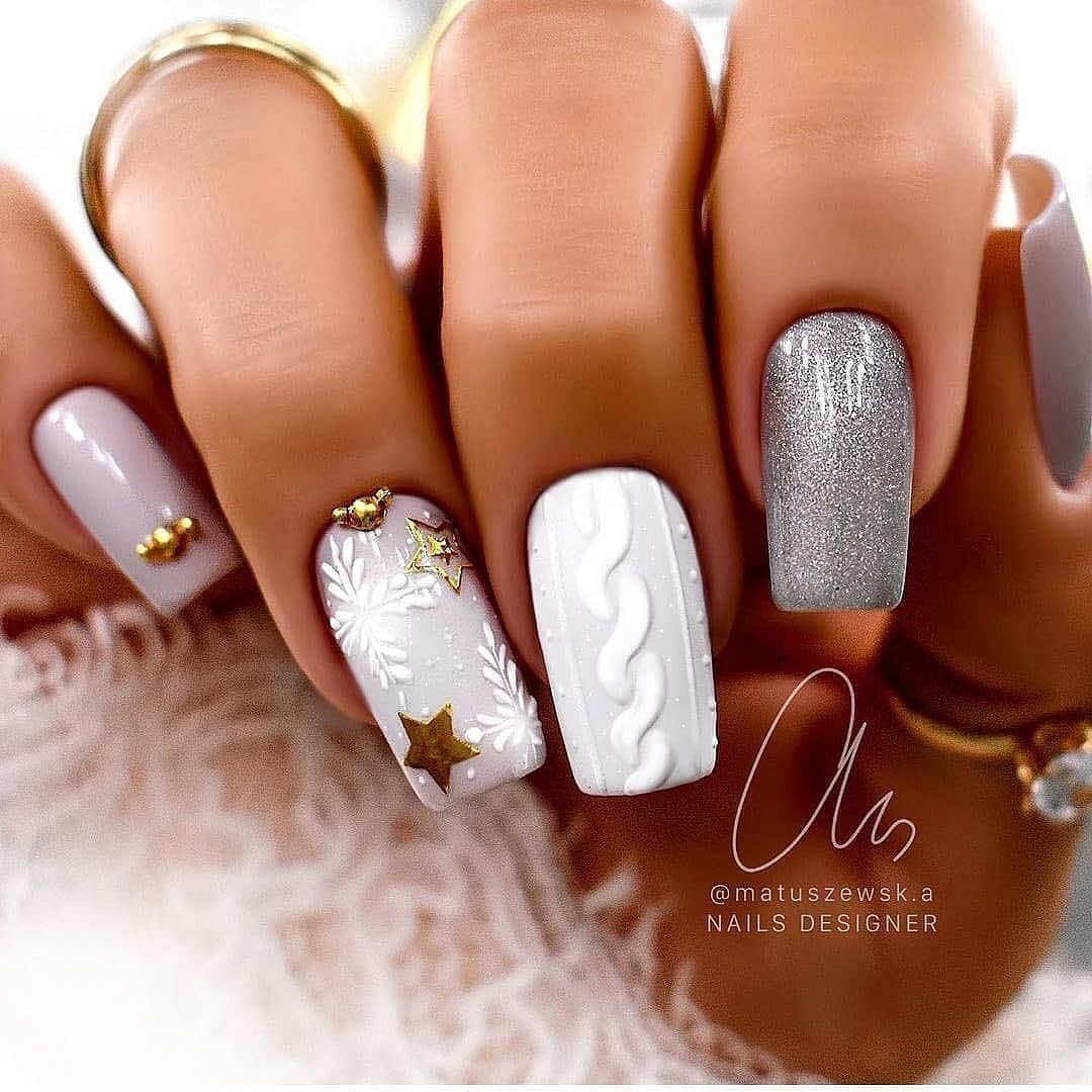 Меняется и дизайн. От ярких броских рисунков акцент смещается в сторону серебра и золота. Но не обилия этих оттенков, а тонких выверенных узоров и линий. В декабре начинаются первые серьезные морозы и это обязательно находит отражение в маникюре. А еще это время ожидания и подготовки к праздникам, а значит на ногтях прочно обоснуются снежинки и звезды, новогодняя атрибутика и драгоценные камни.