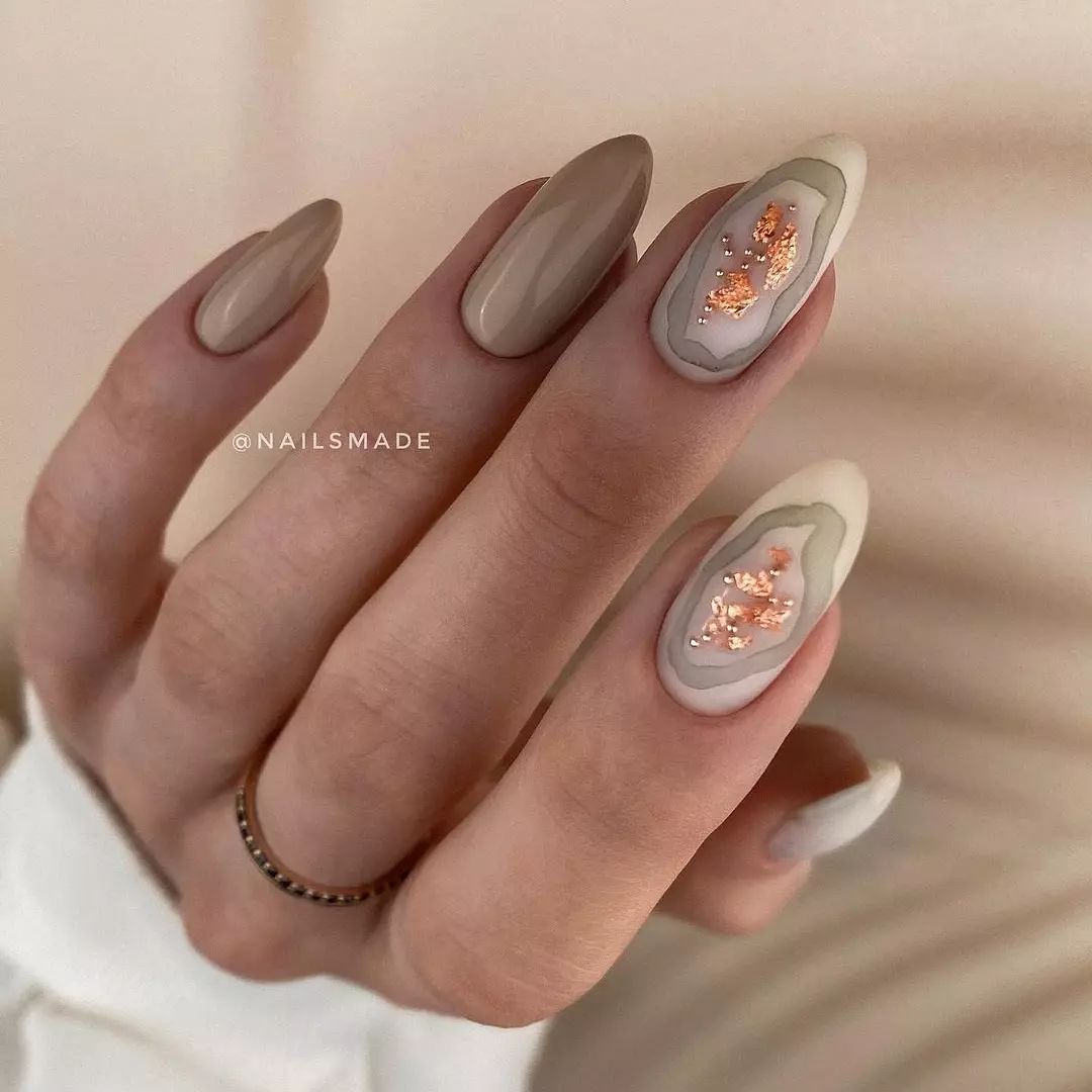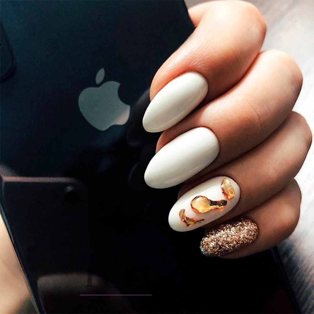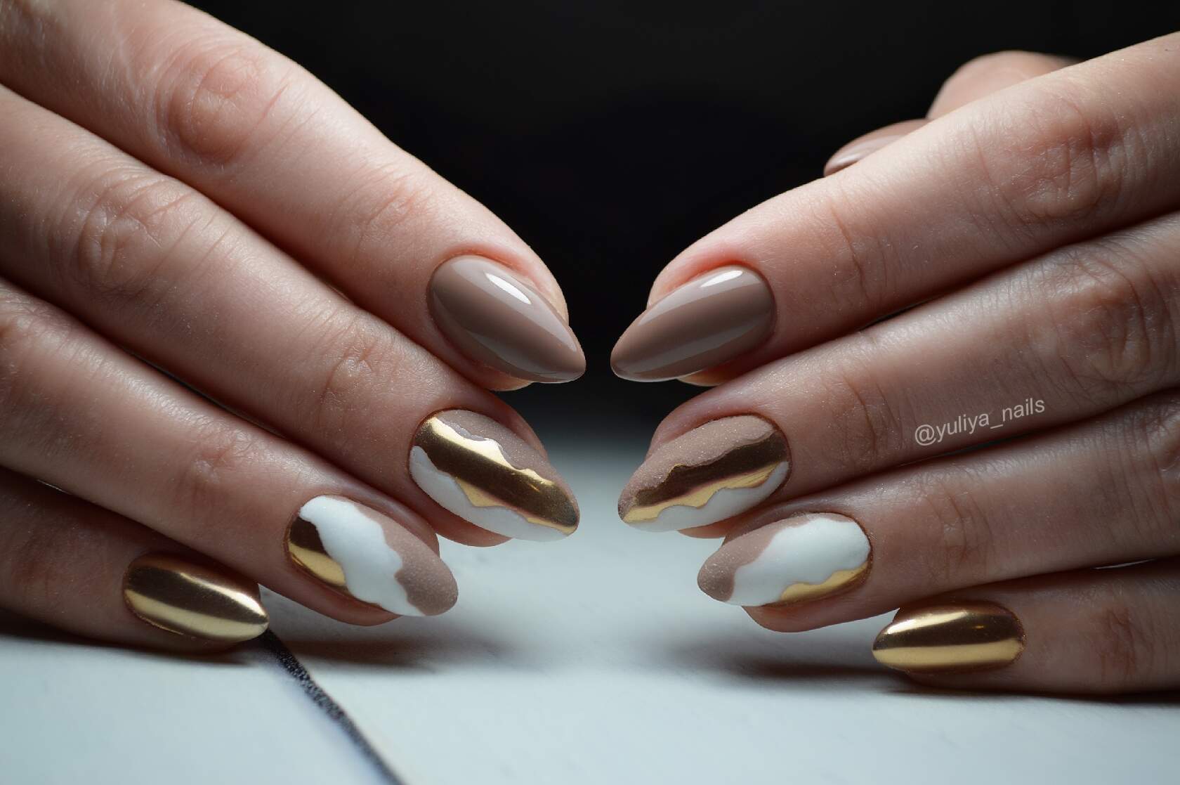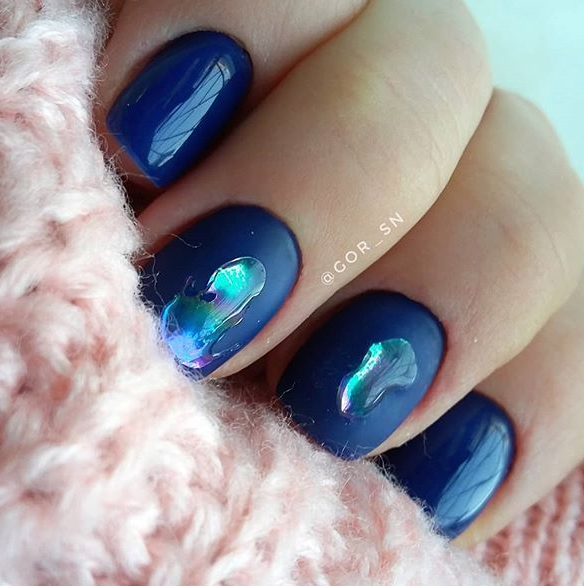 Капелька расплавленного металла на ногте — стильно и очень интересно. Такой дизайн особенно подходит однотонному маникюру в декабре. Лучше украсить металлической каплей один ноготок, чтобы не переборщить.