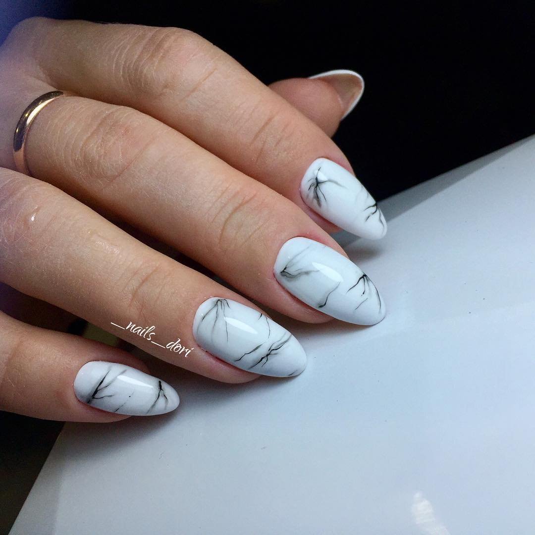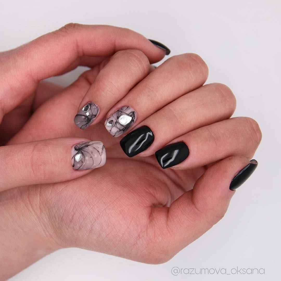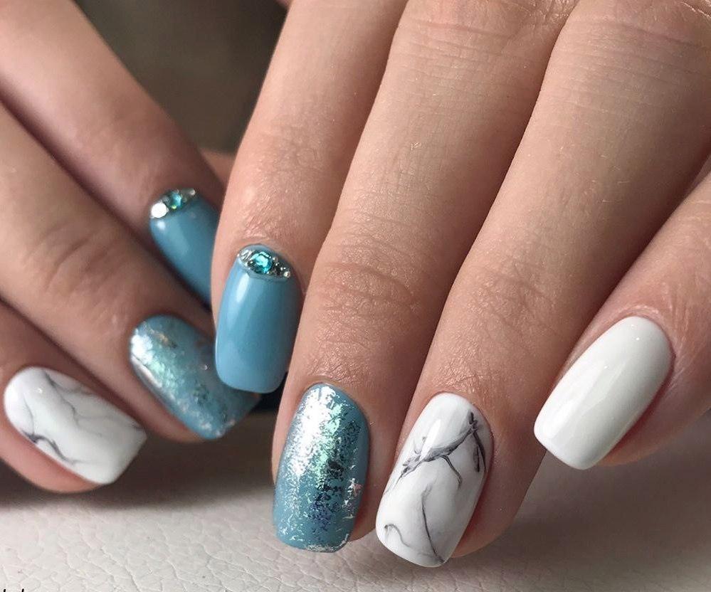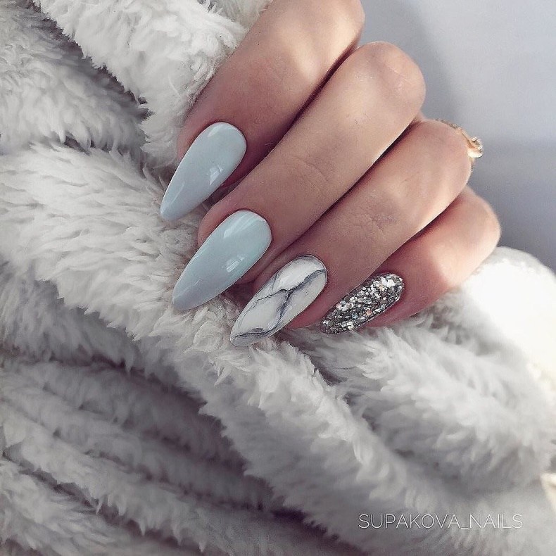 В декабре мраморный маникюр остается не менее актуальным. Меняются только оттенки лака. Дизайн становится более четким и контрастным. Мраморный декор можно дополнить фольгой, блестками или стразами. Интересно смотрится вариант с зонированием пластины на две равные части. Одна оформляется в мраморном стиле, другая остается прозрачной или окрашивается в контрастный оттенок и покрывается матовым топом. При желании ее можно оставить глянцевой.