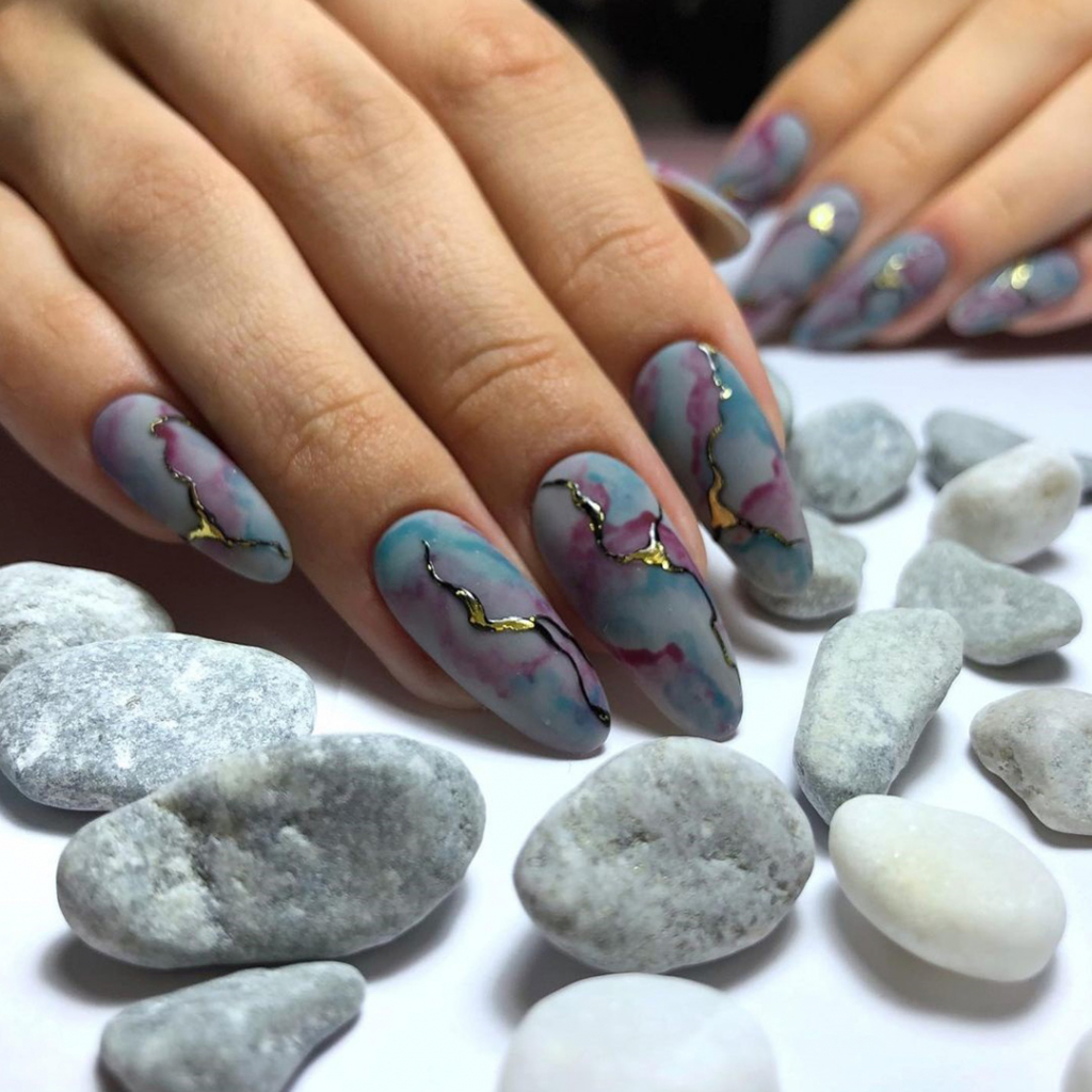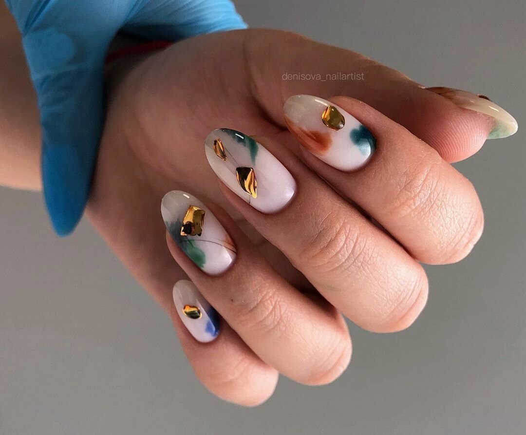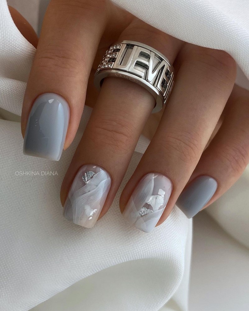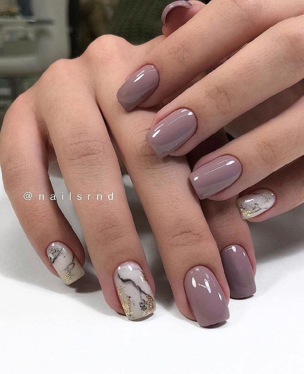 В декабре мраморный маникюр остается не менее актуальным. Меняются только оттенки лака. Дизайн становится более четким и контрастным. Мраморный декор можно дополнить фольгой, блестками или стразами. Интересно смотрится вариант с зонированием пластины на две равные части. Одна оформляется в мраморном стиле, другая остается прозрачной или окрашивается в контрастный оттенок и покрывается матовым топом. При желании ее можно оставить глянцевой.