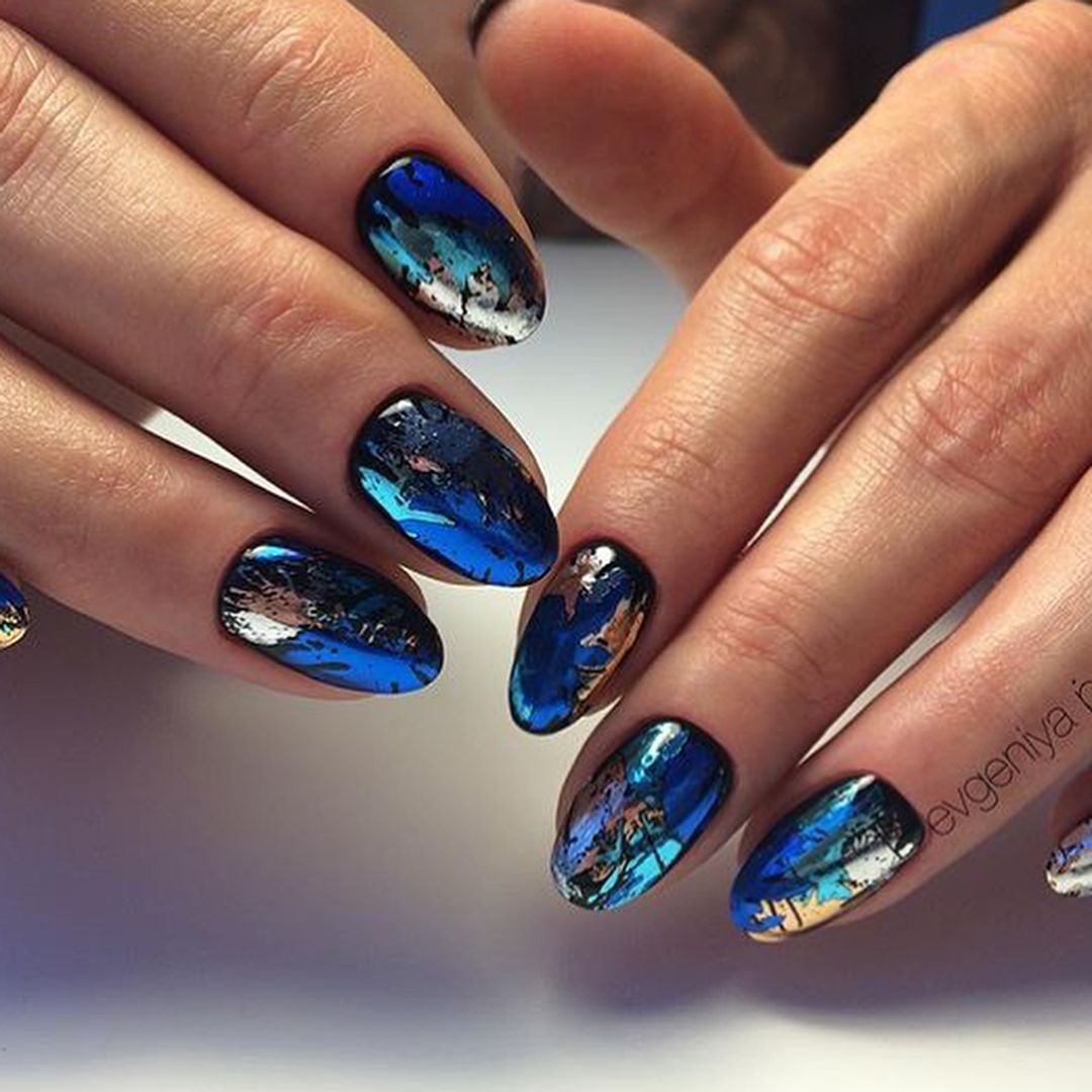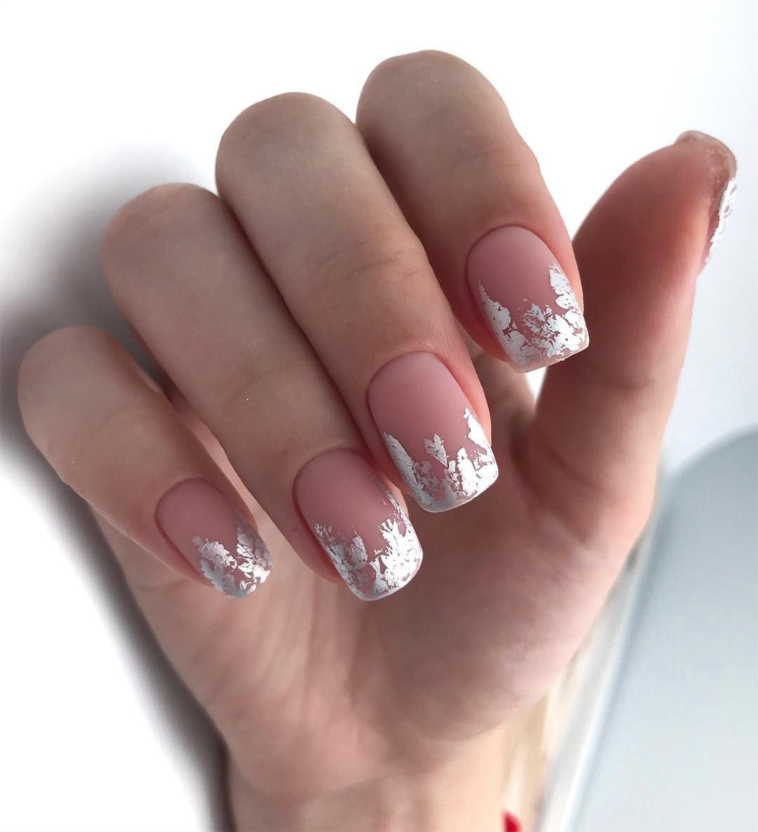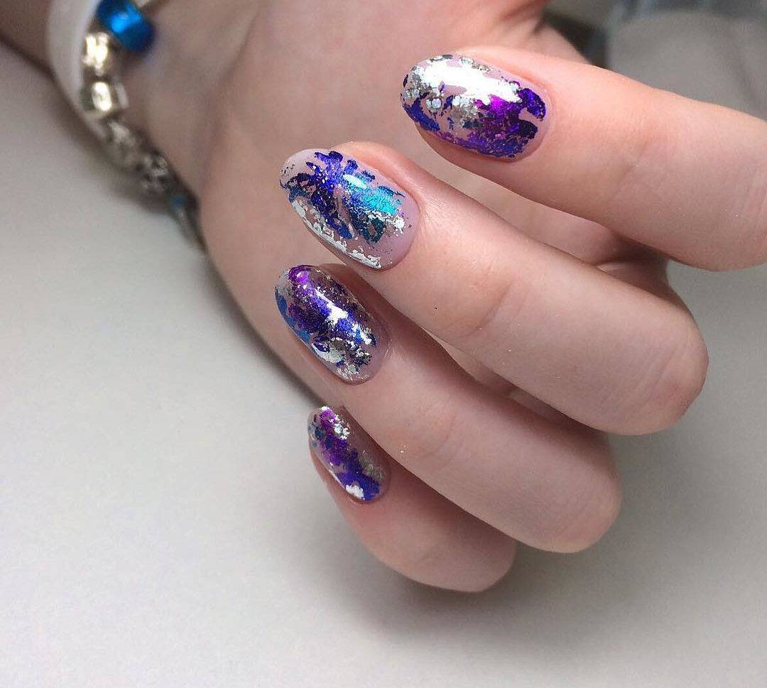 Фольга — блестящий материал, с которым довольно просто работать самостоятельно. Маникюр получается более сдержанным, чем при использовании страз или блесток. Но и более интересным и необычным. Фольгу в декабре можно наносить абсолютно хаотично. Представьте себе, что рисуете красками. Отлично смотрятся такие мазки на матовом фоне.