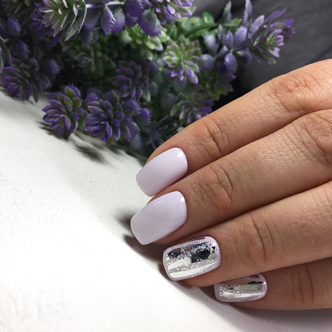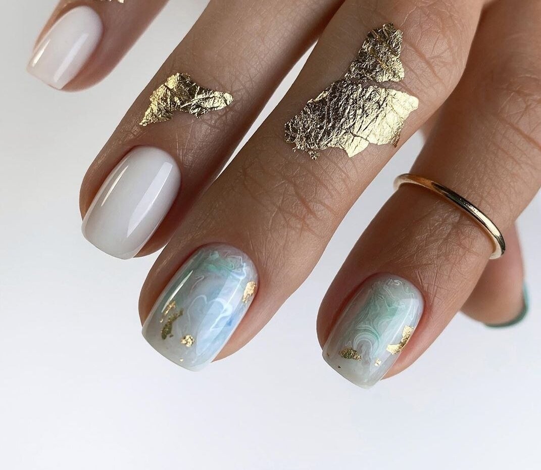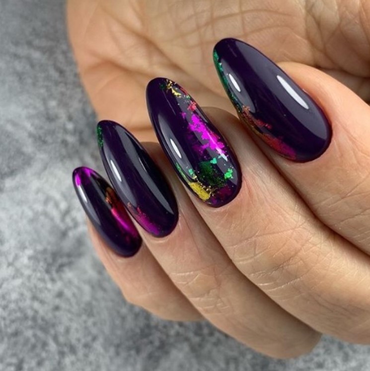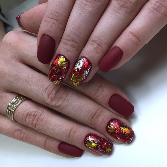 Фольга — блестящий материал, с которым довольно просто работать самостоятельно. Маникюр получается более сдержанным, чем при использовании страз или блесток. Но и более интересным и необычным. Фольгу в декабре можно наносить абсолютно хаотично. Представьте себе, что рисуете красками. Отлично смотрятся такие мазки на матовом фоне.