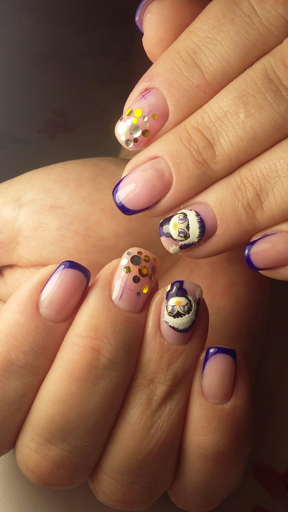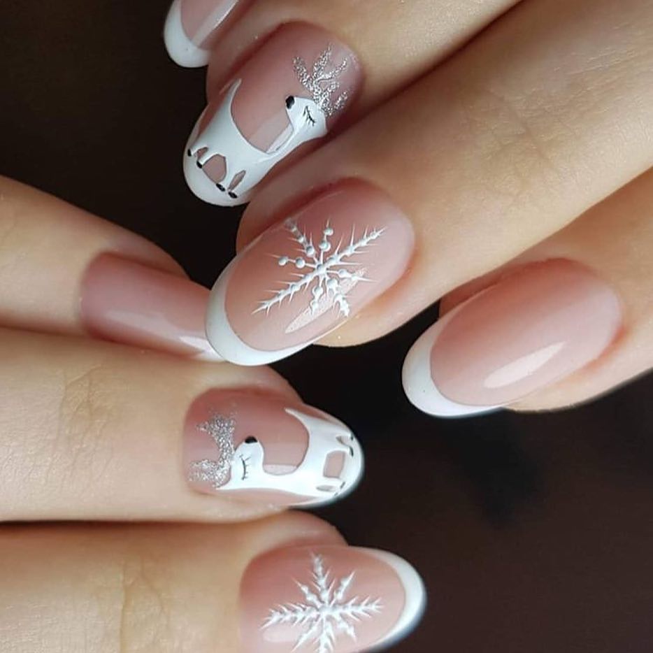 Отлично смотрятся на прозрачной основе френча рисунки на новогоднюю тематику. Все таки на дворе декабрь и очень скоро начинается предпраздничный ажиотаж с поиском подарков и нарядных платьев.