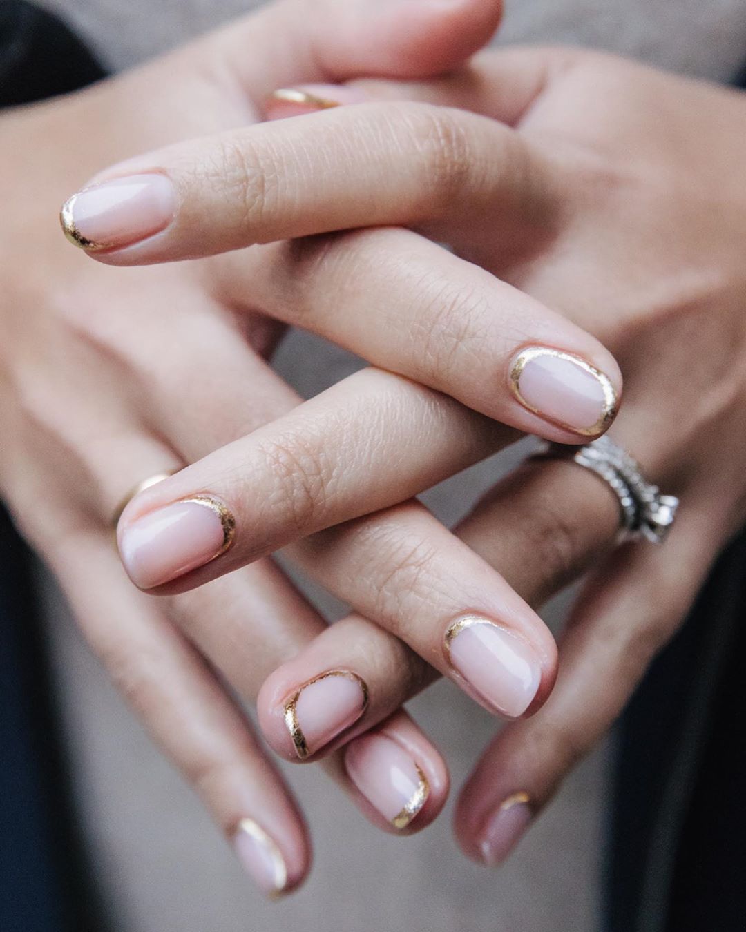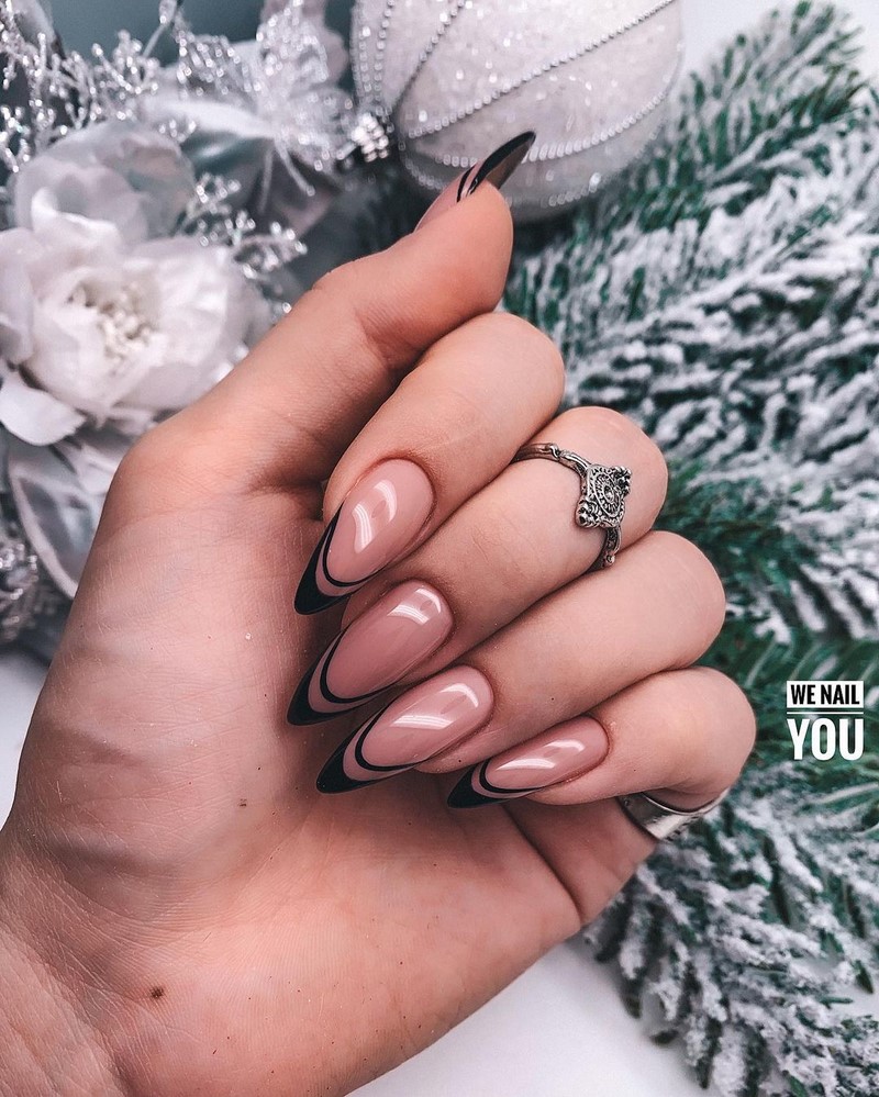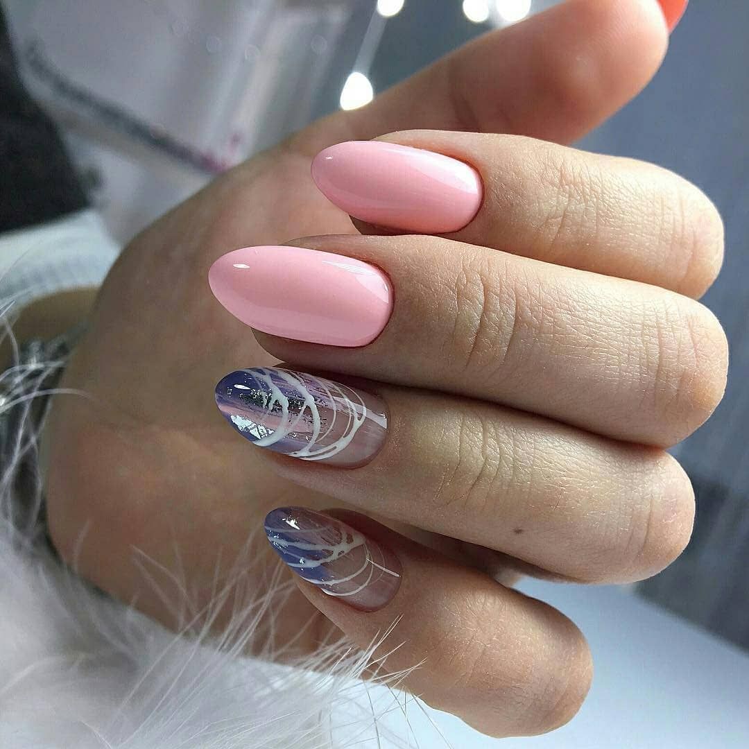 В декабре все живут ощущением предстоящих праздников и отдыха. Все находятся в поисках подарков родным и близким. Хочется чего-то необычного. Реализуйте эту идею в маникюре — используйте технику круговой обводки пластины. Как правило, мастера используют прозрачную или нюдовую базу и тонкие металлические линии для обводки. Добавьте небольшой рисунок в стиле минимализм и стильный дизайн для декабря готов.
