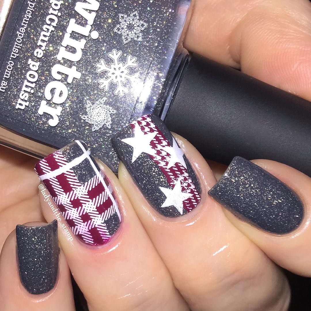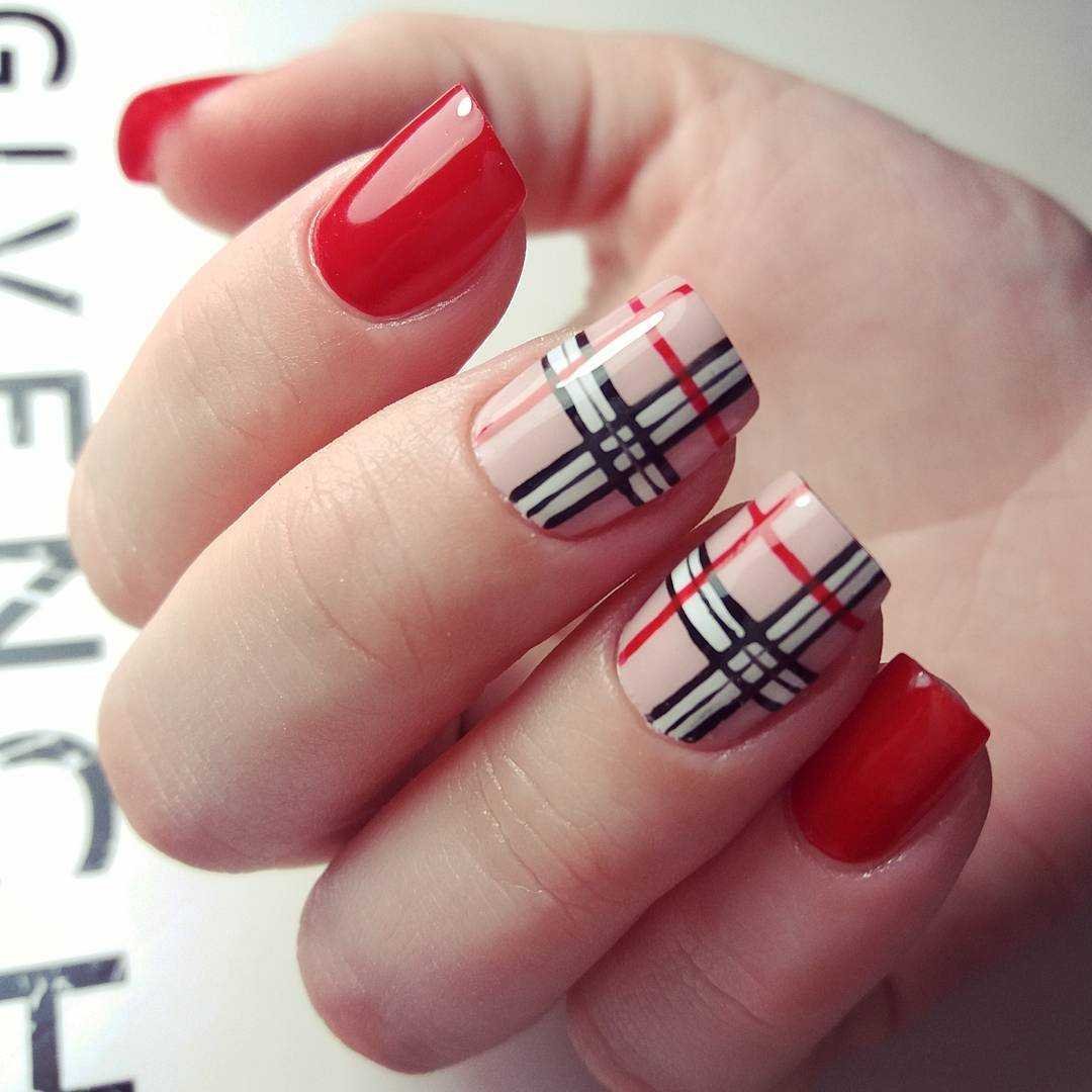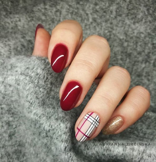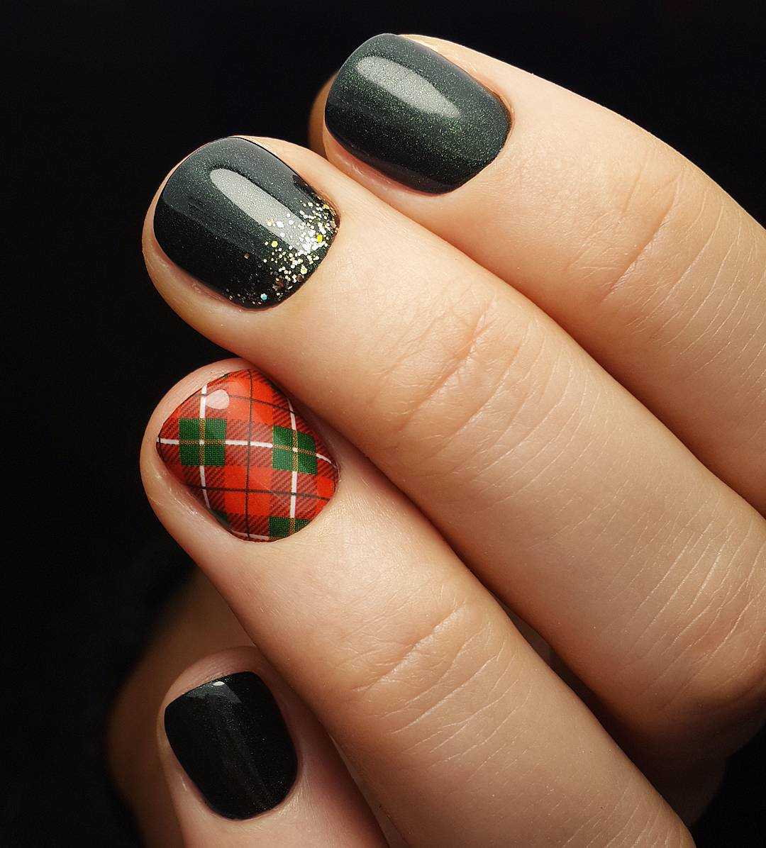Какой мы представляем себе теплую ткань? Чаще всего это шотландка — мягкая, теплая с узнаваемым рисунком в клетку. Если вязаный маникюр для декабря по каким то причинам не подходит, сделайте клетчатый. Стильно смотрится выделение таким образом всего одного ногтя. Остальные могут быть матовыми или глянцевыми.
