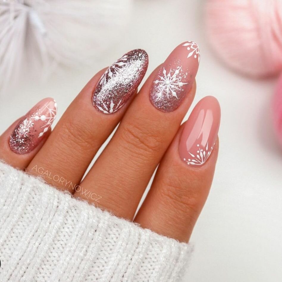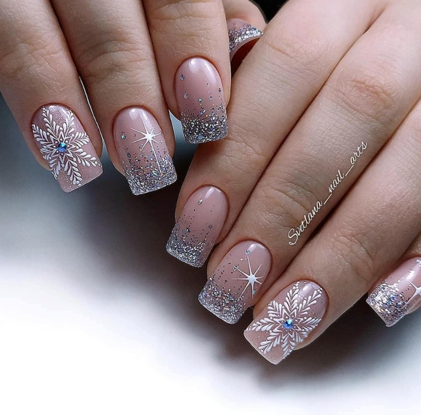 Какие рисунки актуальны в декабре? Конечно, снежинки! Они могут быть не только серебристыми, но и золотыми, белыми и даже черными. Все зависит от базового лака. Кроме того, рисунок можно нанести с помощью блестящей акриловой пудры, используя трафарет.