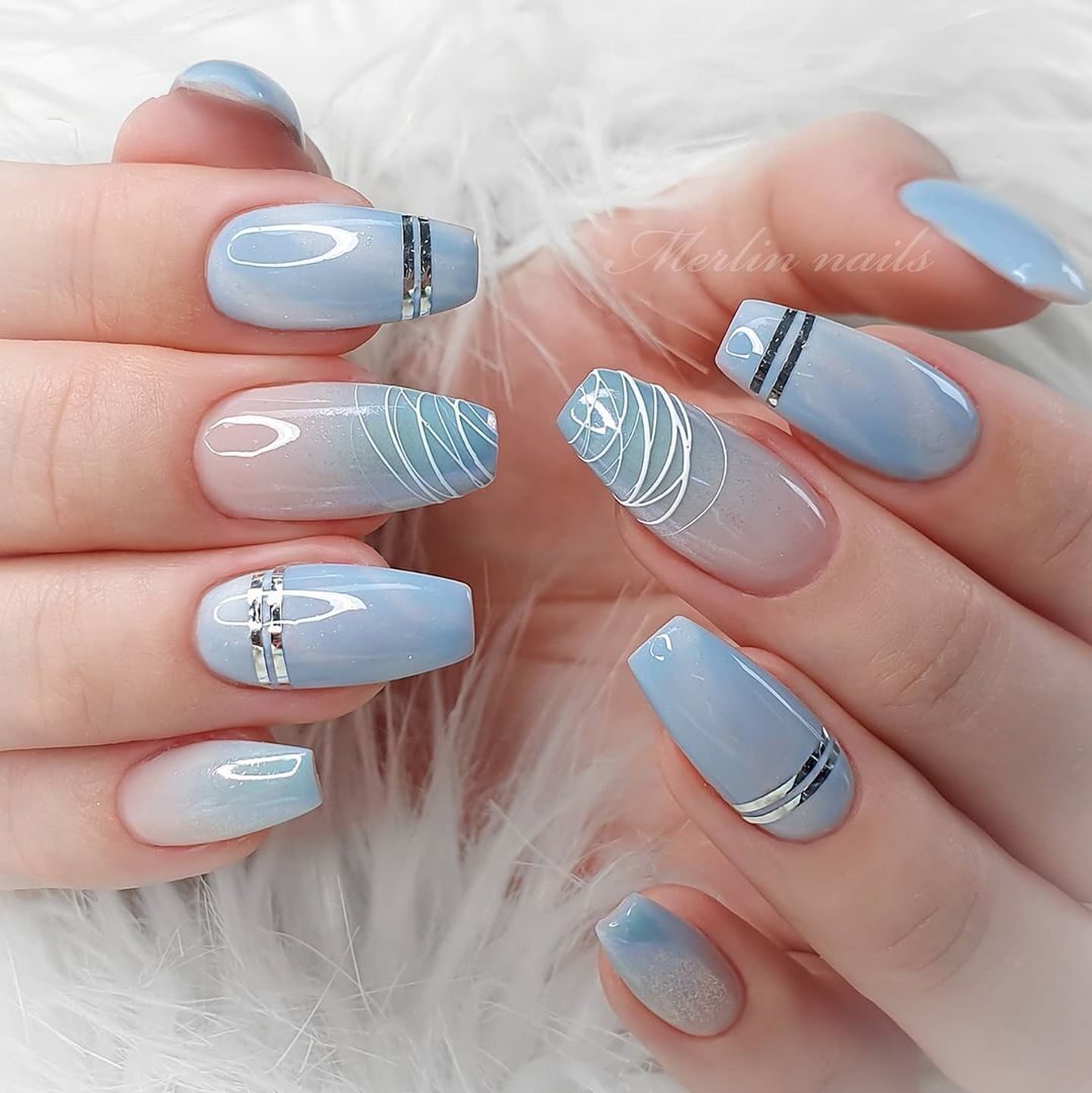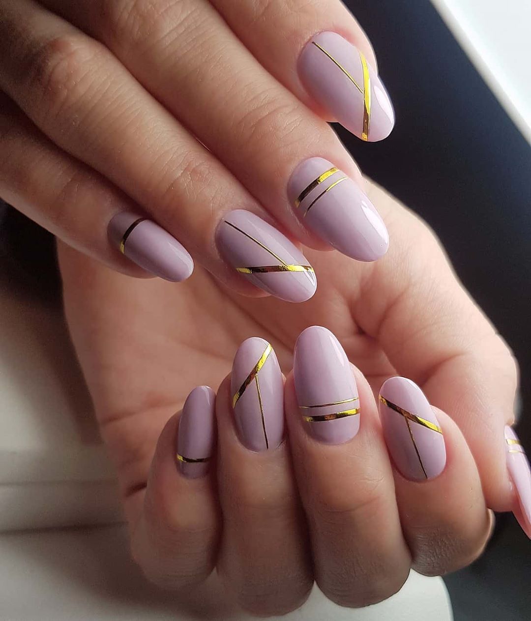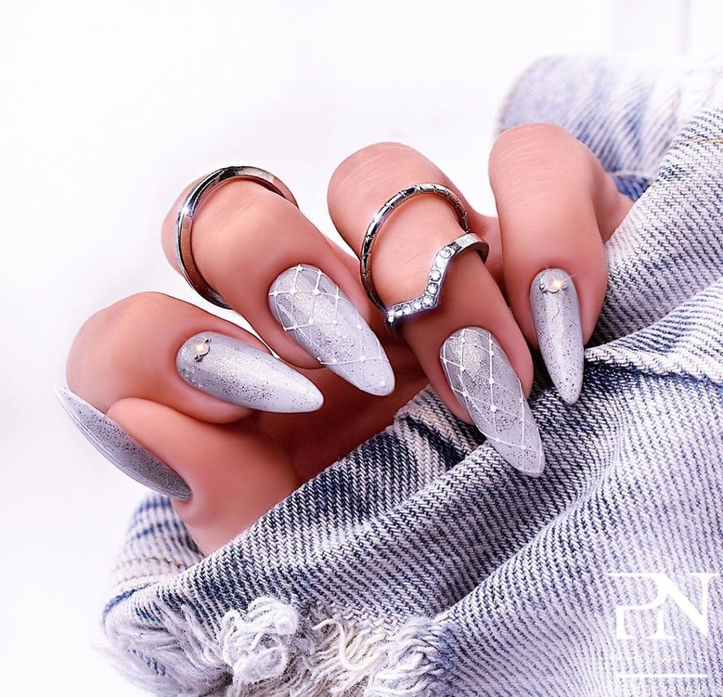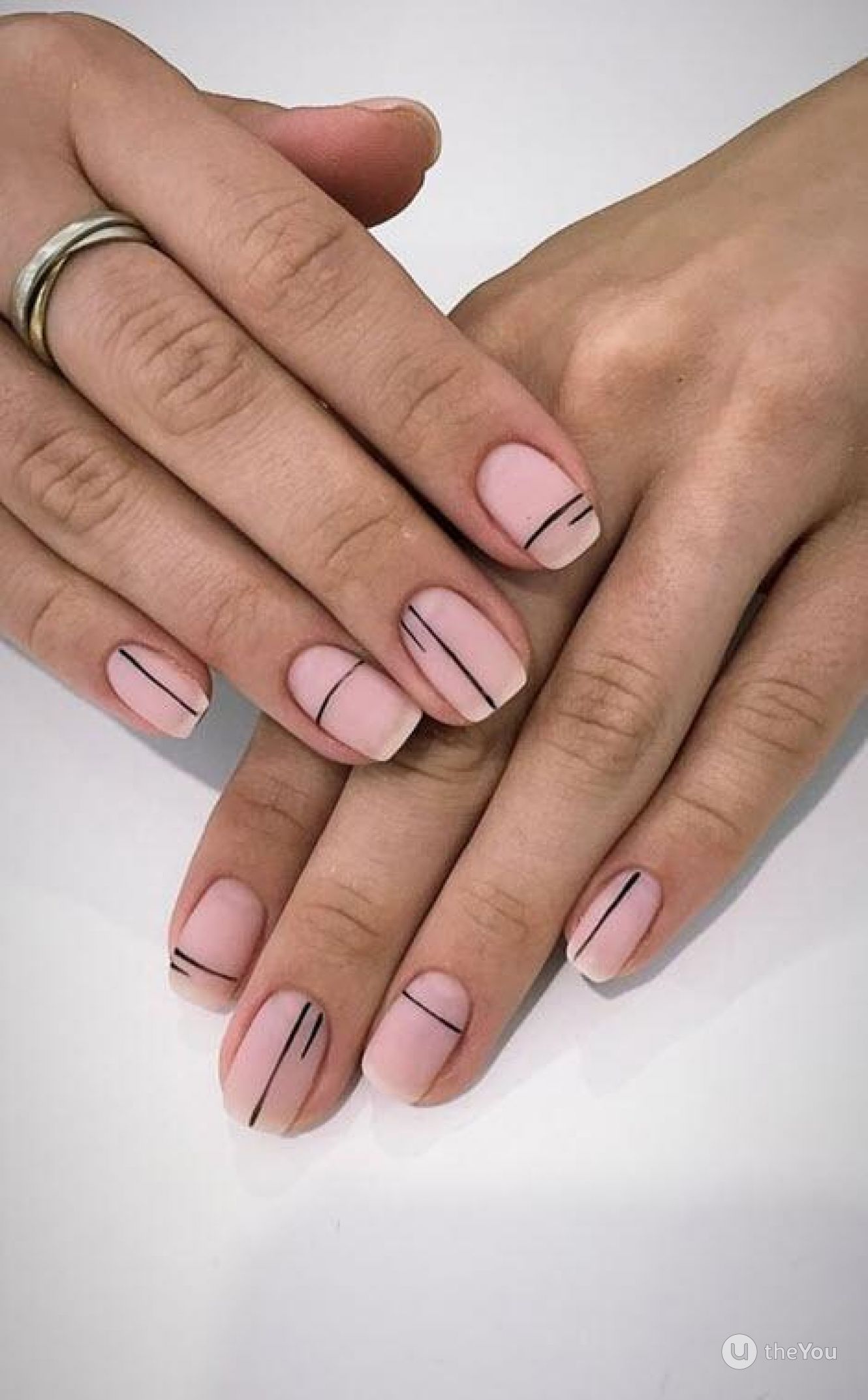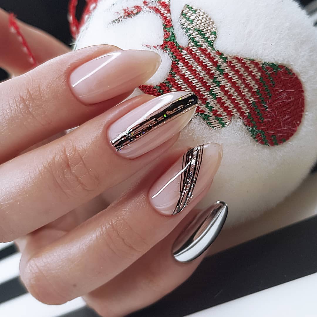 Это более простой вариант дизайна, чем геометрия или абстракция. Тонкие серебристые полоски можно нанести на матовую базу. С их помощью легко зонировать пространство на пластине. Полосатый маникюр в декабре можно дополнить техникой негативного пространства, стразами или рисунком.