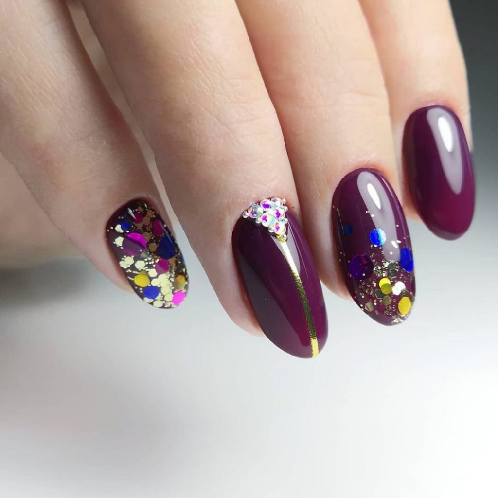 - сливовый. Вкусный сочный ягодный оттенок как нельзя лучше подходит для маникюра в декабре. Мастера нейл-арта предлагают обратить внимание на блестящую вариацию сливового лака.