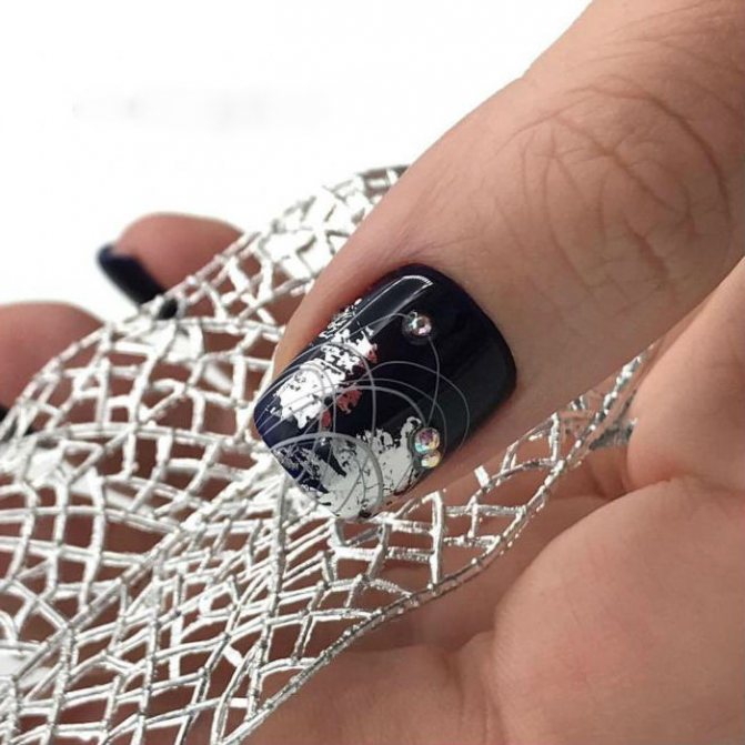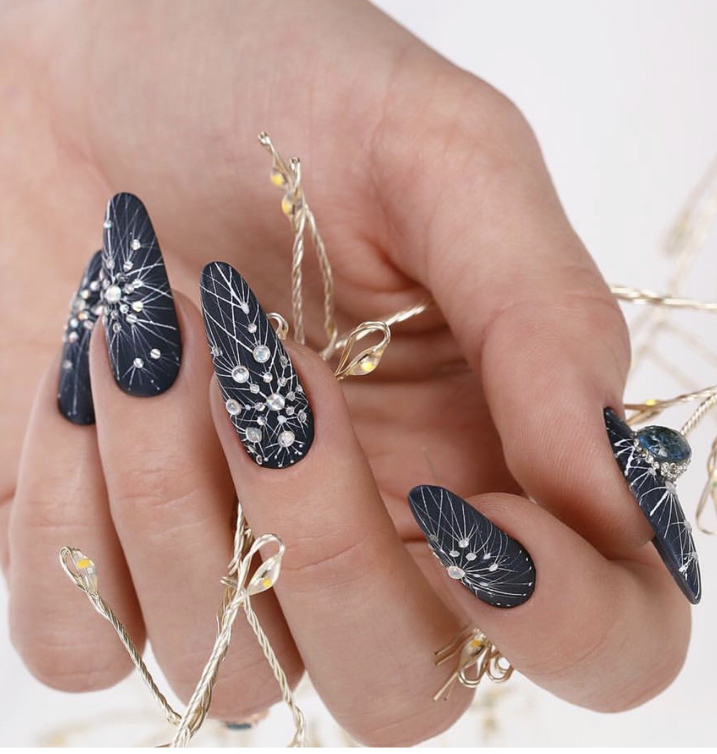 Очень стильно смотрится паутинка на матовых или глянцевых ногтях, окрашенных в густой насыщенный оттенок лака. В декабре это черный, синий, болотный, сливовый. Тонкие линии паутинки могут располагаться на кончике пластины или посередине ногтя. Добавьте мелкие стразы и у вас получатся далекие звездочки, которые словно запутались в нитях.