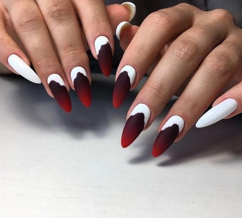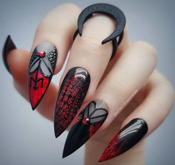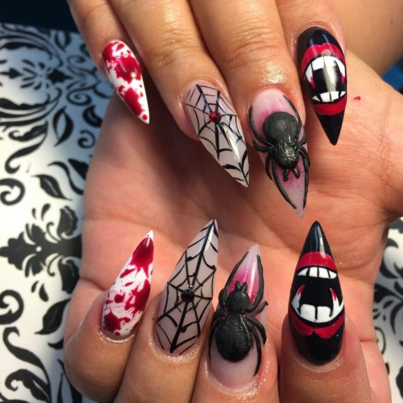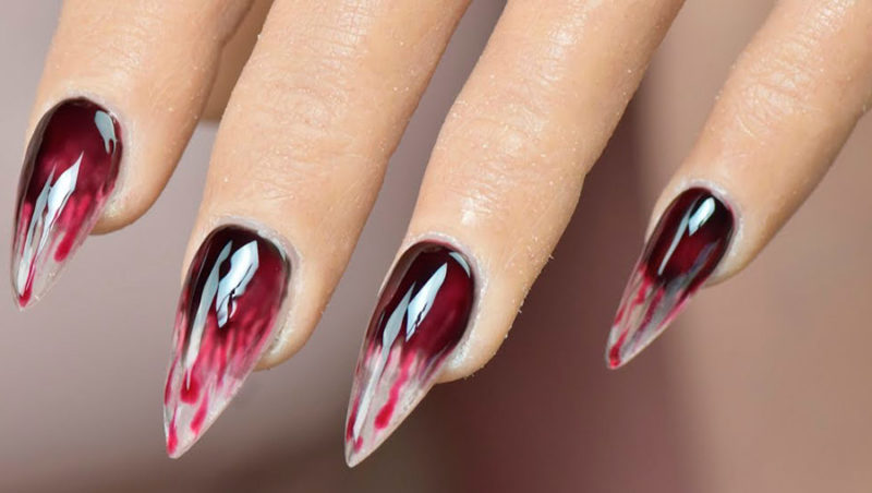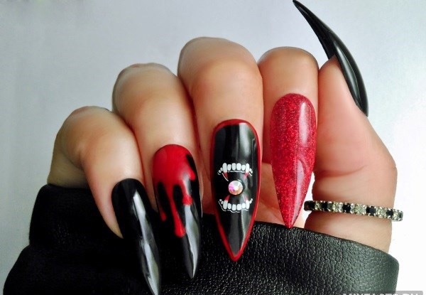 Хотя сейчас слишком большая длина не считается актуальным трендом по мнению многих стилистов, длинные острые ногти однозначно подходят для создания выразительного нэйл-дизайна перед Хэллоуином. Ультраострый маникюр только прибавит хищности и опасности вашему образу, а любые расцветки и рисунки будут смотреться притягательнее и ярче. Даже капли обычного пурпурного лака на темном фоне заставят окружающих сомневаться, не настоящая ли вампирша перед ними?