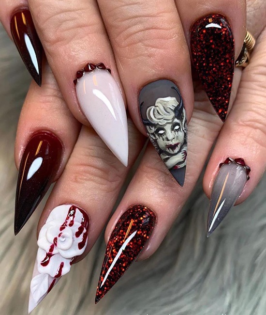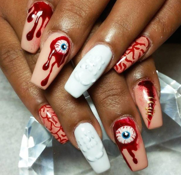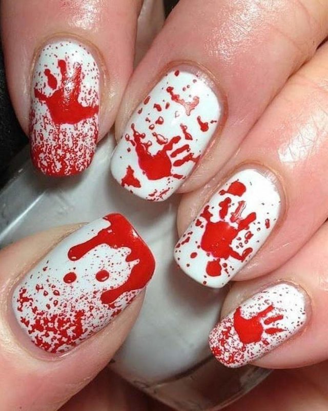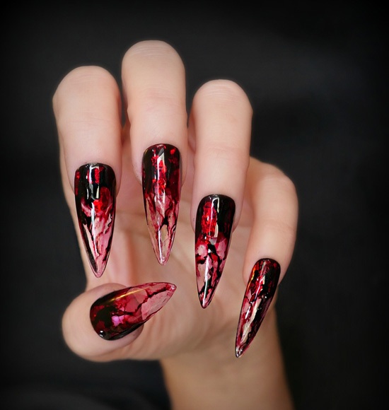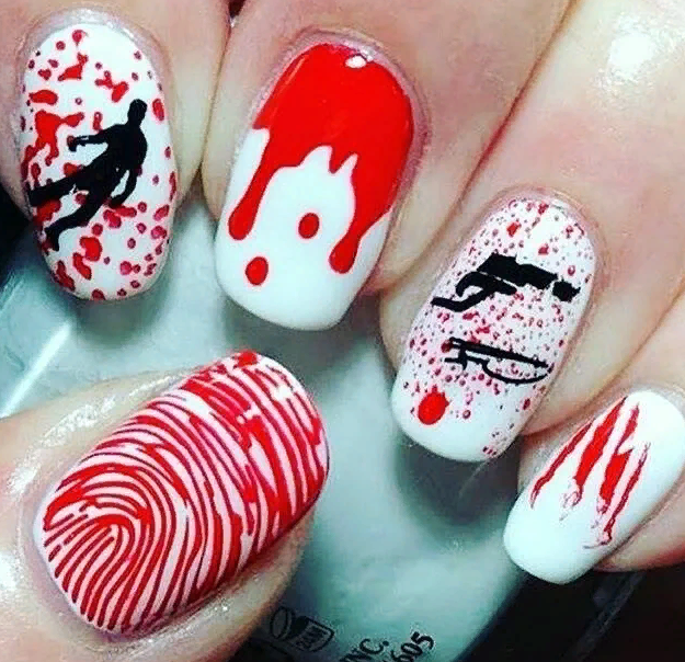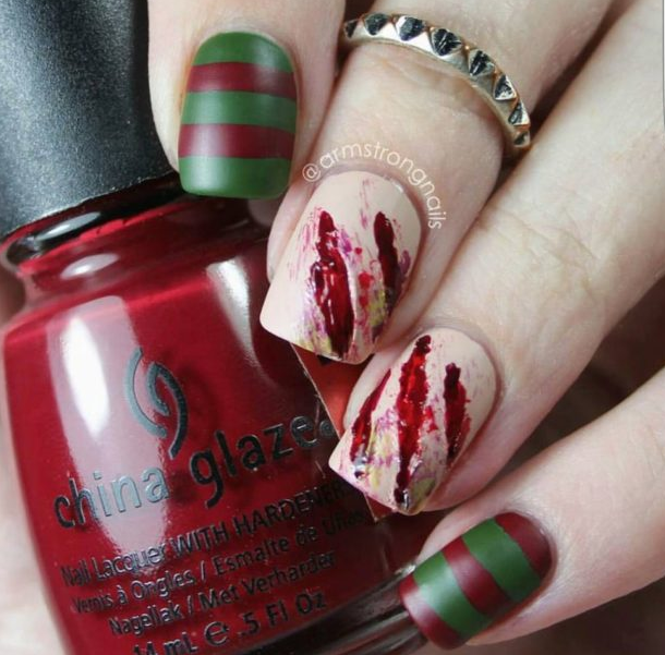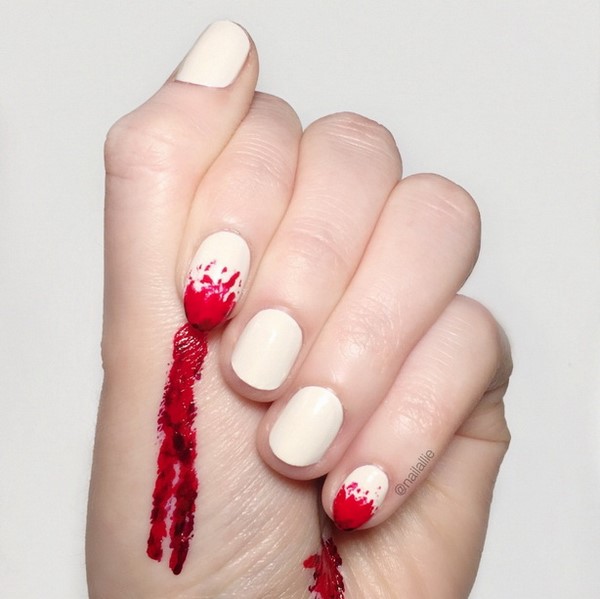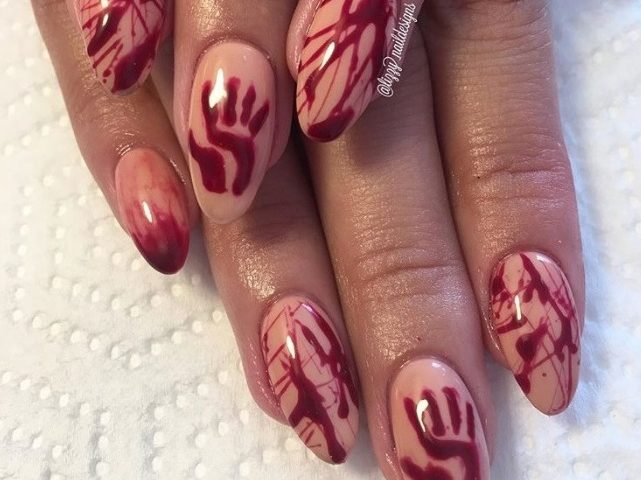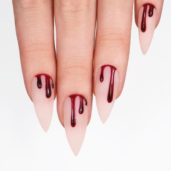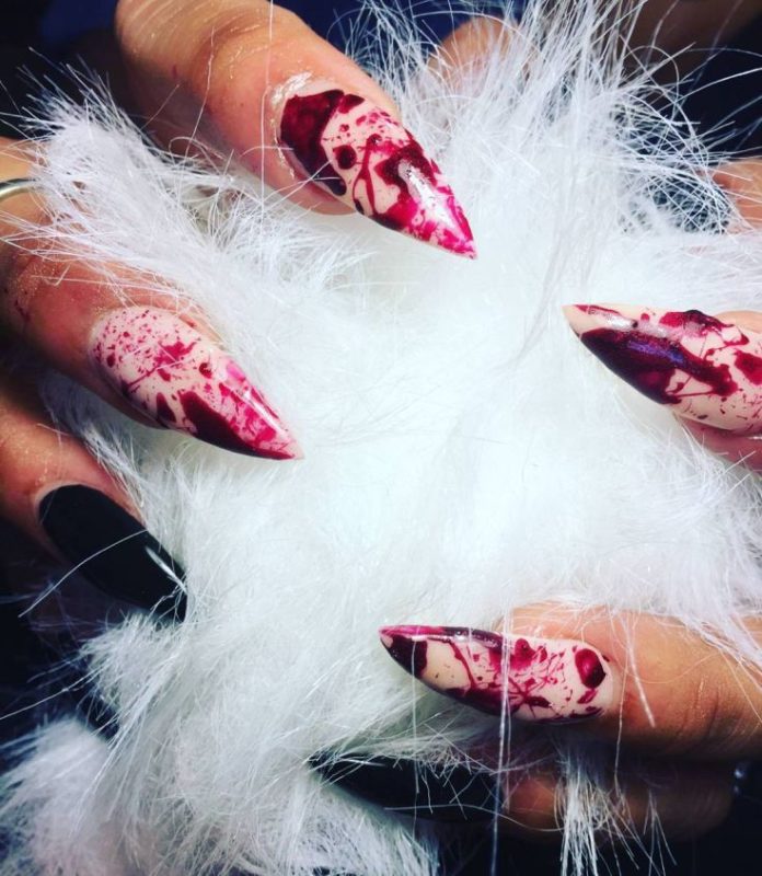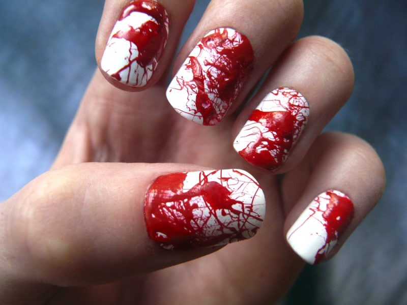 Даже красным лаком с целью изобразить капли крови на длинных ногтях можно так, что они превратятся во внушающее ужас орудия убийства.