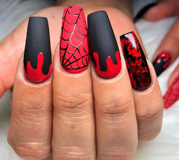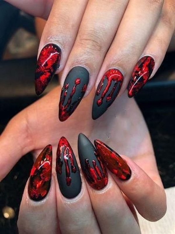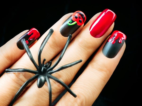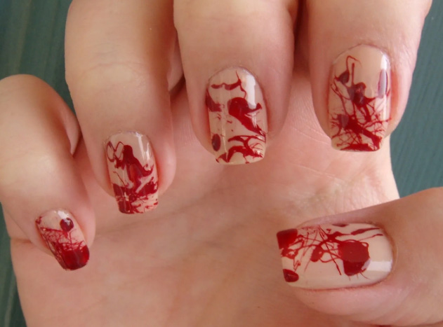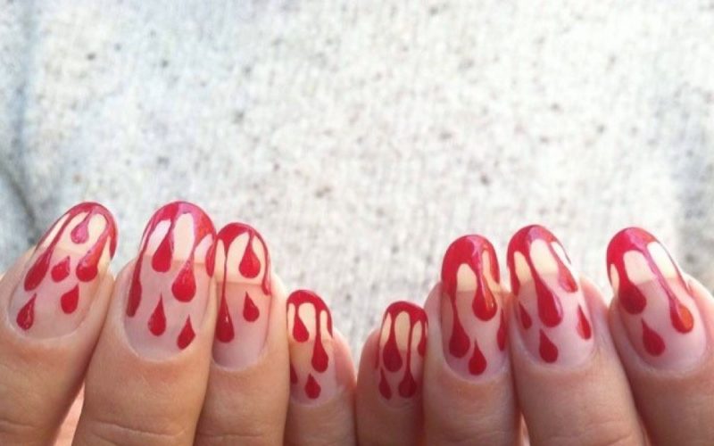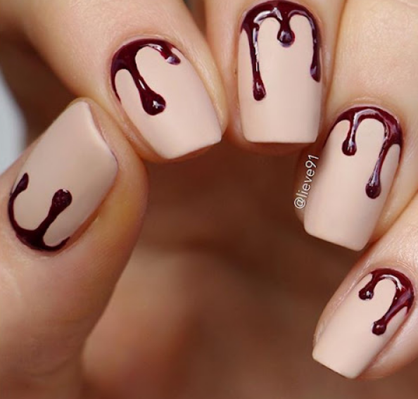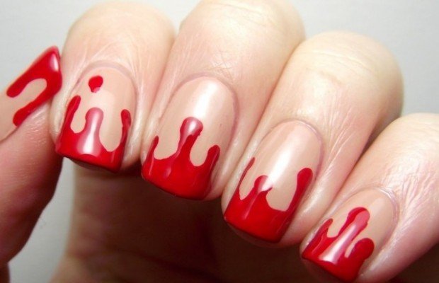Кровь — одна из составляющих мрачной атмосферы, ассоциирующейся с Хэллоуином. Красным лаком на ногтях можно изобразить капли, очень натурально выглядящие. Можно поиграть с цветами и нарисовать подтеки золотистым лаком или каким-либо ярким.