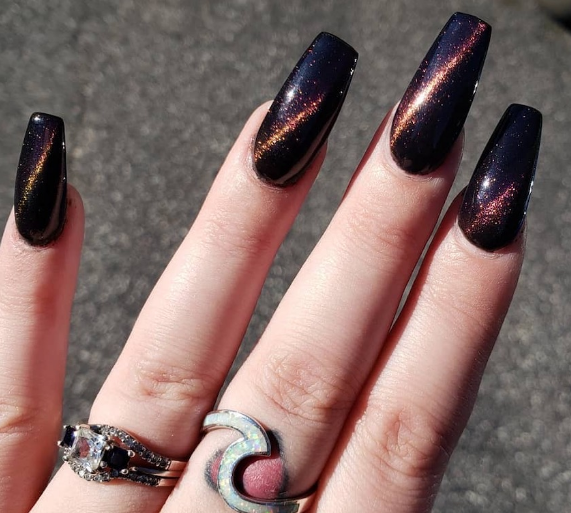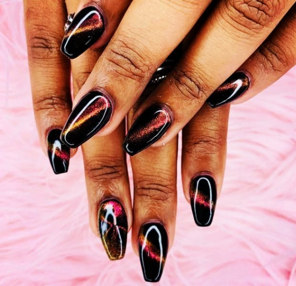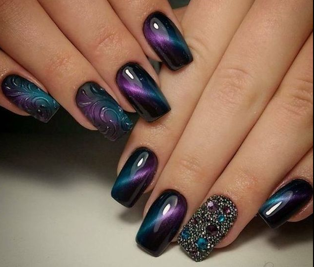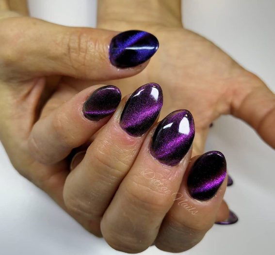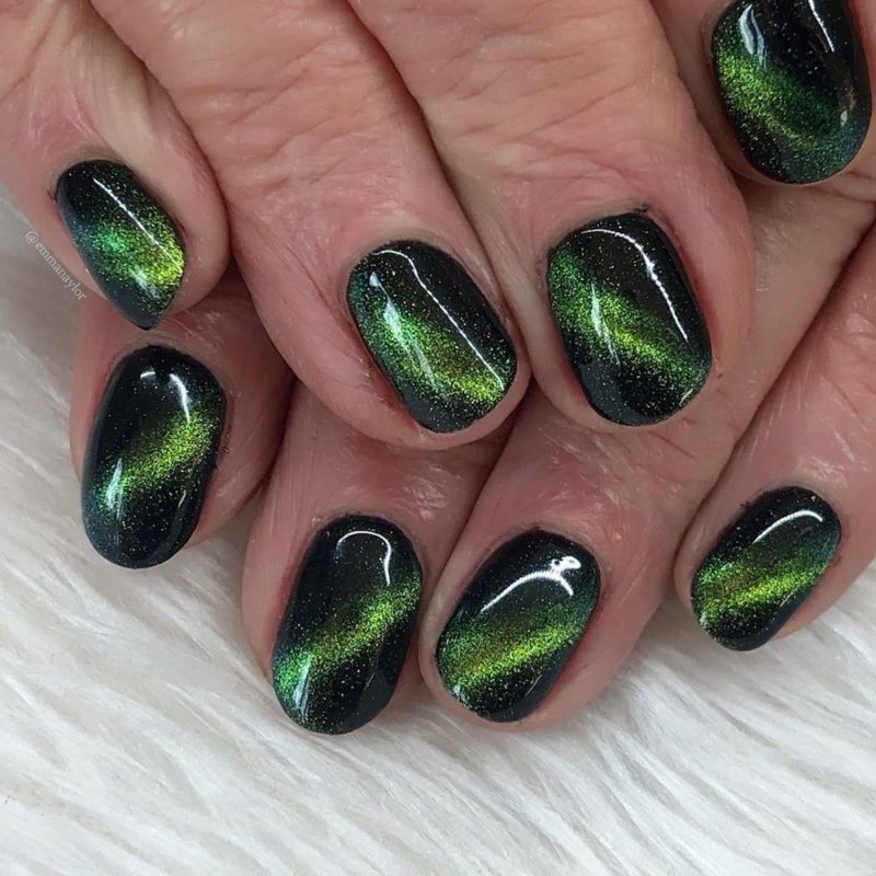 Маникюр в так называемой магнитной технике-специальный магнит формирует специфические узоры сам по себе уже выглядит загадочно и мистически: специально подбирать дизайн под праздник не придется. Какой бы цвет вы ни выбрали, он будет смотреться соответствующе таинственной атмосфере Хэллоуина.