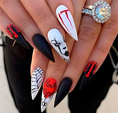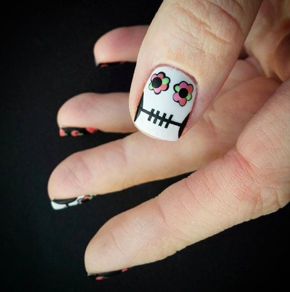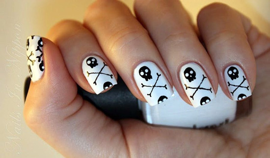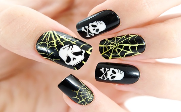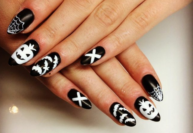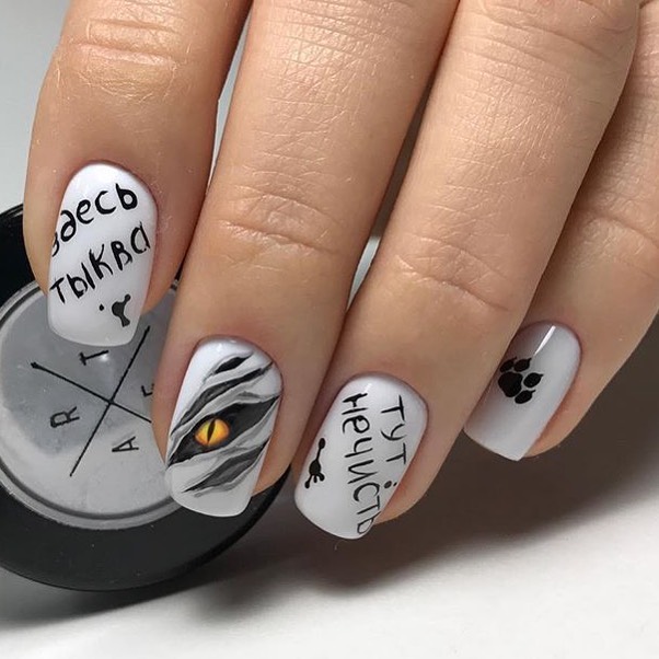 На ногтях можно разместить наводящие ужас надписи или просто название праздника.