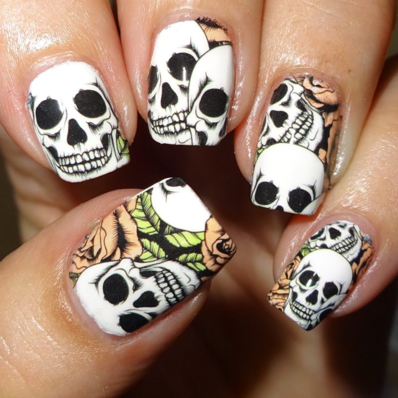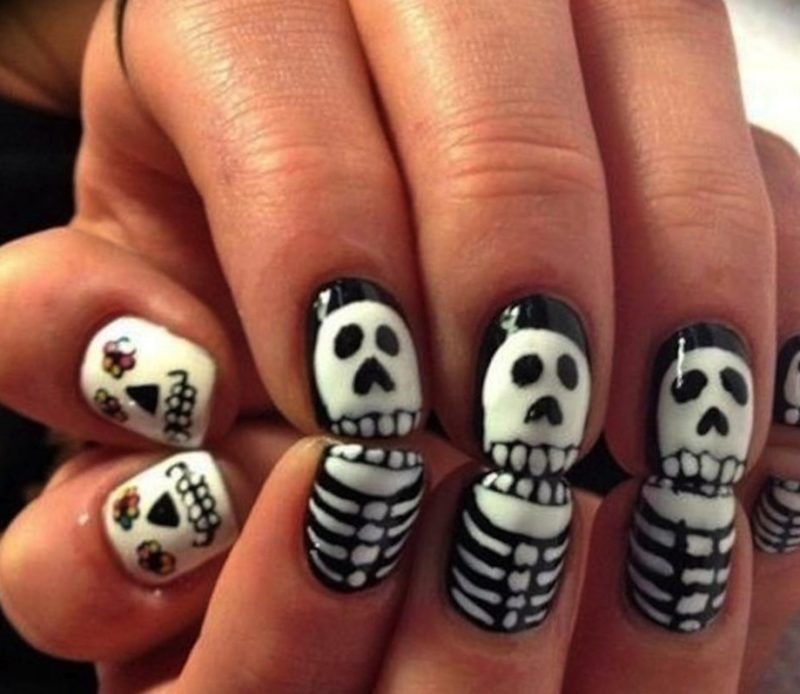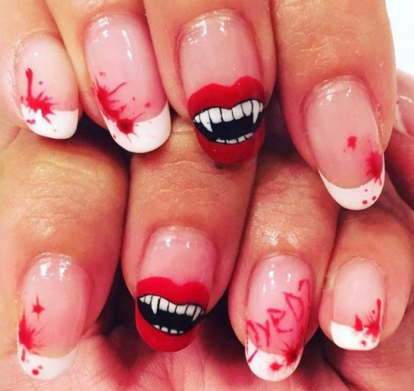 Даже на небольших ногтях можно легко нарисовать любые устрашающие элементы нечисти, спускающейся в эту ночь на нашу землю: вампирские клыки и черепушки будут выглядеть красиво и устрашающе. Здесь открывается большой простор для экстравагантной стилистики рисунков, можно также придумать дизайн с вампирскими клыками.