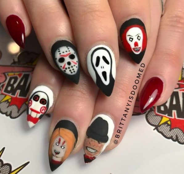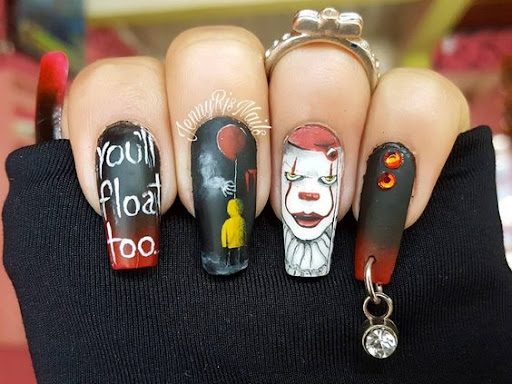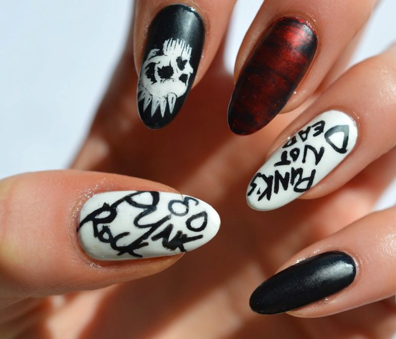 На ногтевых пластинках можно разместить буквы, складывающие в угрожающие послания, которые можно взять из тематических фильмов, готических романов или придумать самому.
