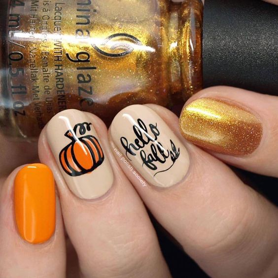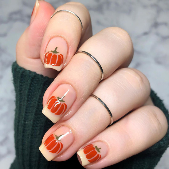 Привычный французский маникюр можно исполнить с использованием тыковки, разместив ее изображение на кончиках ногтей-выглядит мило.