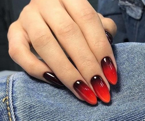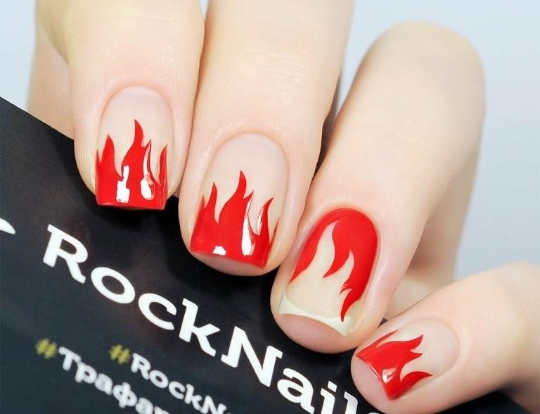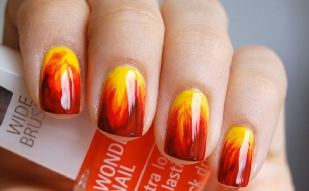 Языки адского пламени будут уместны для создания ногтевого имиджа в канун дня всех Святых, ведь в эту ночь, по поверьям древних, стиралась грань между миром живых и мертвых, и в наш мир приходили разные духи, в том числе и недобрые. Кончики ногтевых пластин можно эффектно украсить огненными язычками. Для оригинальности можно попробовать поэкспериментировать с оттенками.