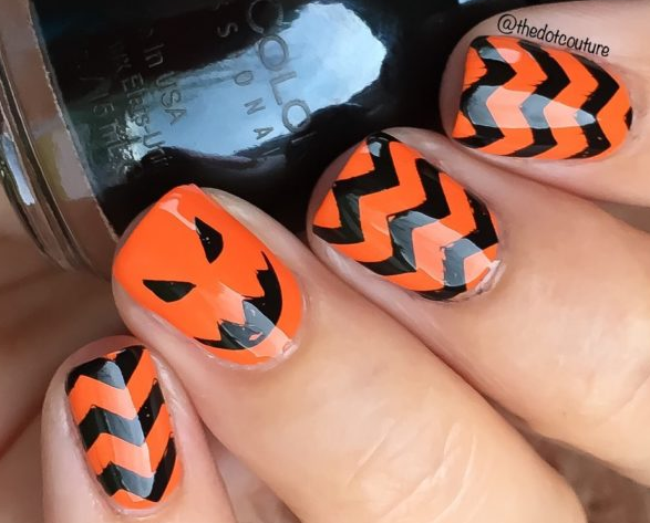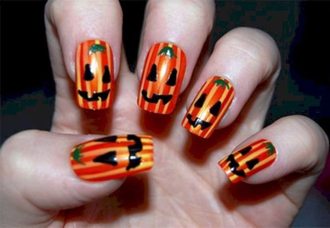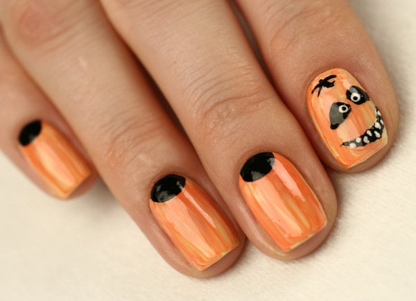 Тыква-традиционный овощ, используемый в праздновании Хэллоуина, из него делают так называемый светильник Джека. Согласно легенде, именно в тыкву положил Джек горящий уголек, чтобы освещать себе путь во время своих скитаний по земле. Вы можете нарисовать миниатюрную тыковку на своих ногтях, которая будет соответствовать духу праздника и поднимать настроение вам и окружающим. Можно поиграться с сочетанием оранжевых и черных цветов.