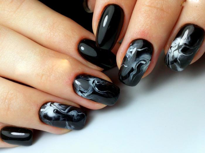 Интересная техника, так же имеющая своеобразные узоры-маникюр под мраморную поверхность позволяет сделать маникюр даже в домашних условиях. Маникюр с водными разводами смотрится впечатляюще и легок в исполнении.