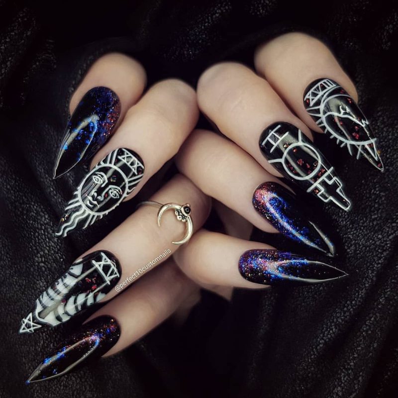 Большая длина ногтей-это полотно, которое предоставляет большой простор для возможностей. Вы можете изобразить на них все, что угодно: от персонажей фильмов и мультсериалов до готических узоров и картинок. Мастеру придется дольше потрудиться над созданием подобного дизайна, но вы будете впечатлены результатом.