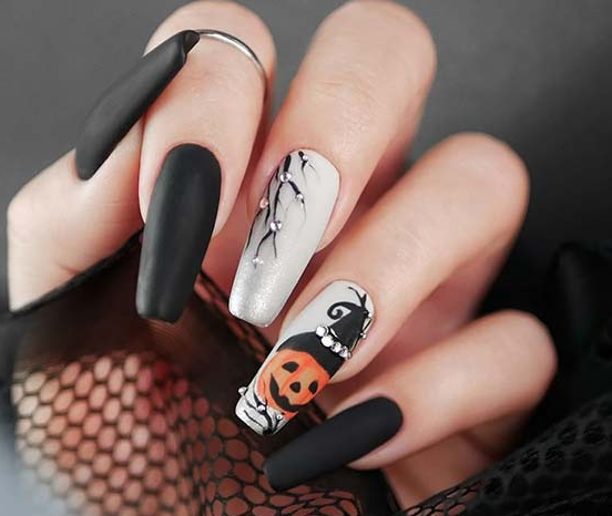С этим классическим символом Хэллоуина можно придумать весьма лаконичные и интересные дизайны-например, поместить аккуратную тыковку в основании ногтевого ложа. Тыквы можно изобразить и в не пугающем, мрачном мотиве, а в шутливом и забавном стиле-достаточно поиграть с разными цветами.