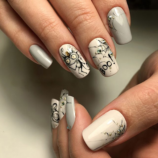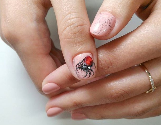 Нюдовые, нейтральные оттенки-отличный чистый холст для воплощения ваших идей. Такие ногти можно украсить различными тематическими наклейками и миниатюрными, аккуратными рисунками. Натюрель не помешает сделать нейл-дизайн в духе самого мрачного праздника года.