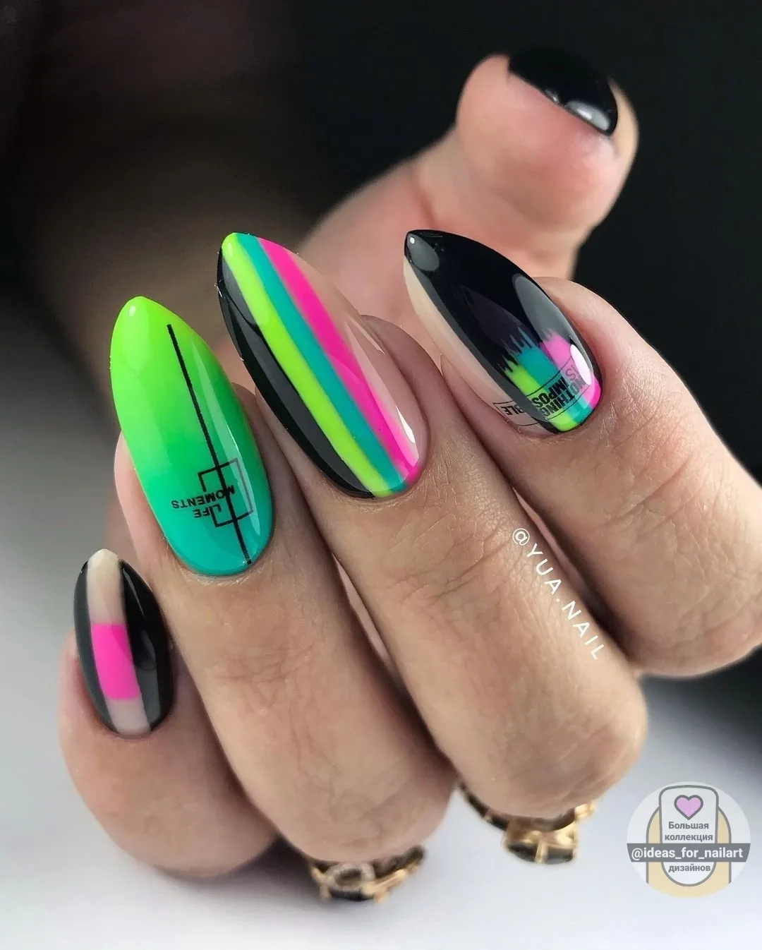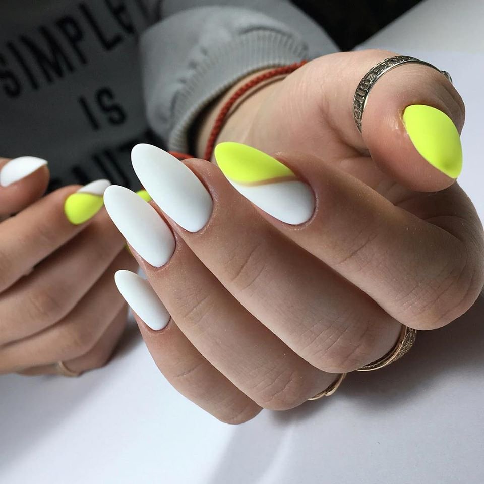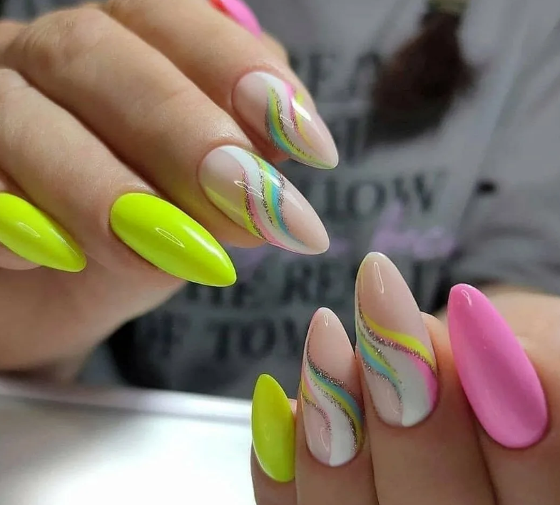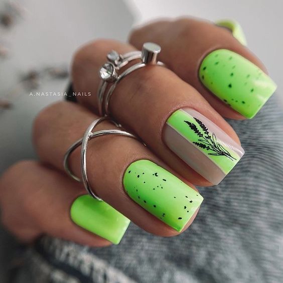 Это, конечно, довольно спорное решение. Но мастера рекомендуют делать маникюр кислотными лаками только летом. Они отлично сочетаются с загорелой кожей. Нейтральные рисунки на кислотной базе добавят очарования и немного смягчат маникюр.