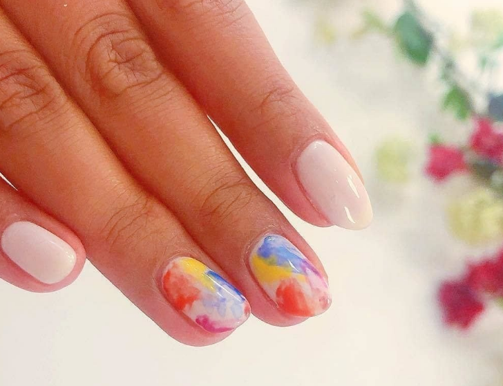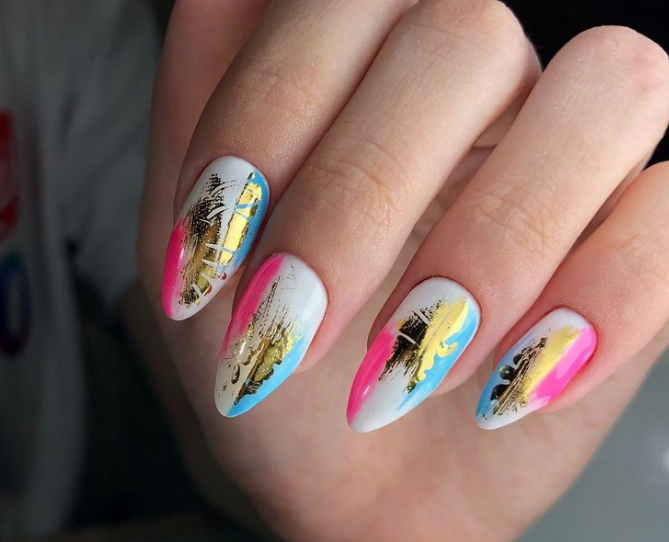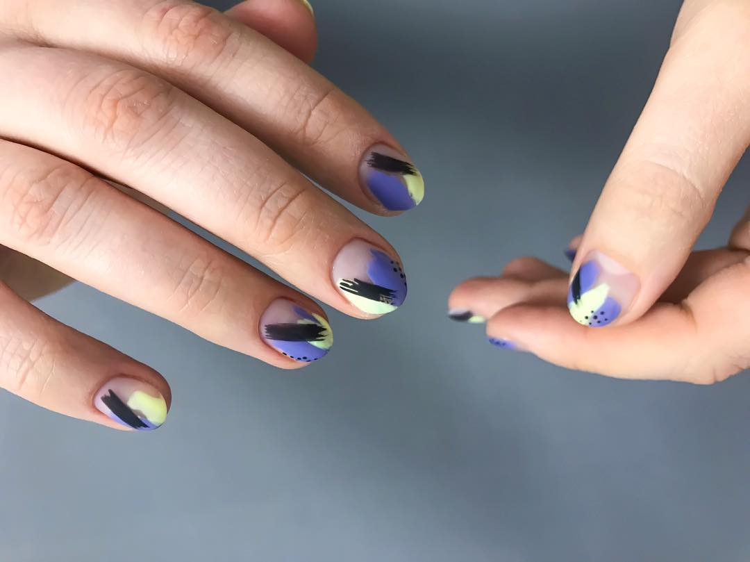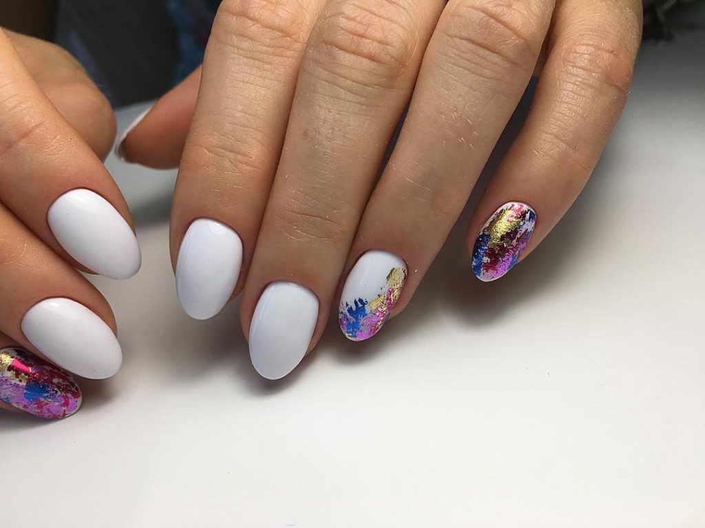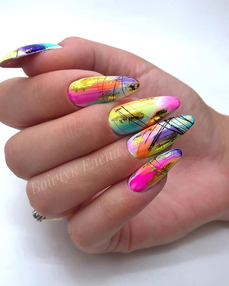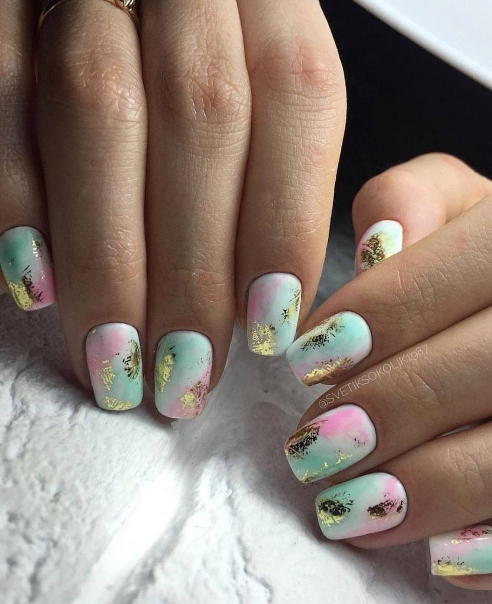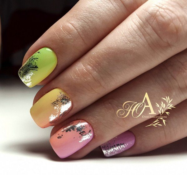 Повторить буйство красок, которое дарит нам природа в июле, можно с помощью маникюра с мазками краски. Они могут быть с эффектом акварели или карандашей. Здесь нет никакой стратегии, просто наносите краски на пластину хаотично. Если какие-то зоны вам не понравятся, можете добавить туда фольги.