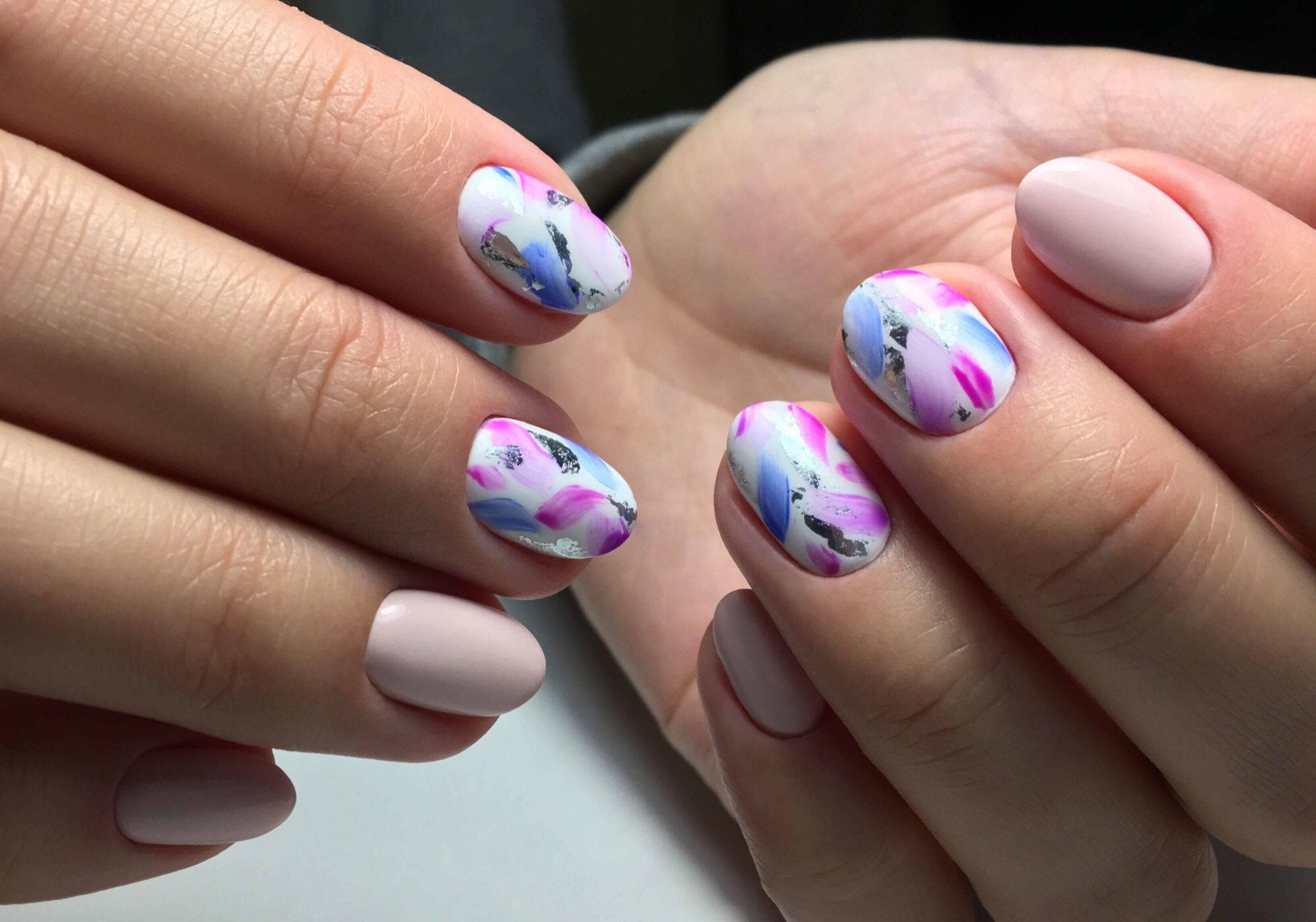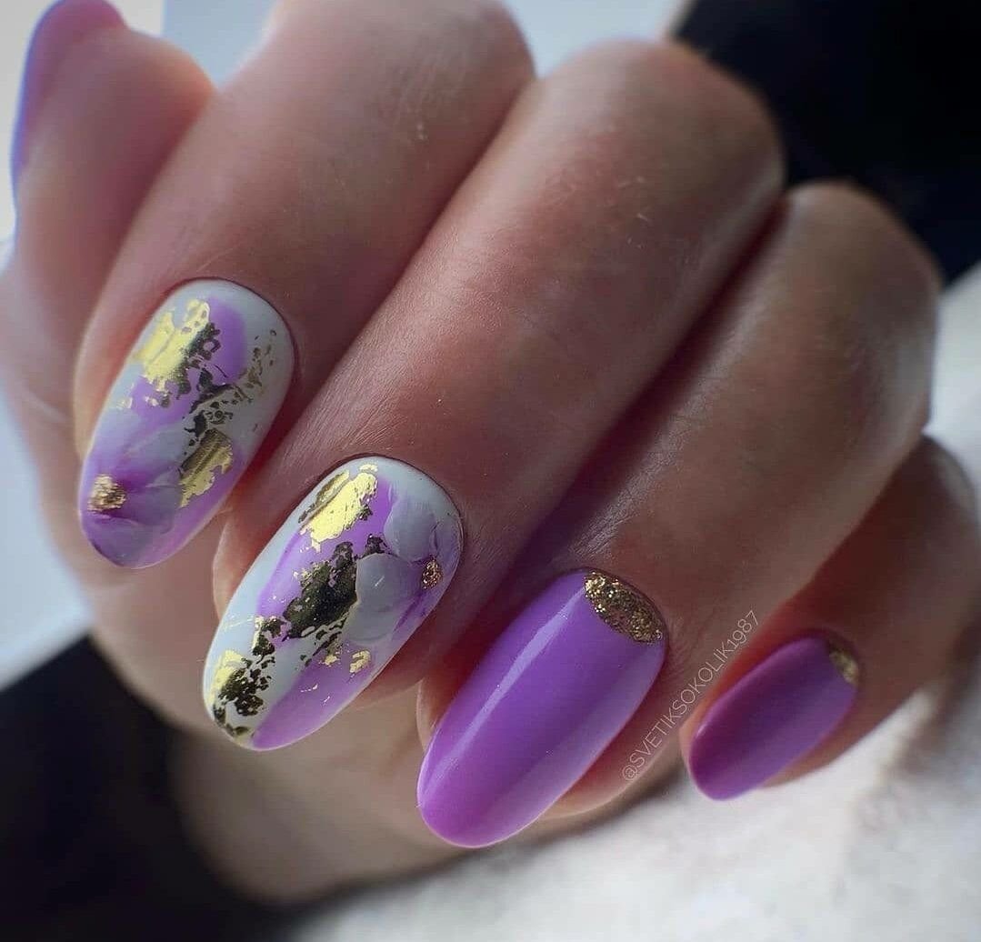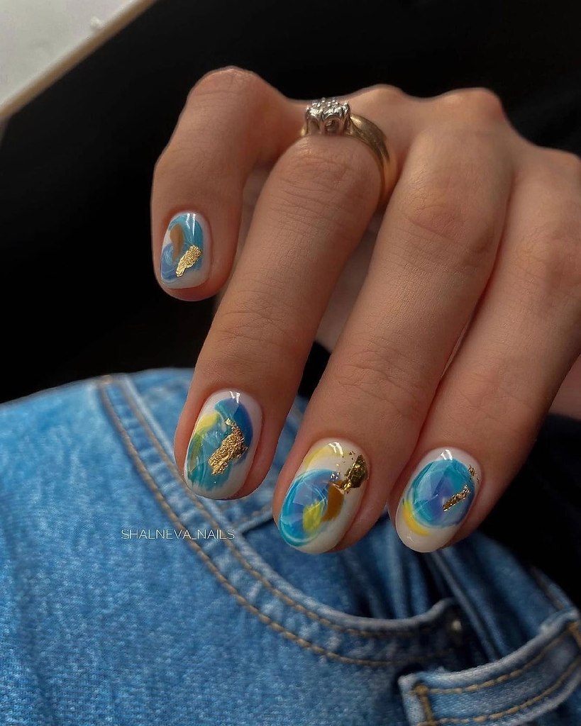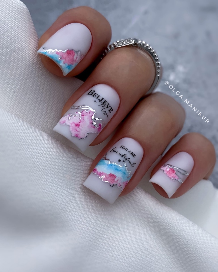 Повторить буйство красок, которое дарит нам природа в июле, можно с помощью маникюра с мазками краски. Они могут быть с эффектом акварели или карандашей. Здесь нет никакой стратегии, просто наносите краски на пластину хаотично. Если какие-то зоны вам не понравятся, можете добавить туда фольги.