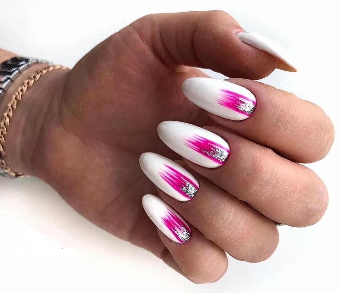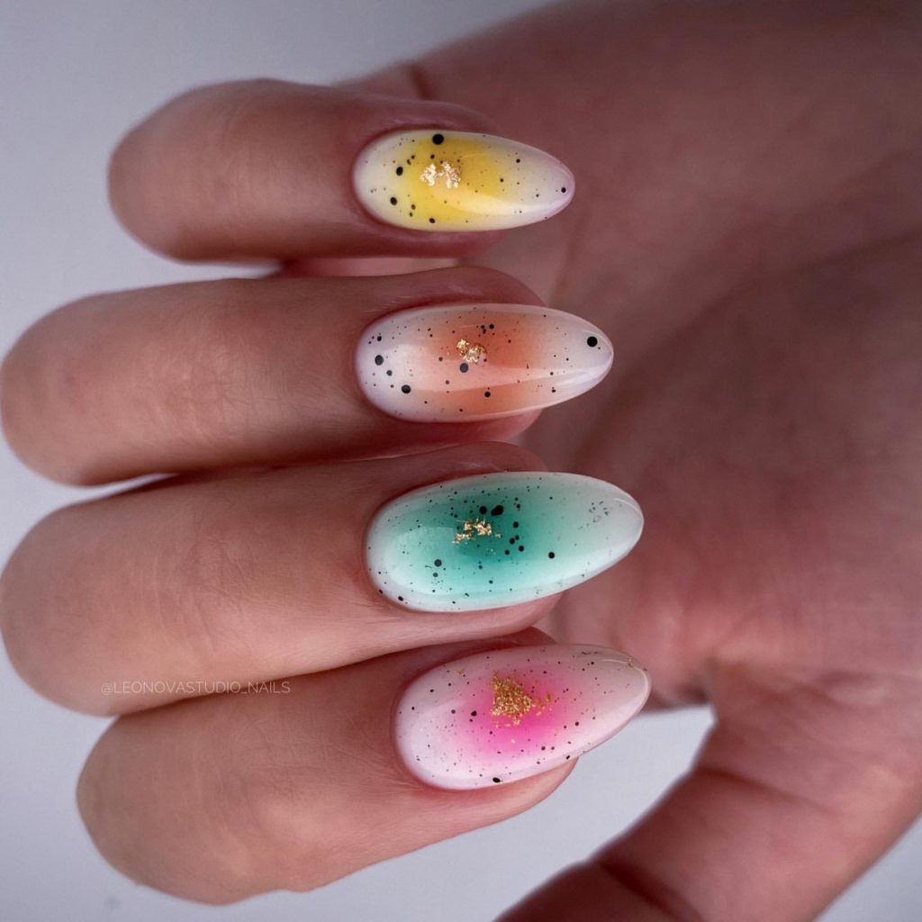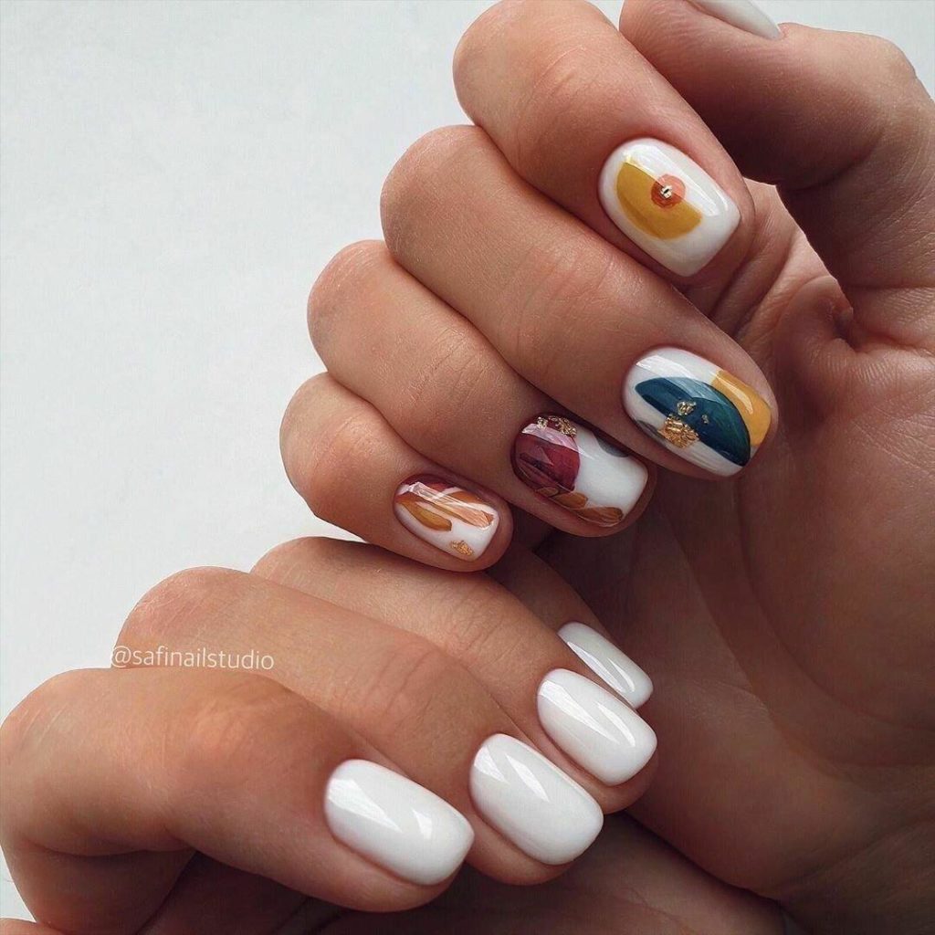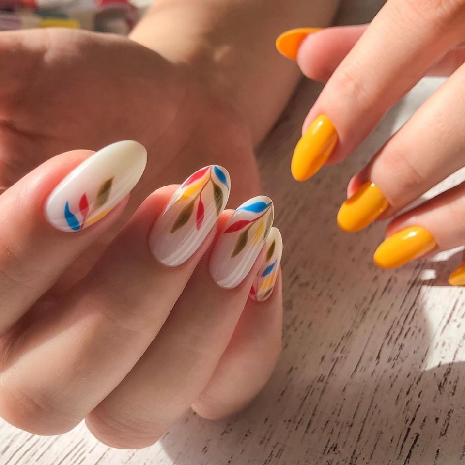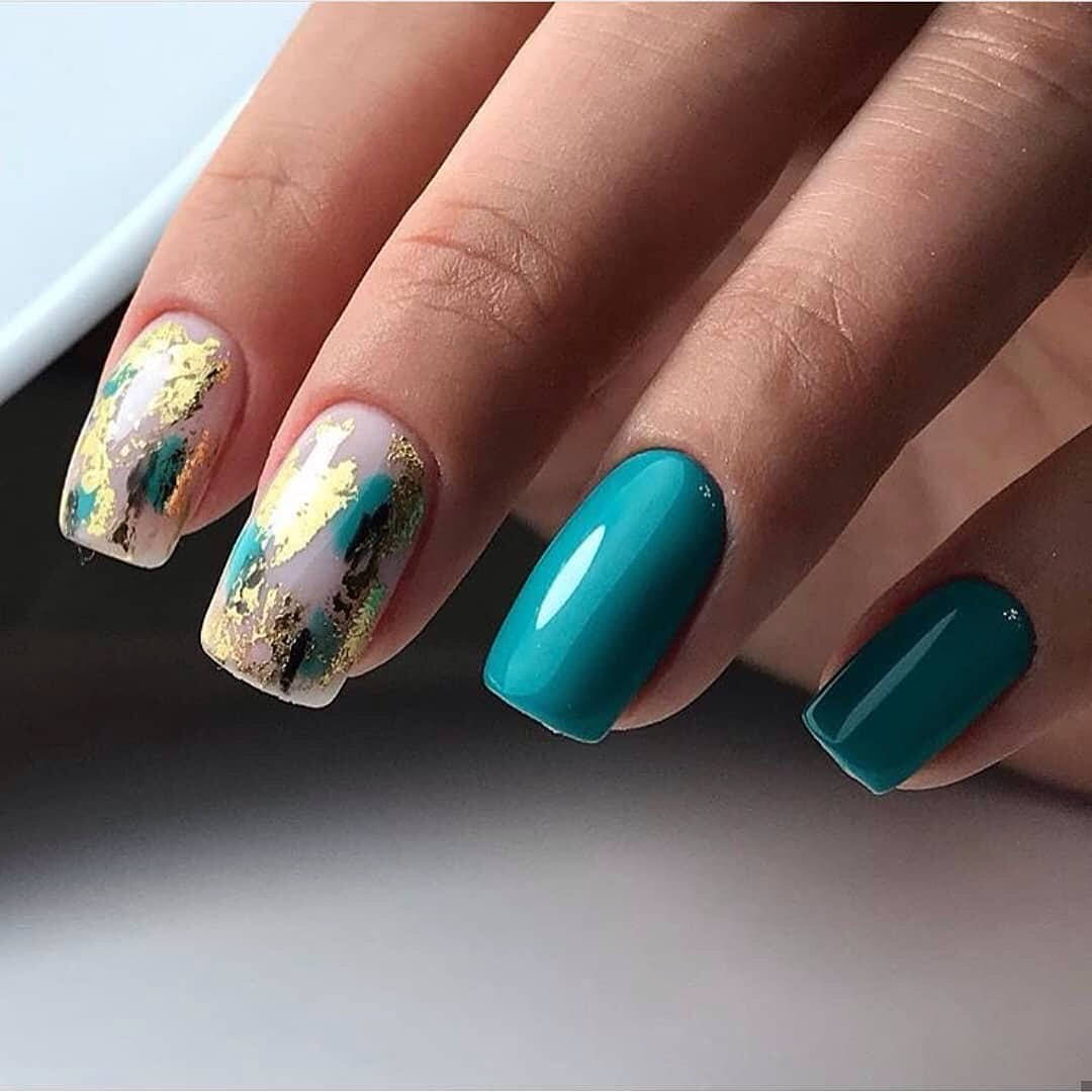 Повторить буйство красок, которое дарит нам природа в июле, можно с помощью маникюра с мазками краски. Они могут быть с эффектом акварели или карандашей. Здесь нет никакой стратегии, просто наносите краски на пластину хаотично. Если какие-то зоны вам не понравятся, можете добавить туда фольги.
