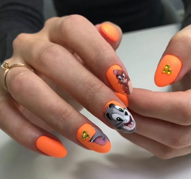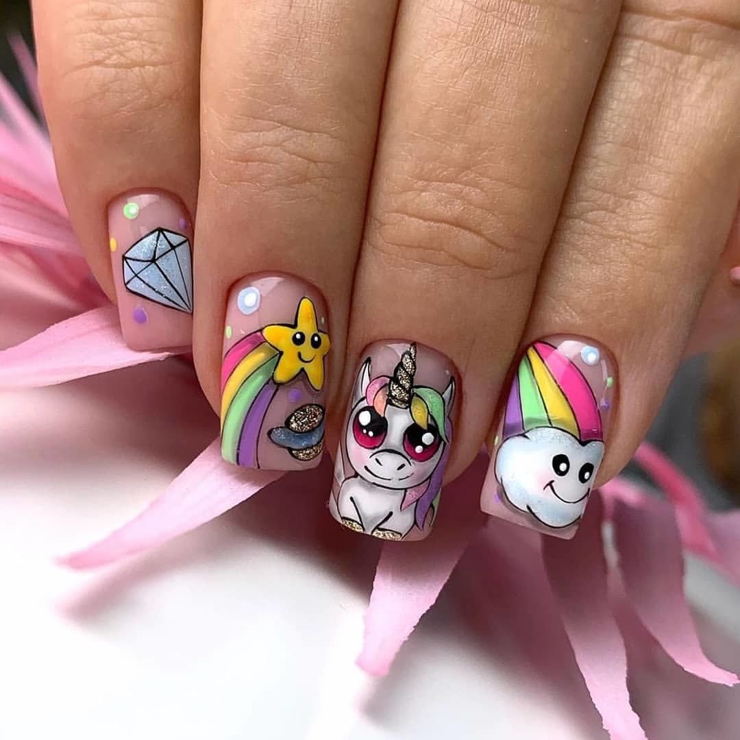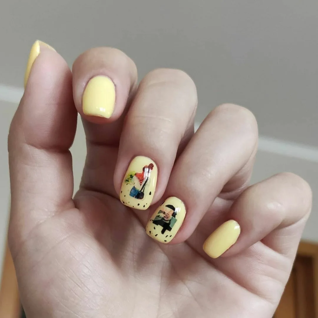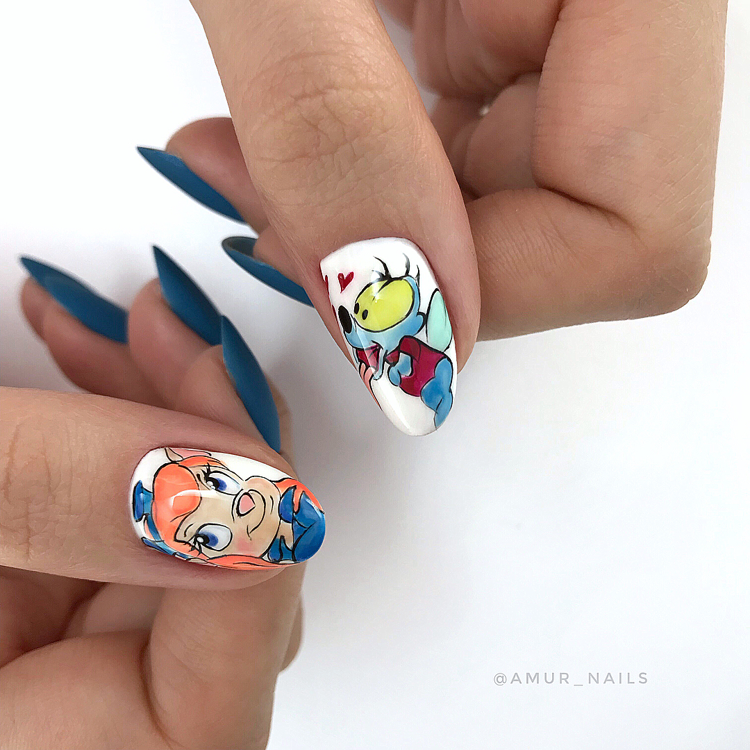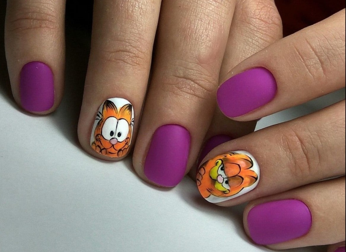 Еще один вариант маникюр в июле для молодых девушек и подростков. Герои мультиков и мемов — фишка этого сезона. Представительницам более старшего возраста тоже не стоит отказываться от такого дизайна. Просто выбирайте менее яркие и более сдержанные рисунки. А для украшения выбирайте всего один ноготь. Поверьте, мультяшный маникюр может быть очень стильным и сдержанным.