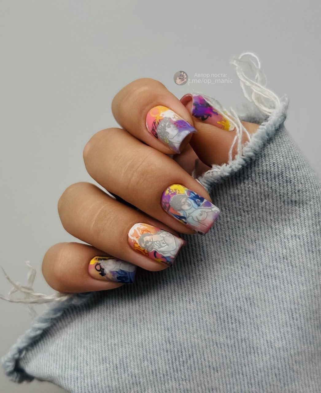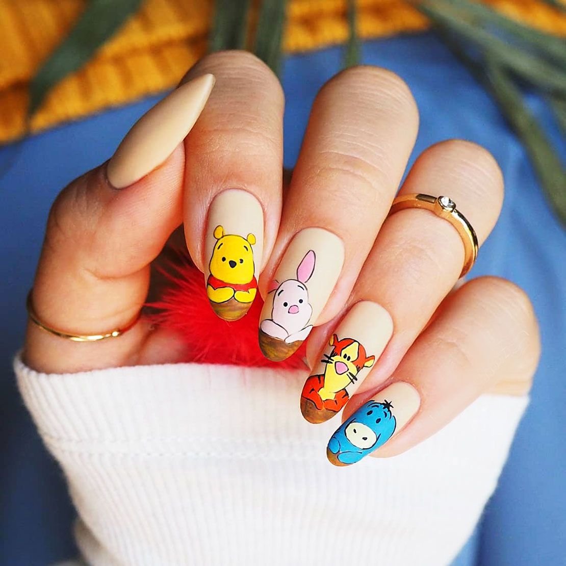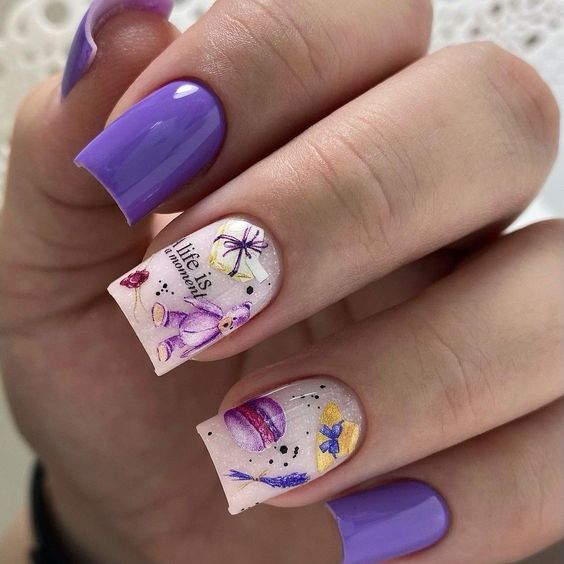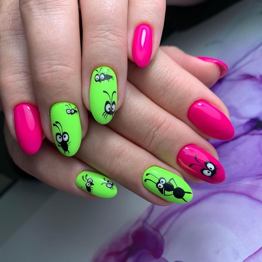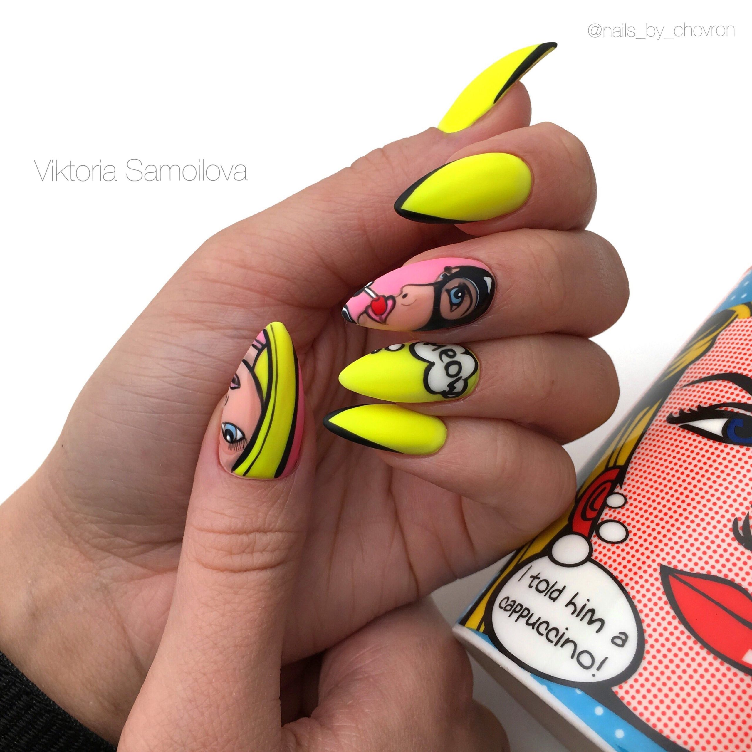 Еще один вариант маникюр в июле для молодых девушек и подростков. Герои мультиков и мемов — фишка этого сезона. Представительницам более старшего возраста тоже не стоит отказываться от такого дизайна. Просто выбирайте менее яркие и более сдержанные рисунки. А для украшения выбирайте всего один ноготь. Поверьте, мультяшный маникюр может быть очень стильным и сдержанным.