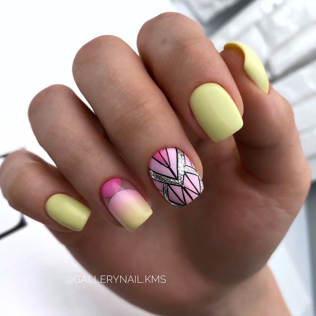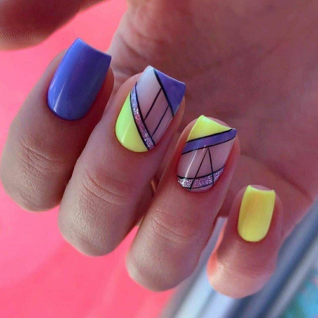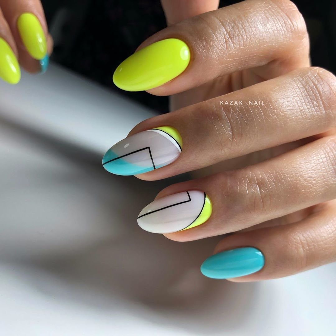 Июль — не повод отказаться от геометрических рисунков в маникюре. Только такая геометрия должна быть яркой и хаотичной, словно вы решили привести в математический порядок то буйство красок, которое дарит нам июльская природа.