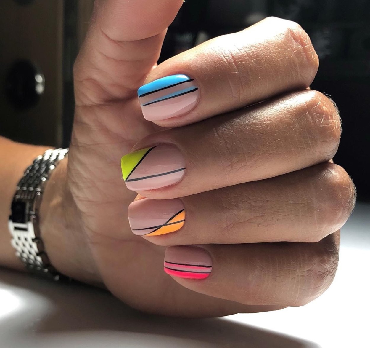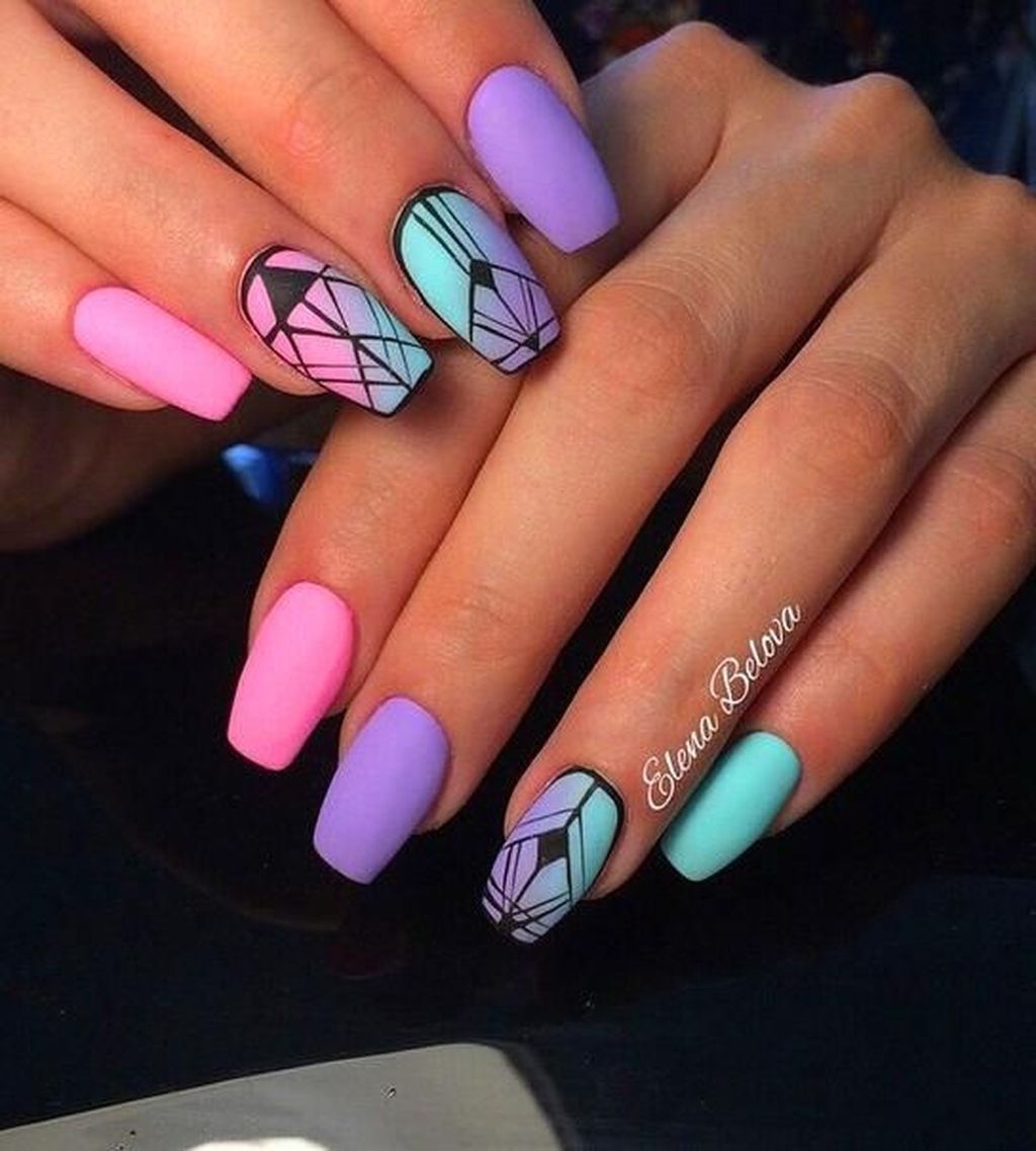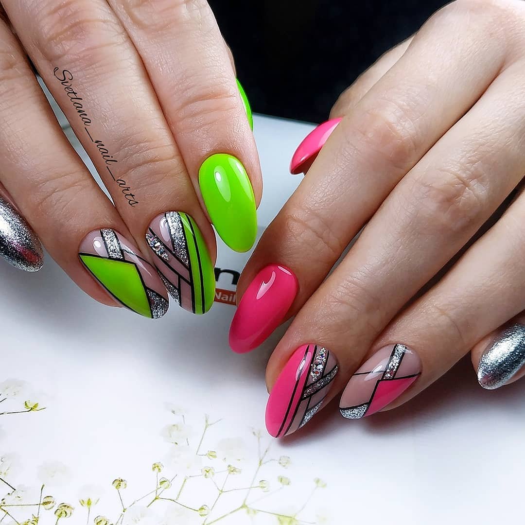 Июль — не повод отказаться от геометрических рисунков в маникюре. Только такая геометрия должна быть яркой и хаотичной, словно вы решили привести в математический порядок то буйство красок, которое дарит нам июльская природа.