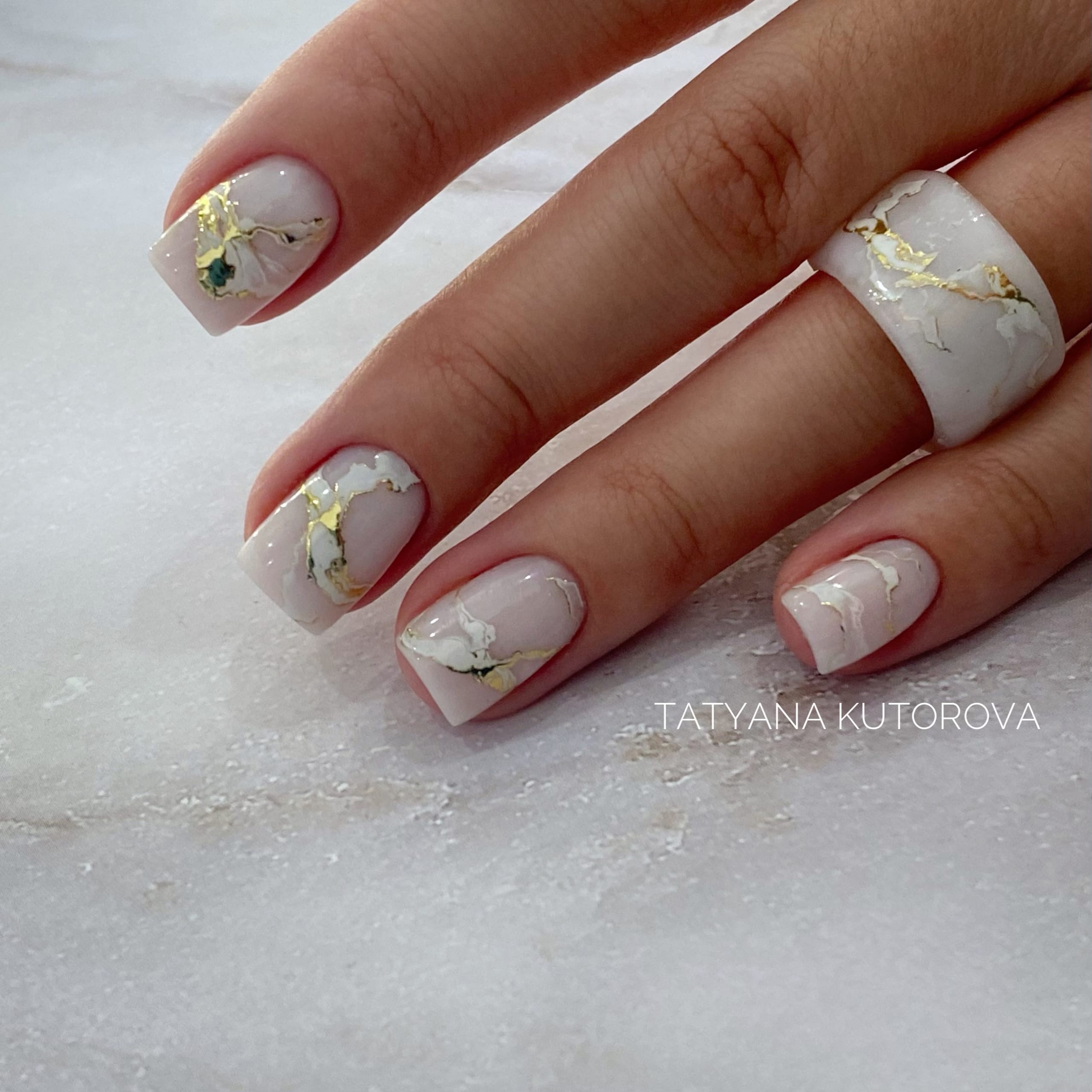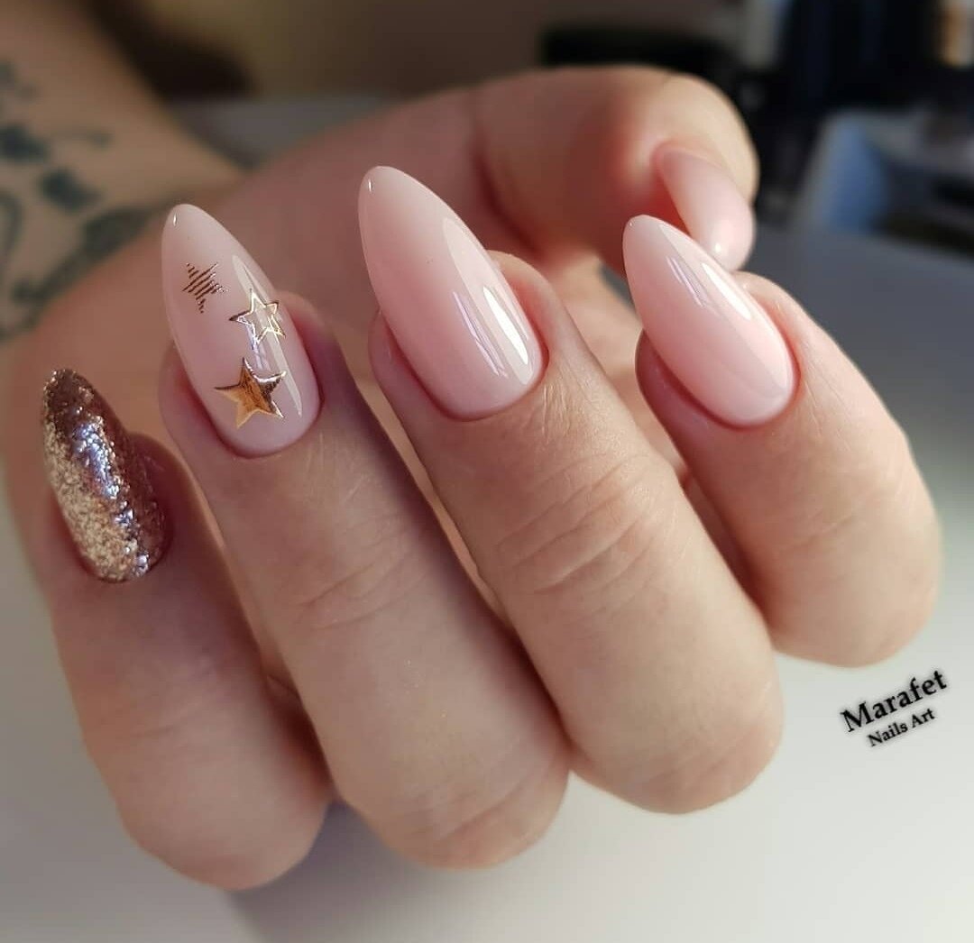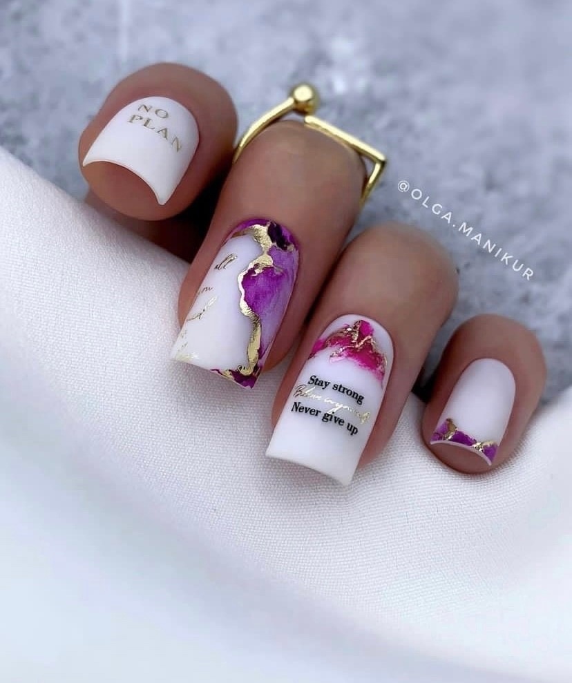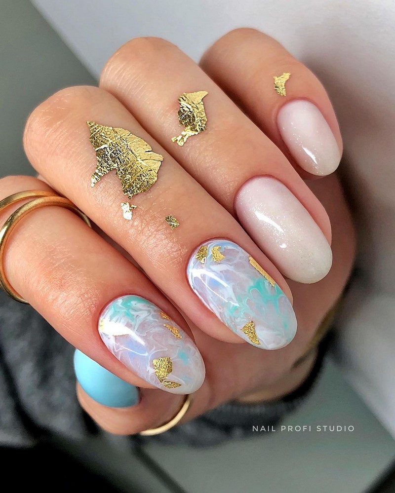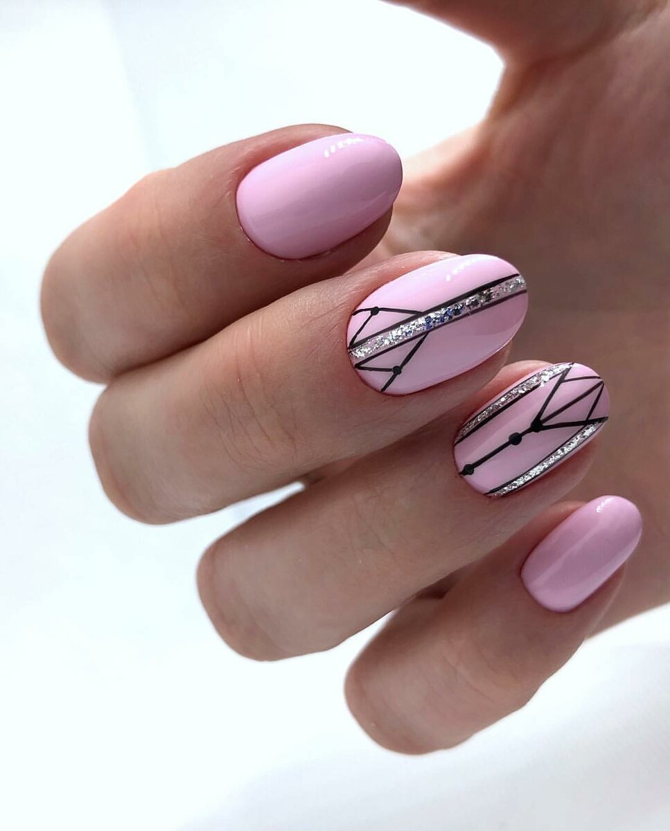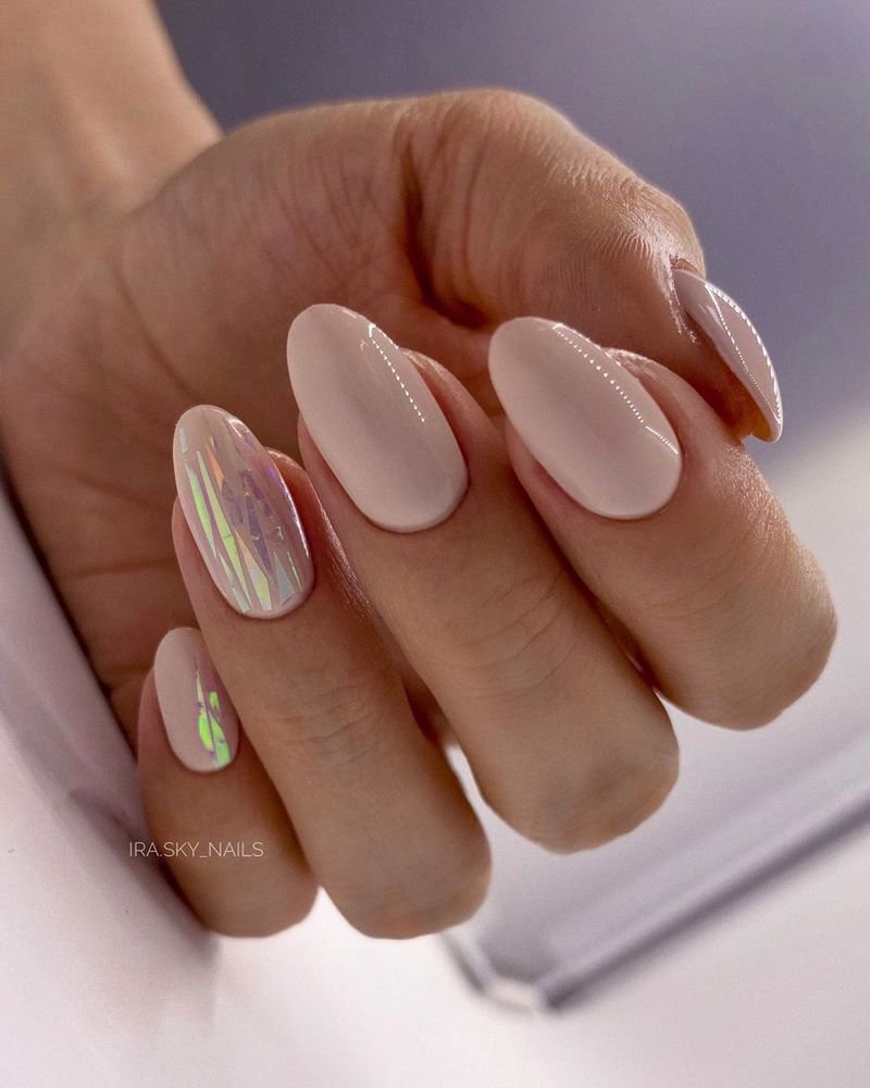 Хороший вариант добавить к маникюру в июле блеска. Но не яркого, а сдержанного и стильного. Отлично смотрится молочная база с мазками фольги и рисунком в технике стемпинг.