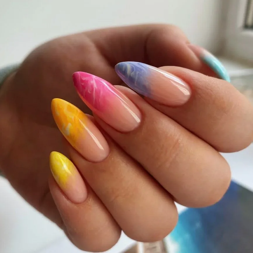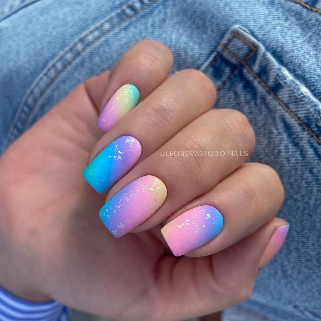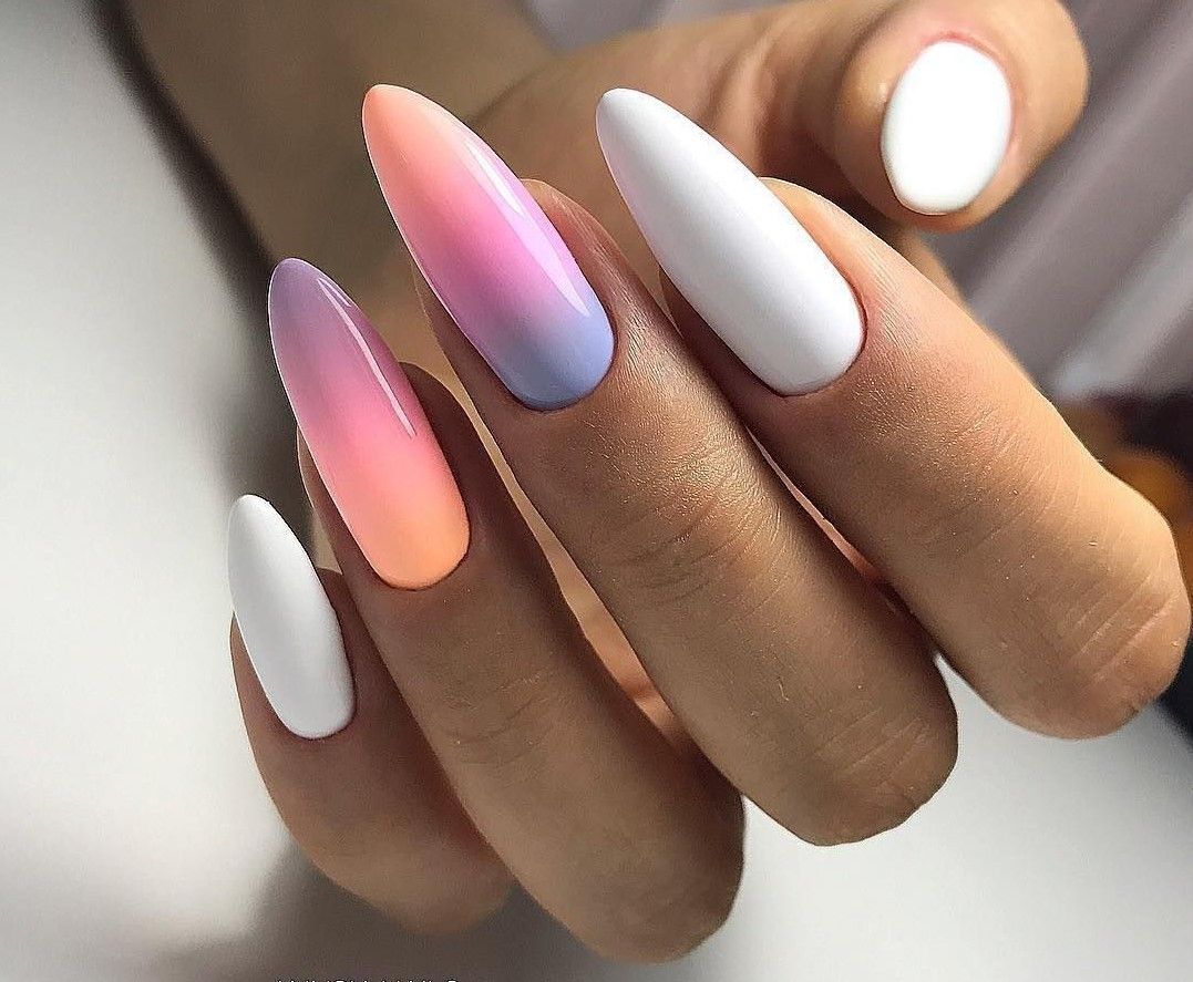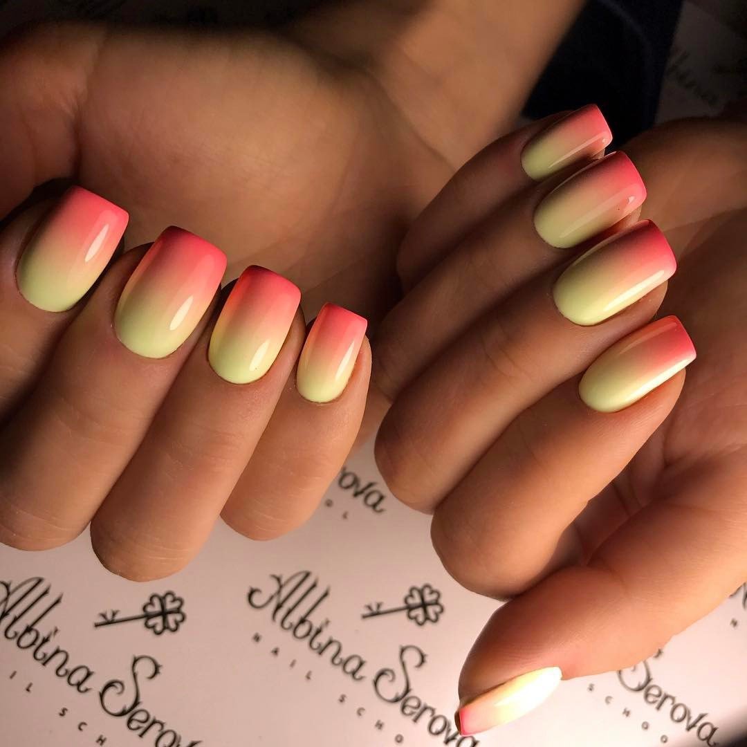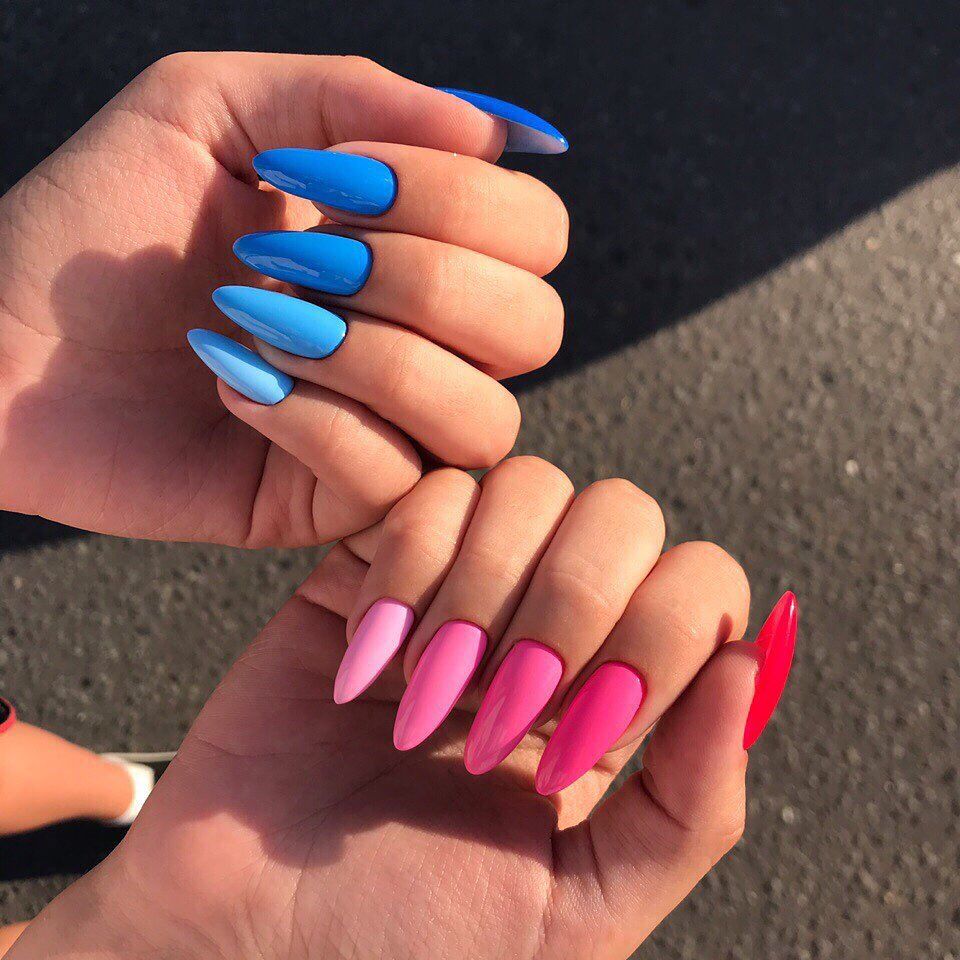 Если вы из тех, кто не может определиться с цветом для июльского маникюра, рассмотрите технику омбре. Это плавные переходы цвета. По желанию ваш мастер может использовать всего два или гораздо больше оттенков. растяжку можно сделать не по каждому ногтю, а «по руке». То есть мастер окрасит каждый ноготь в свой цвет, а все вместе создаст эффект градиента или омбре.