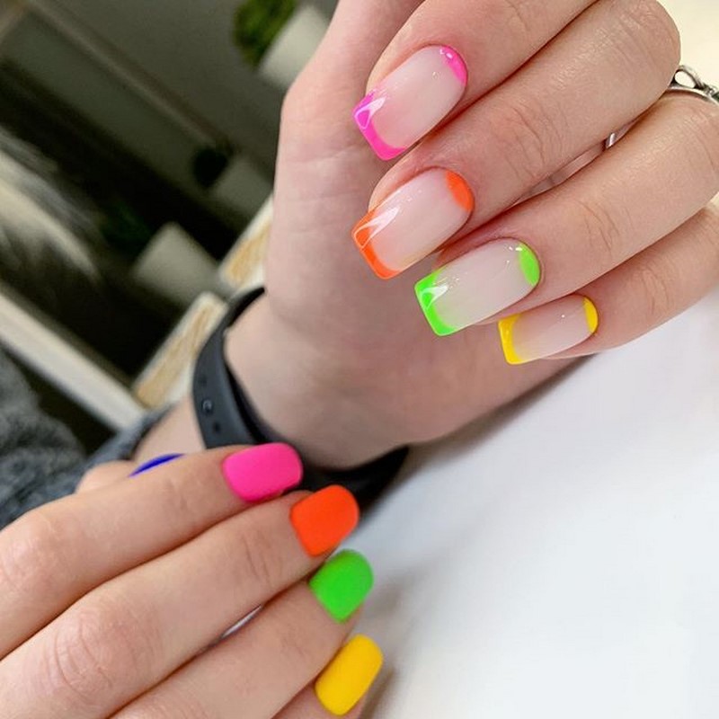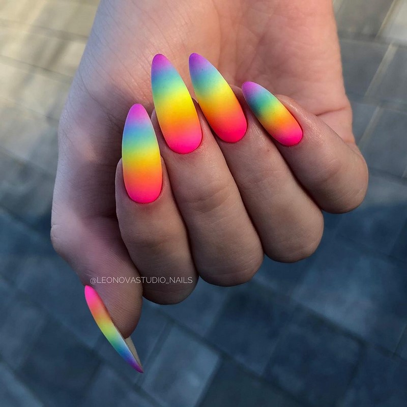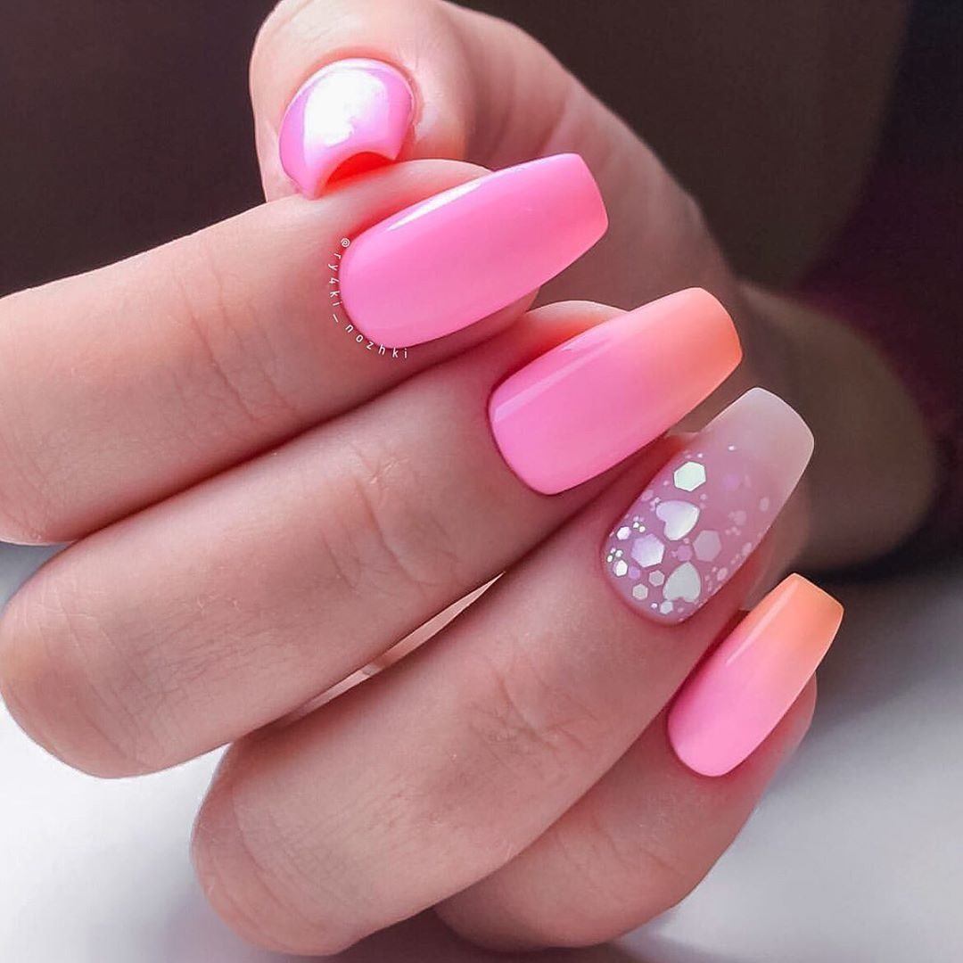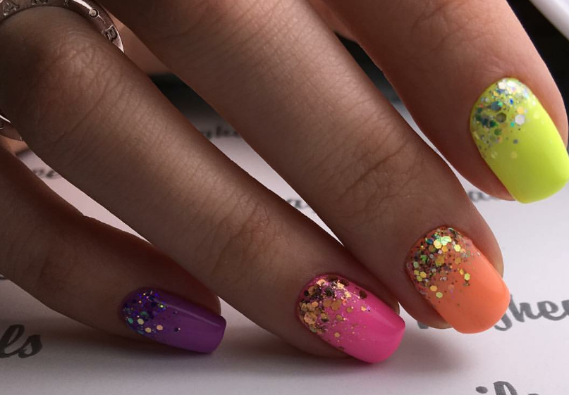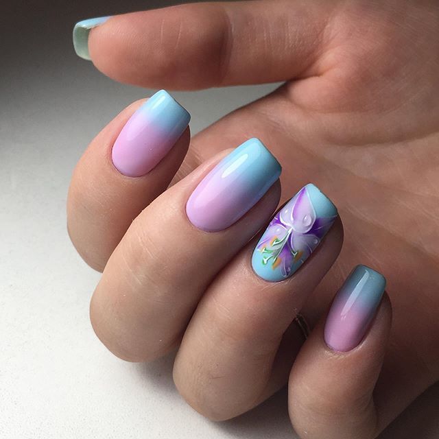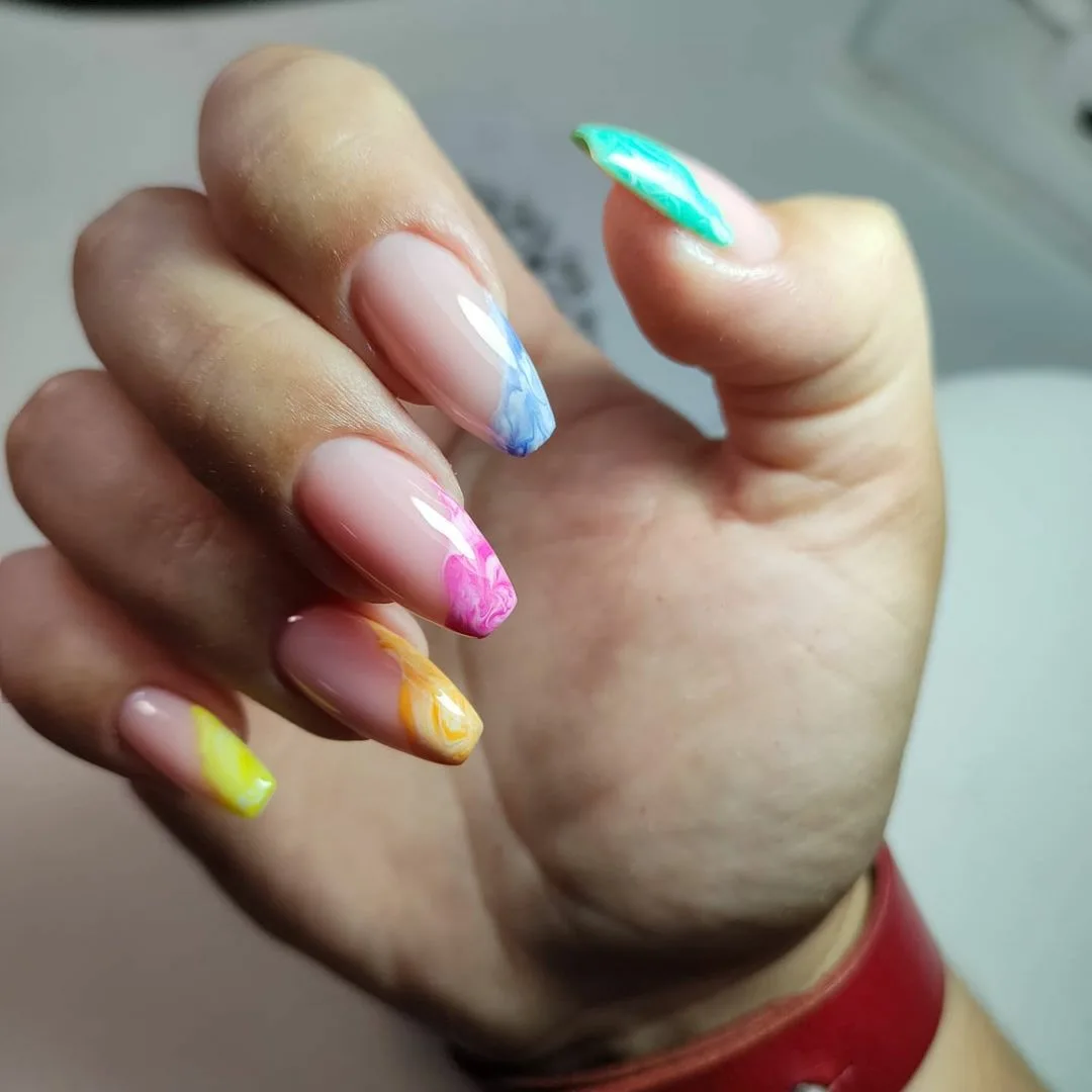 Если вы из тех, кто не может определиться с цветом для июльского маникюра, рассмотрите технику омбре. Это плавные переходы цвета. По желанию ваш мастер может использовать всего два или гораздо больше оттенков. растяжку можно сделать не по каждому ногтю, а «по руке». То есть мастер окрасит каждый ноготь в свой цвет, а все вместе создаст эффект градиента или омбре.